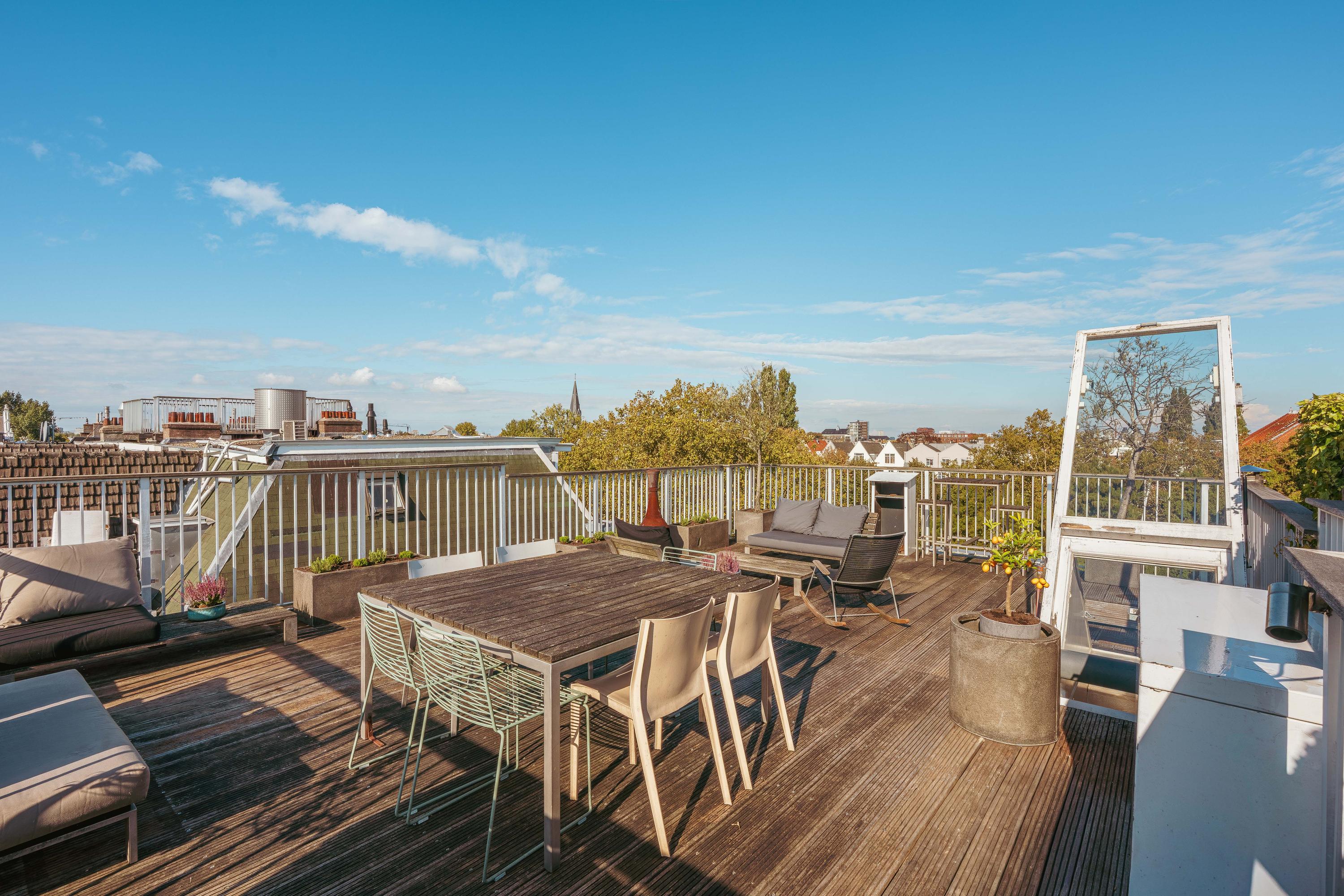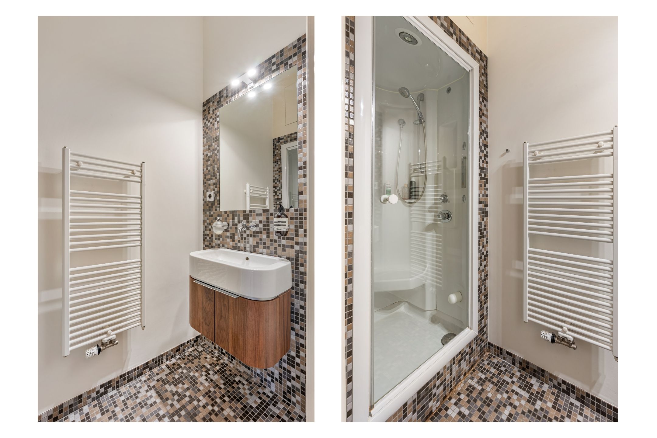 La distribution respire la quiétude—espaces à vivre en suite, portes coulissantes en bois d’origine et cheminées apportent chaleur et élégance architecturale. Au centre, une cuisine semi-ouverte moderne, équipée d’appareils haut de gamme et de sols en marbre, s’ouvre sur les espaces repas et salon. Trois chambres offrent une grande flexibilité, la suite parentale étant en façade, tandis que les pièces arrière, modulables, donnent sur un balcon exposé sud et une terrasse sur le toit de 59 m², idéale pour des moments extérieurs privés et des panoramas urbains. Deux salles de bains, dont une avec cabine hammam, complètent ce sentiment de bien-être.