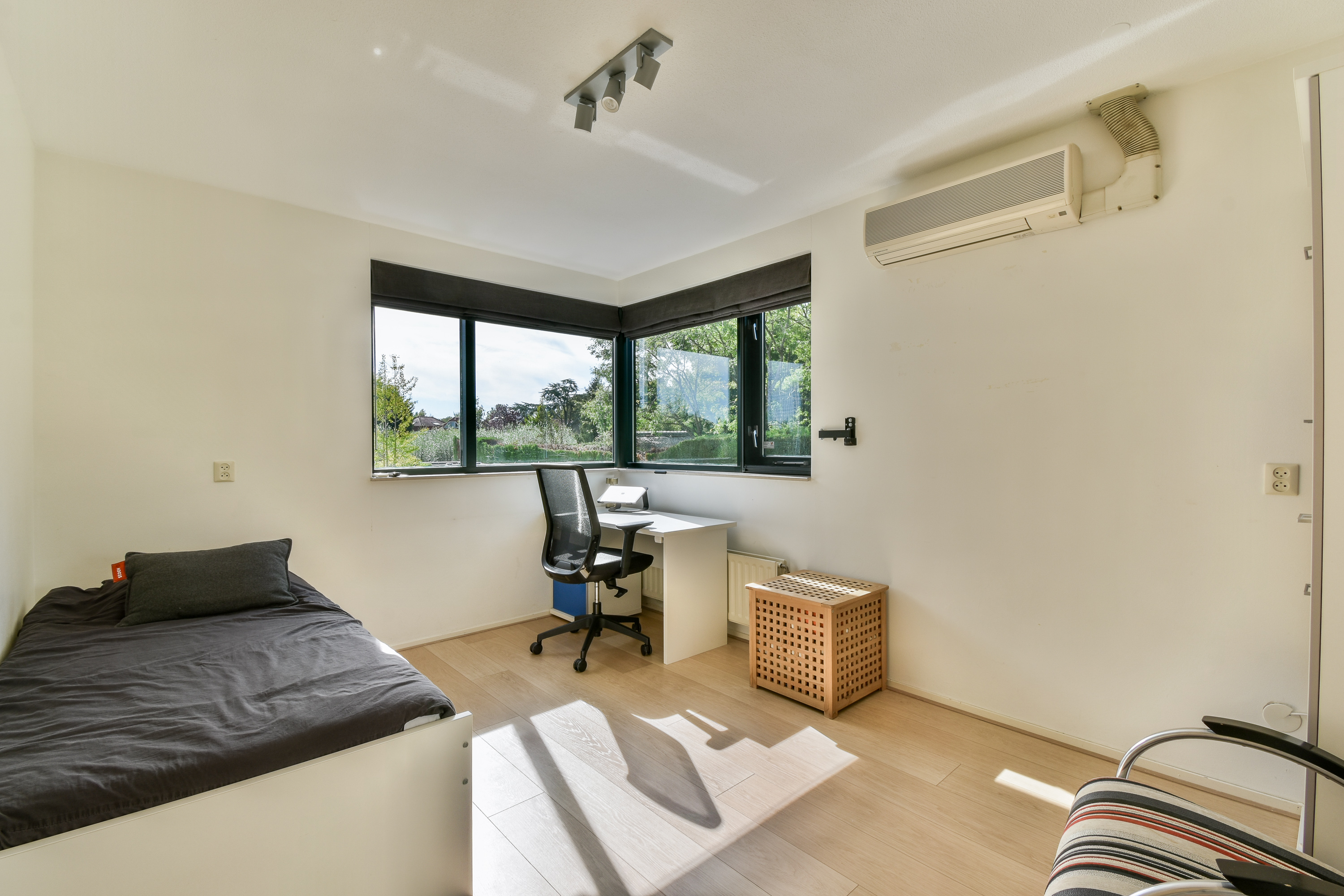 À l’étage, quatre chambres et deux salles de bains offrent des espaces de quiétude, dont une suite parentale avec salle de bains privative et climatisation présente dans toute la maison. Le dernier niveau accueille un studio ou bureau de 30 m² ouvrant sur une terrasse sur le toit de 28 m², garantissant intimité et luminosité naturelle.