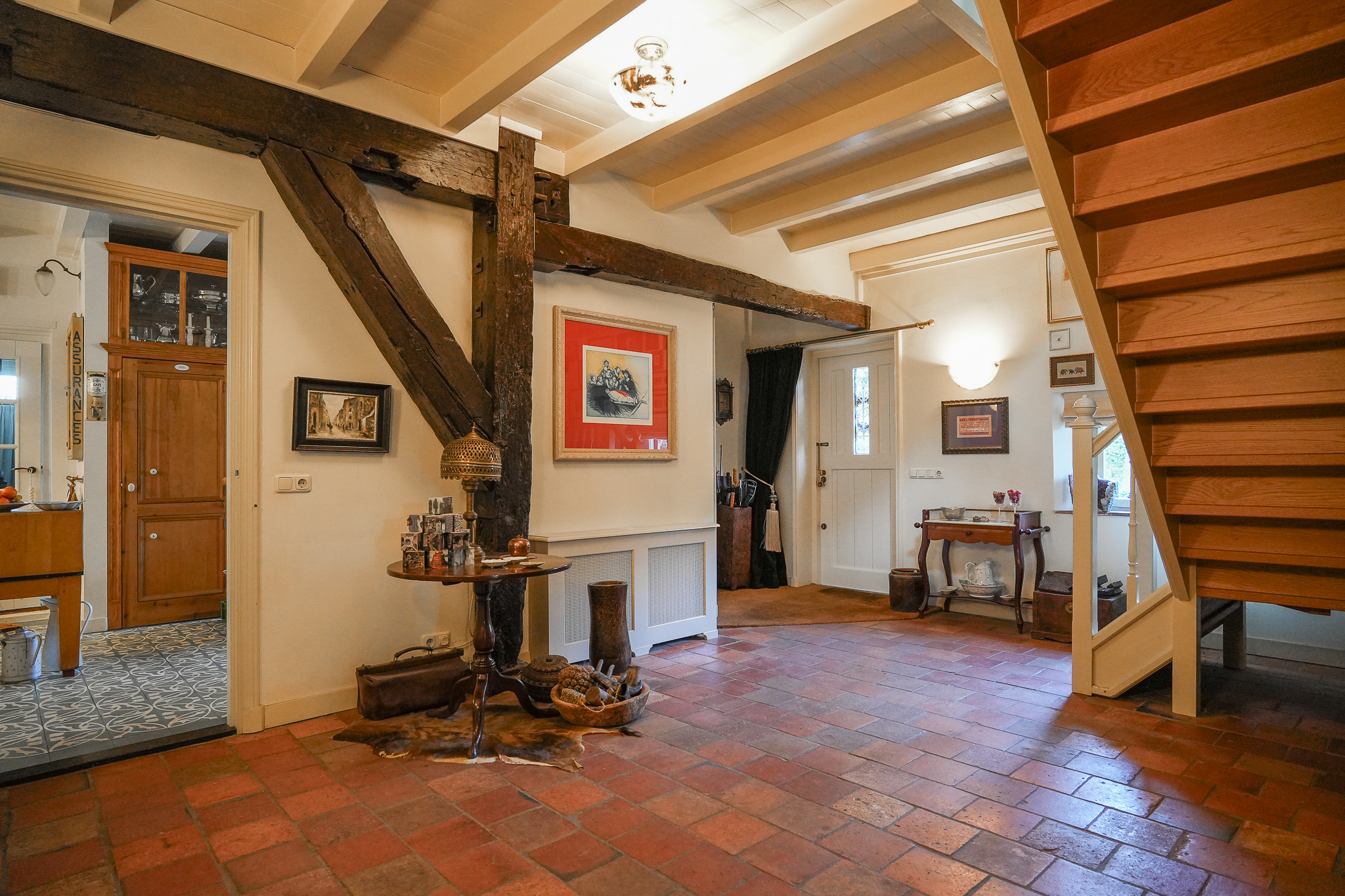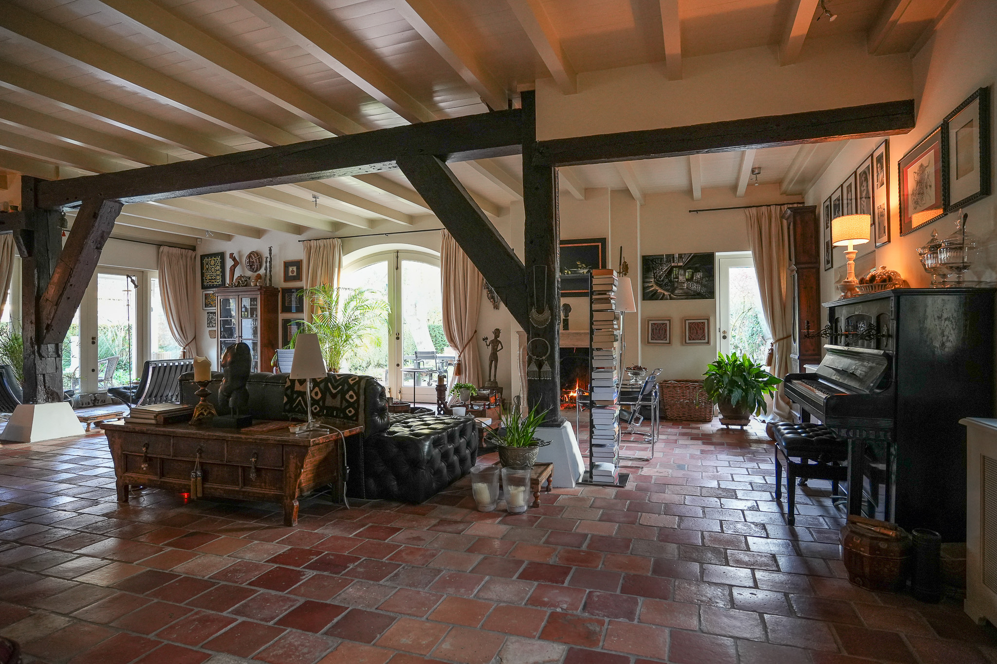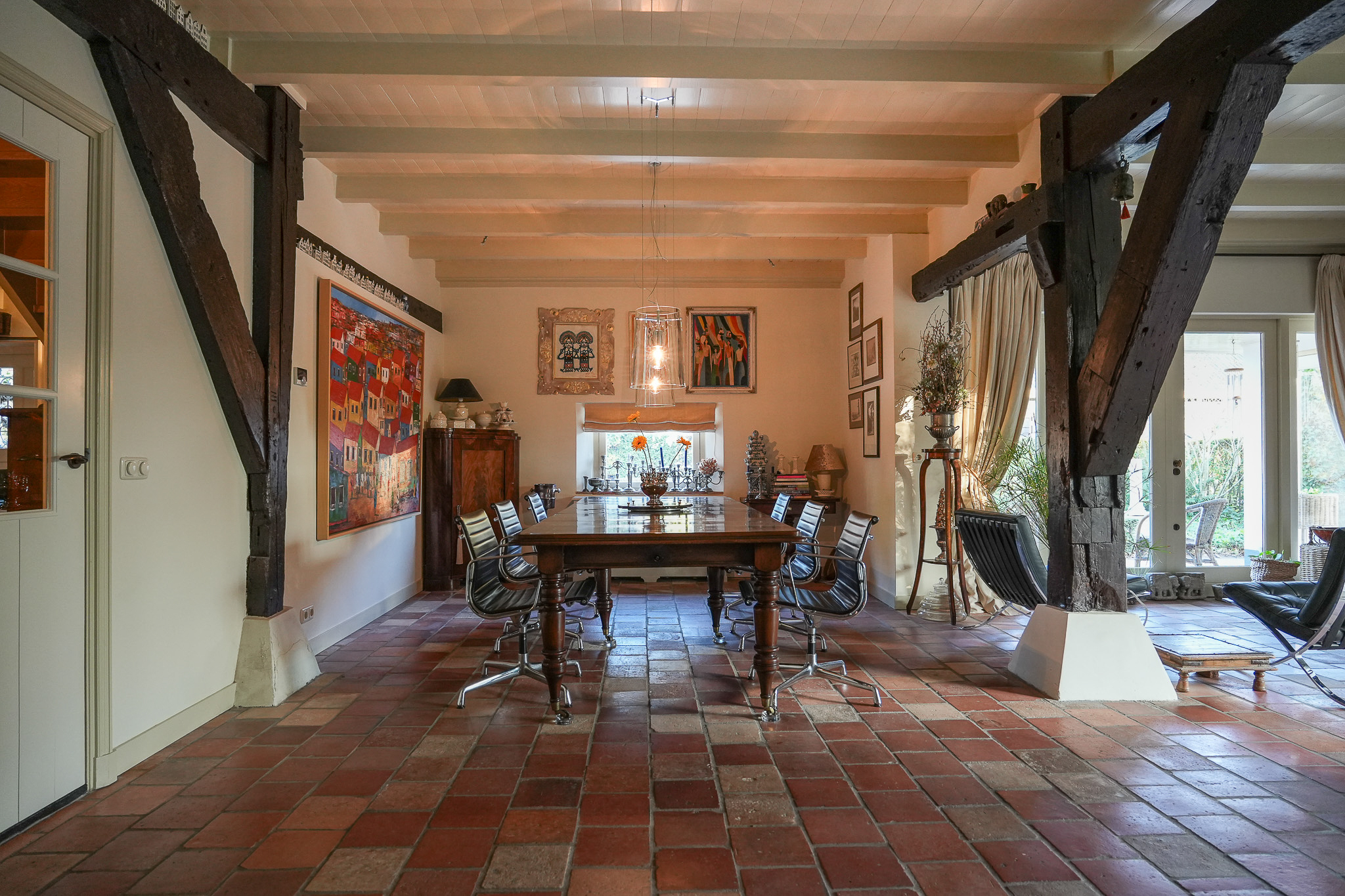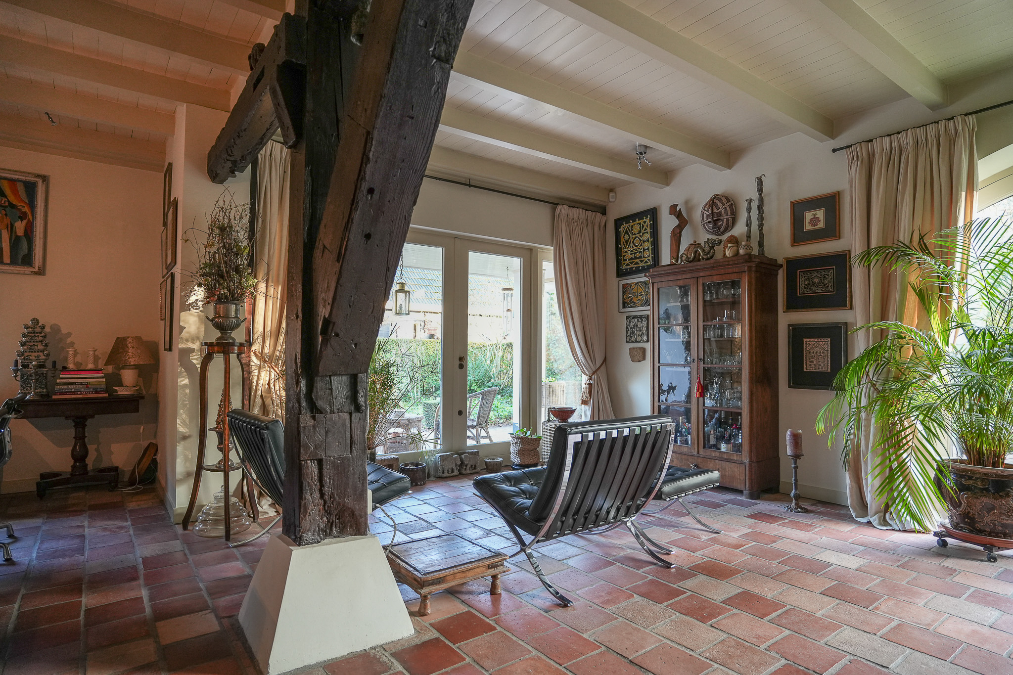 La ferme Hellouw incarne une présence discrète et raffinée à la lisière du village de Betuwe; son caractère de 1917 façonne chaque détail soigneusement pensé. Posée sur un terrain de 4 910 m², la propriété offre 403 m² d’espace de vie, cinq chambres et deux salles de bains. Volumes généreux et éléments d’époque rythment les intérieurs, où cheminées en grès et poutres en bois confèrent impérissable chaleur et gravité aux pièces à vivre. Le rez-de-chaussée accueille un vaste salon ouvert sur le jardin, dans l’ancienne grange, une cuisine champêtre aux carreaux anciens, une cave à vin, et un ensemble de pièces de plain-pied : chambre avec cheminée, dressing et bureau donnant tous sur les jardins privés.
