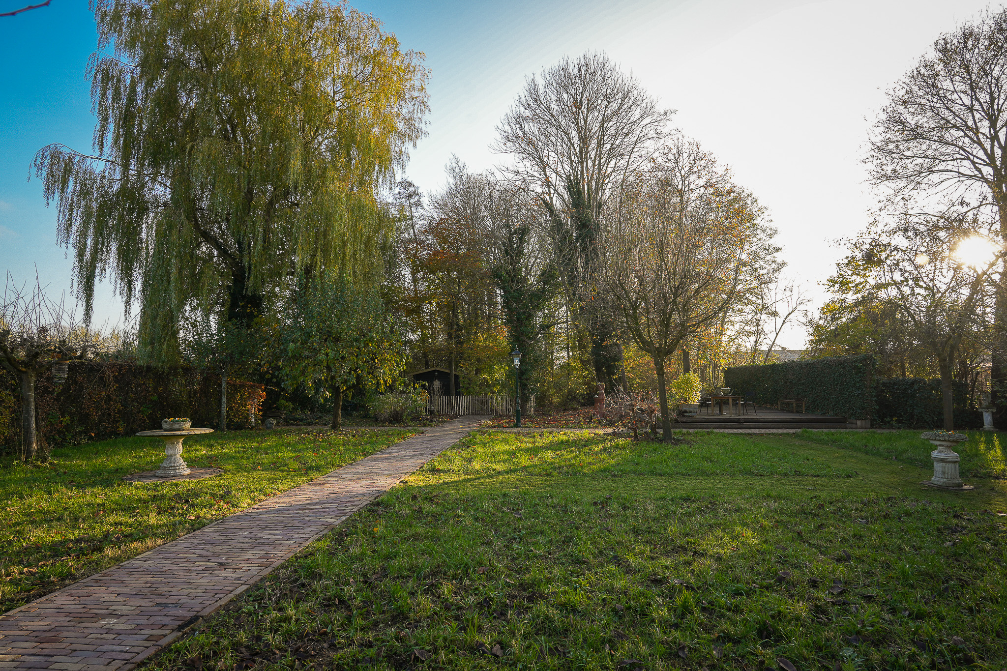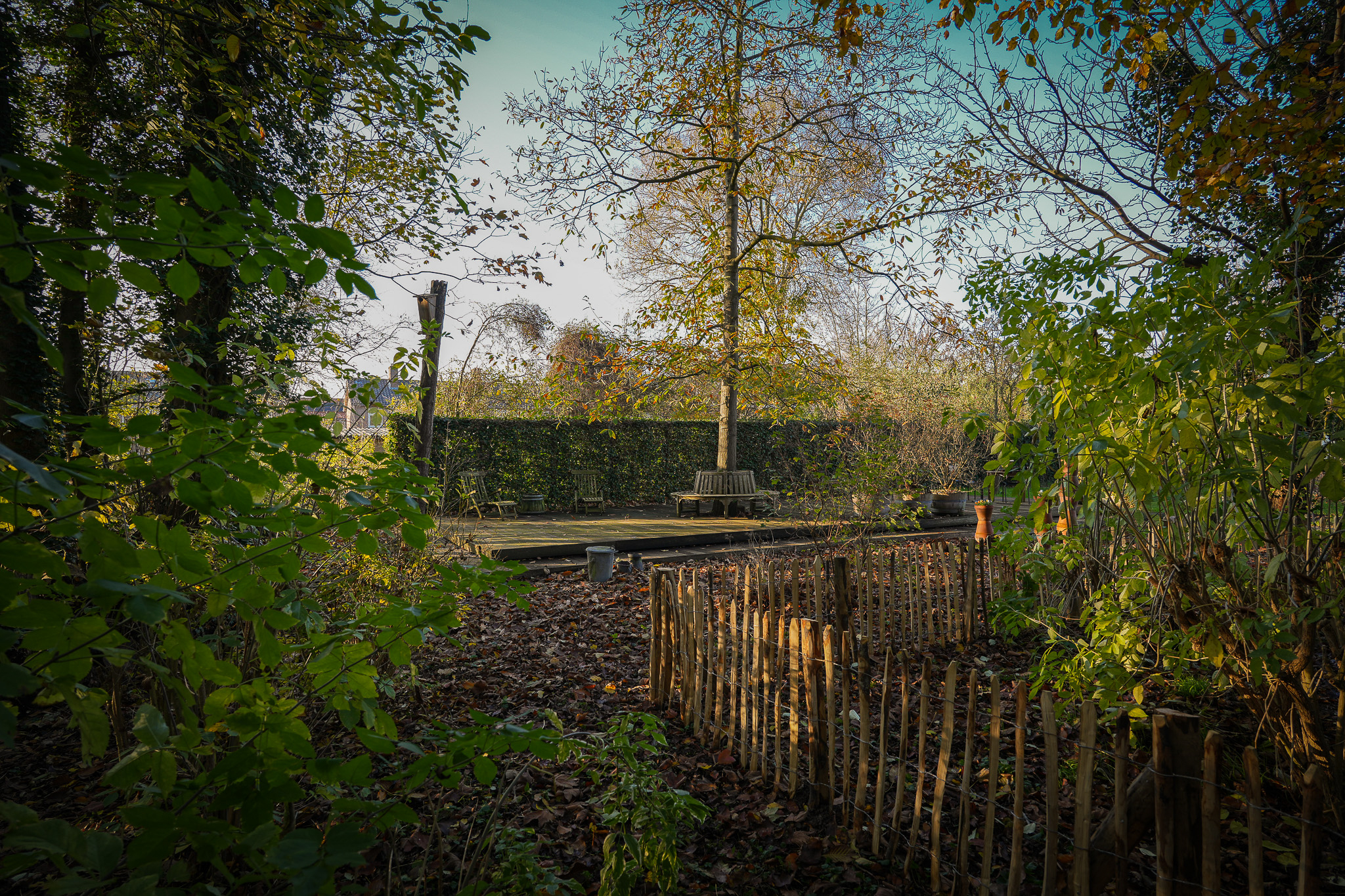 Au-delà de la maison, le cadre a été cultivé dans un esprit d’intimité et d’écologie : jardins fleuris, saules matures, verger d’arbres fruitiers – pommes, poires, prunes, coings – et mare boisée créent une retraite digne d’un parc, prisée de la faune locale. La dépendance isolée, équipée d’un poêle à bois et de portes-fenêtres, ouvre de nouveaux horizons, que ce soit comme atelier, logement pour invités ou bureau paisible.