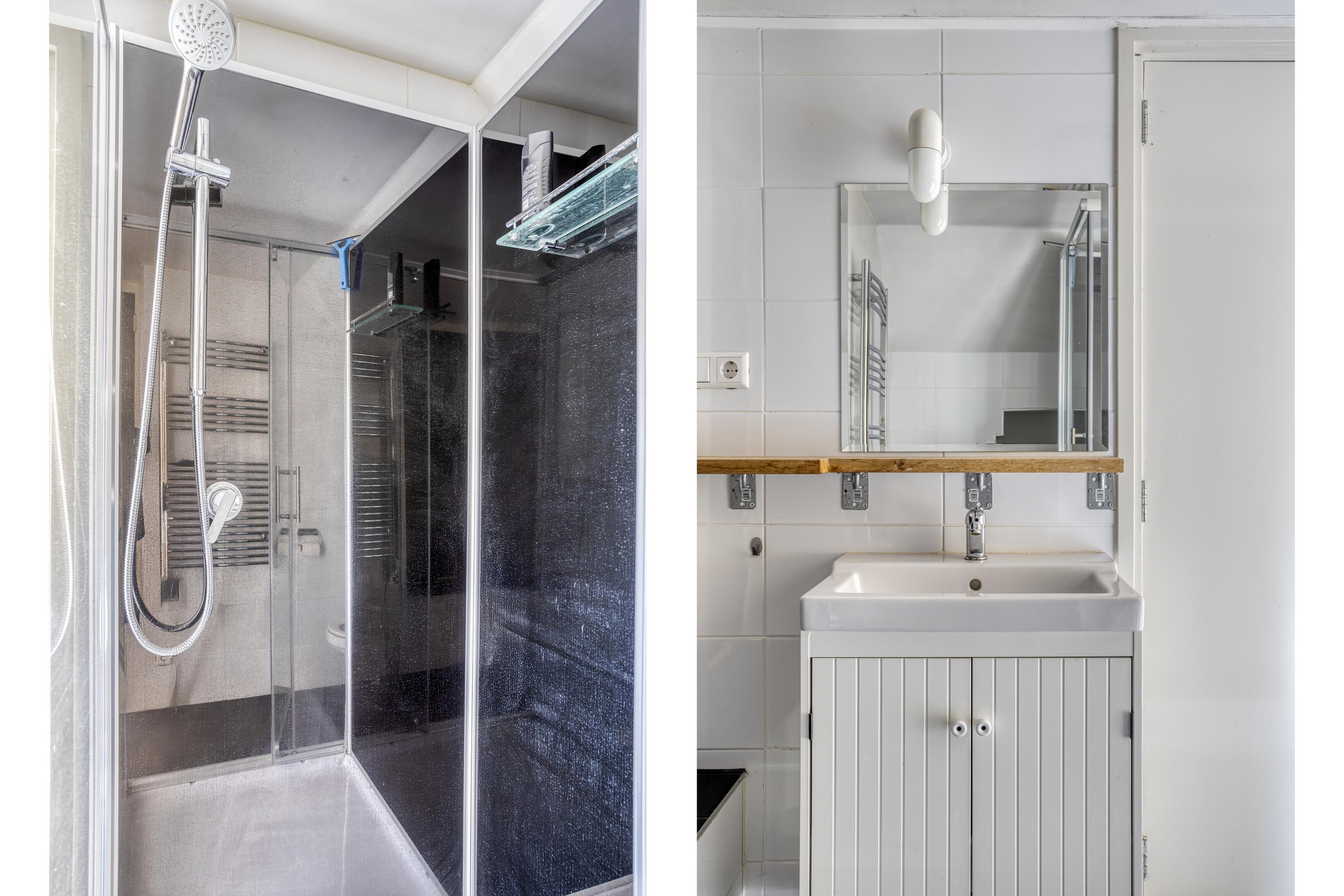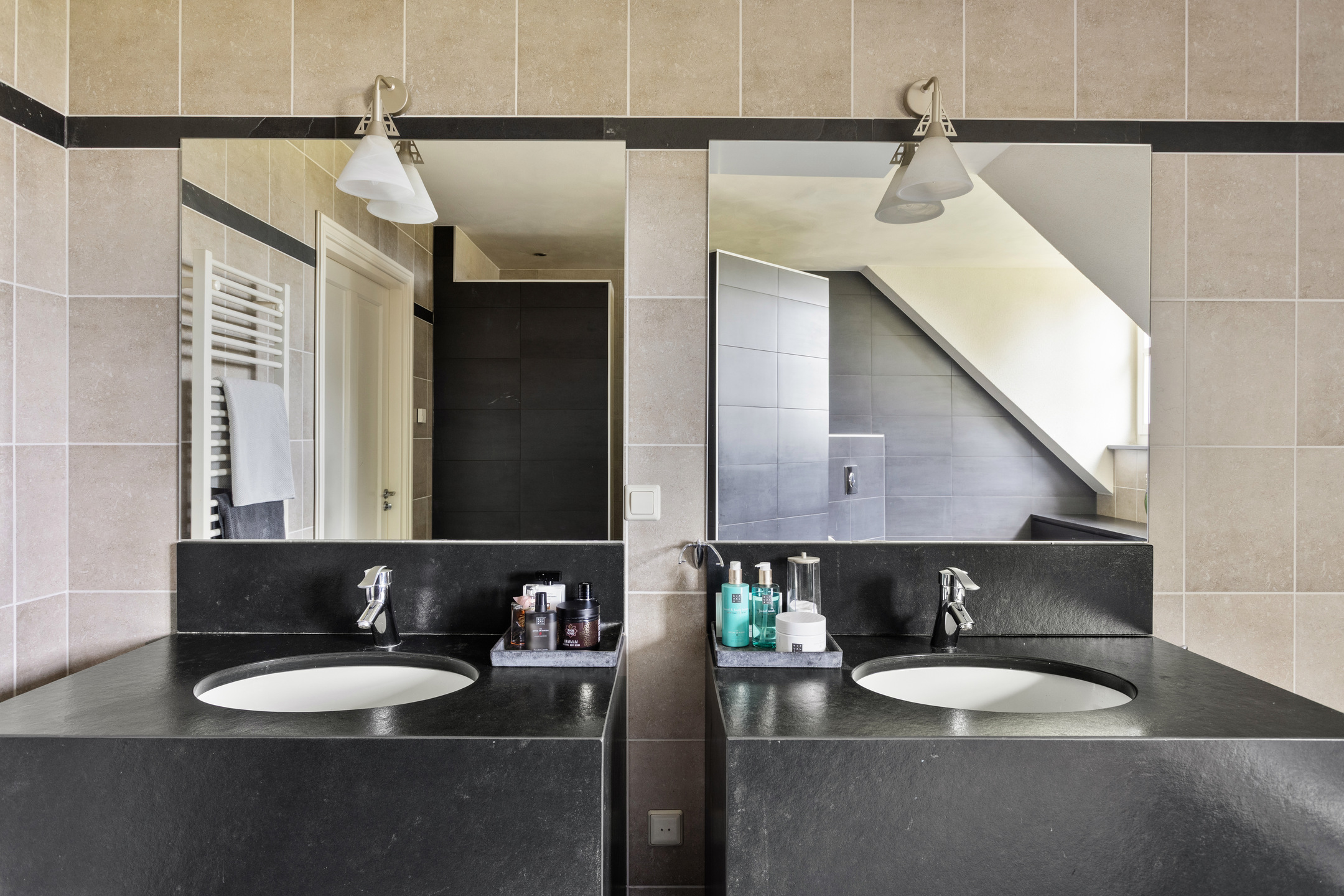 royale badkamer voorzien van een 2-persoonsligbad, inloopdouche, infraroodpaneel, badkamermeubel met dubbele wastafel, elektrische designradiator, dakkapel en vloerverwarming;