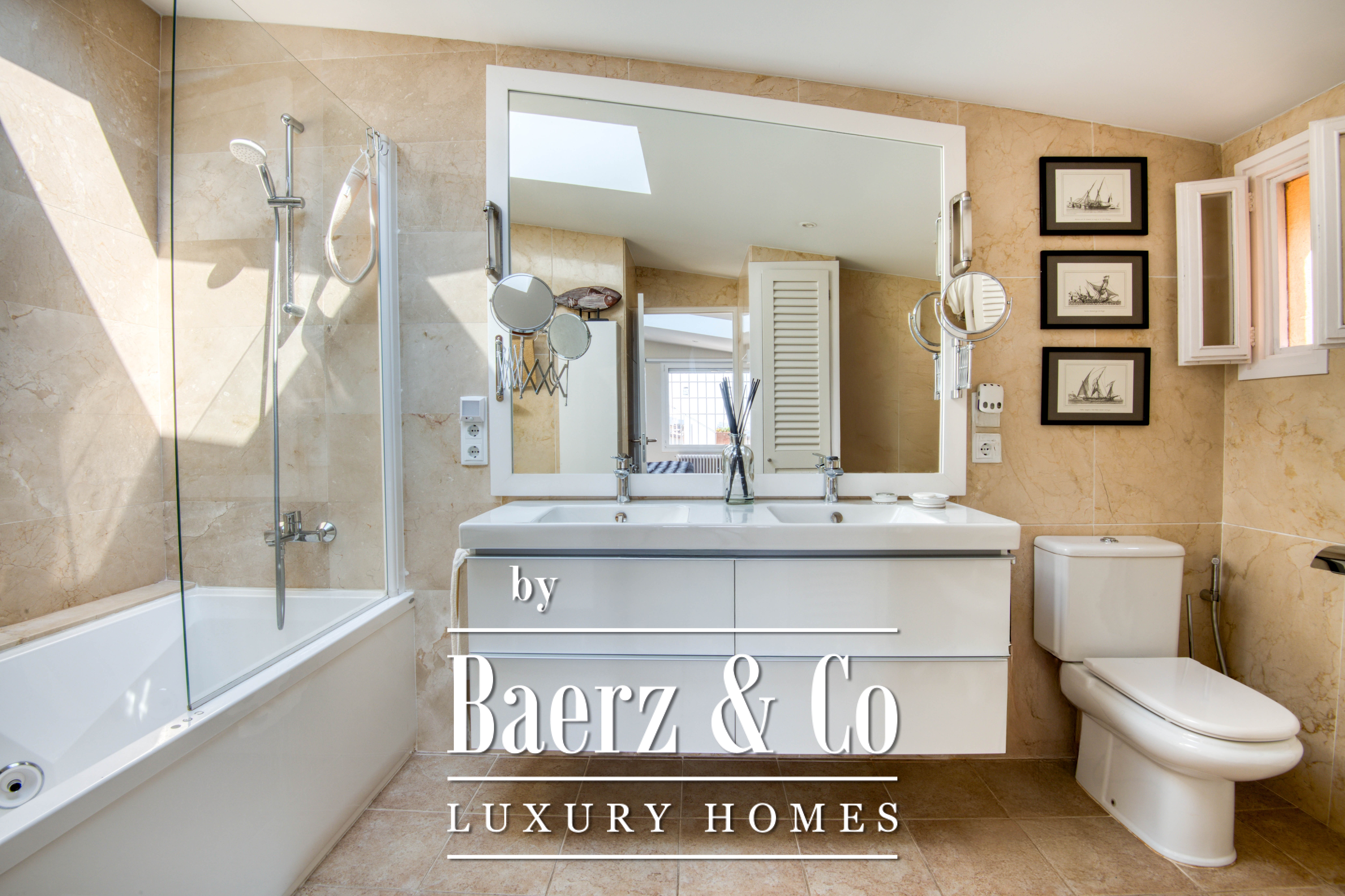 À l’étage, deux chambres doubles dotées de rangements sur mesure et une salle de bain partagent l’espace avec la suite principale. Cette dernière dispose d’un dressing, d’une salle de bain privative, d’un coin bureau et d’un accès exclusif à une terrasse offrant une vue panoramique sur Platja d’Aro et ses environs.