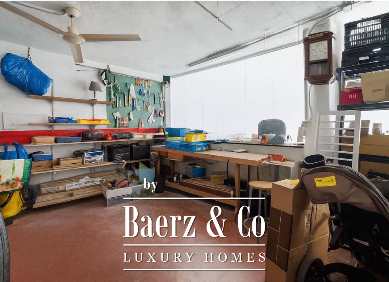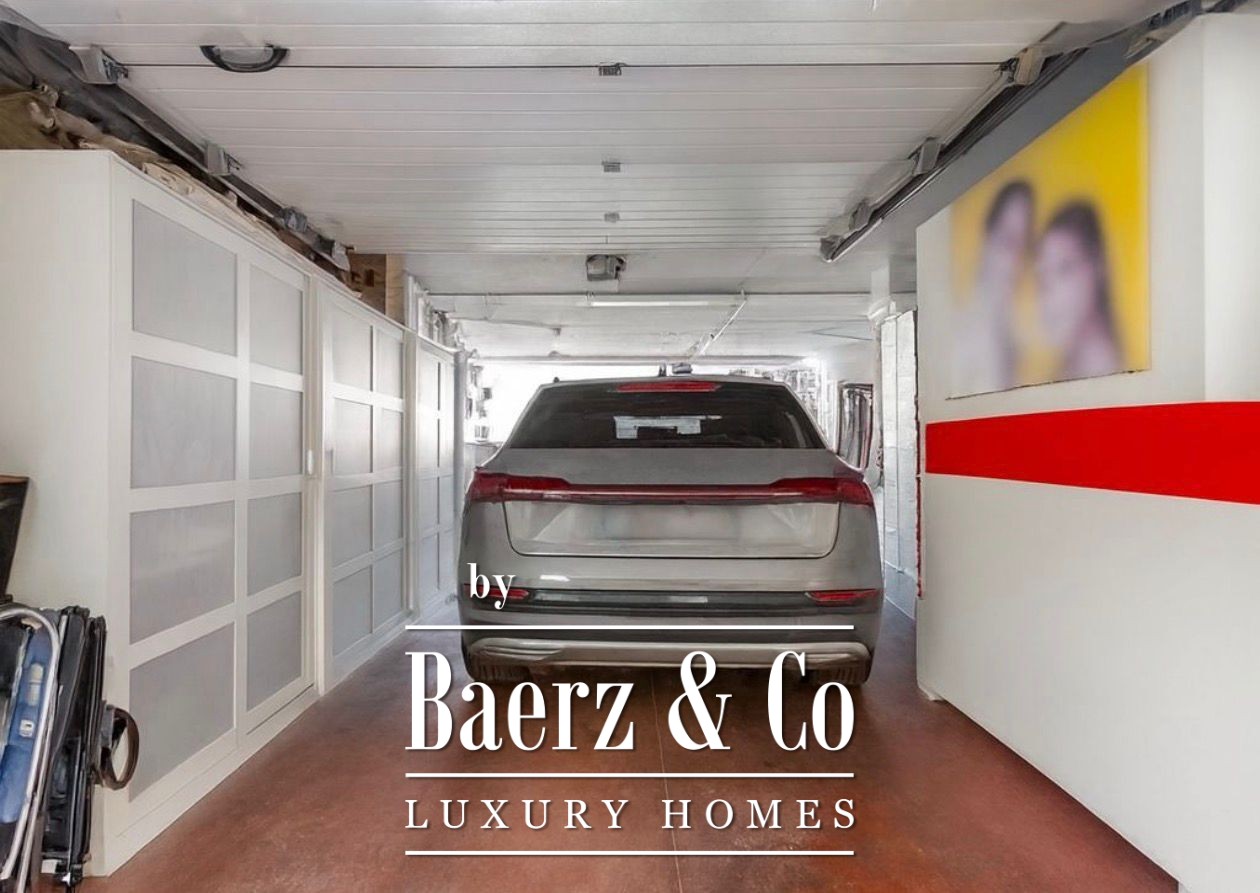 Privé garage: Afgesloten parkeerplaats van 40 m² met eigen badkamer, inbouwkasten en oplader voor elektrische auto.