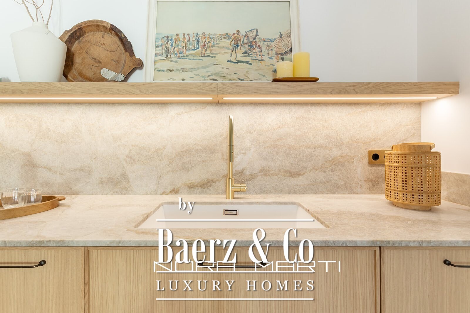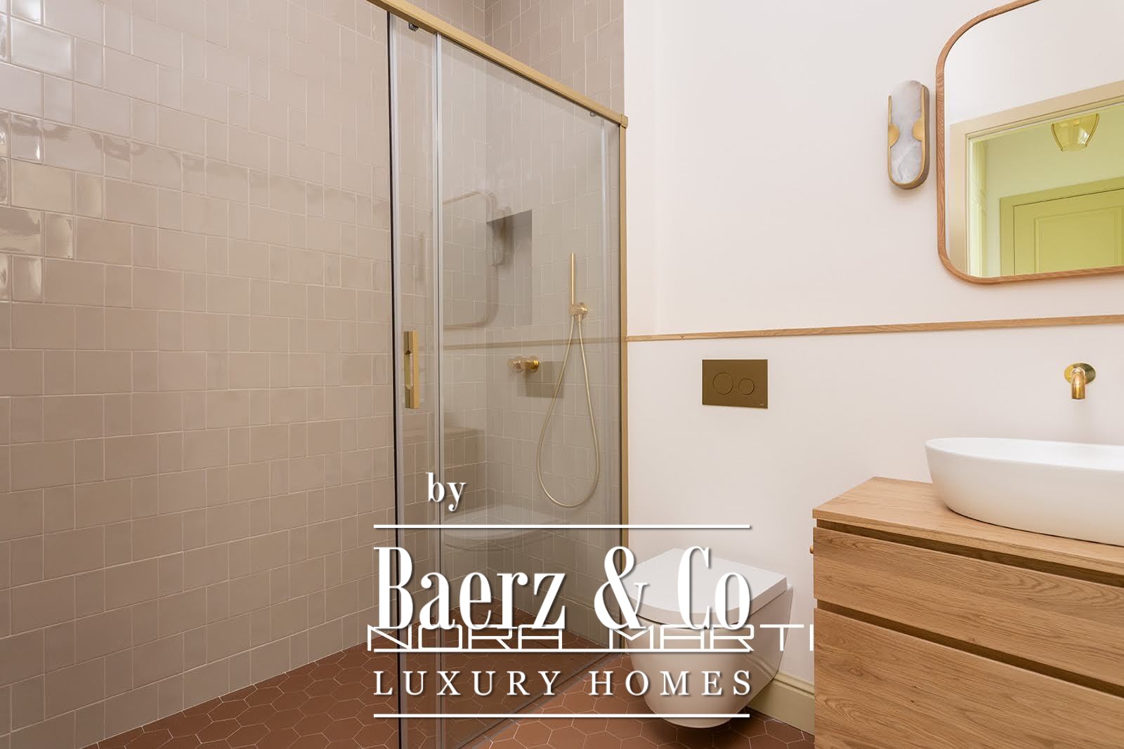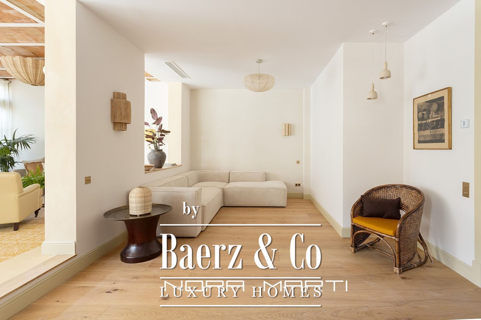 De woonkamer, voorzien van handgemaakte lokale tegels en hoge raampartijen, opent naar een rustige privéterras waar binnen- en buitenleven naadloos samensmelten. De volledig gemoderniseerde keuken beschikt over een wijnkelder, grote oven en royale eetruimte, uitstekend geschikt voor zowel dagelijks gebruik als voor het ontvangen van gasten. Het interieur weeft natuurlijke elementen met subtiele elegantie; brede planken van eikenhout, vloerverwarming en een twee-zone klimaatsysteem geven het geheel permanent comfort.