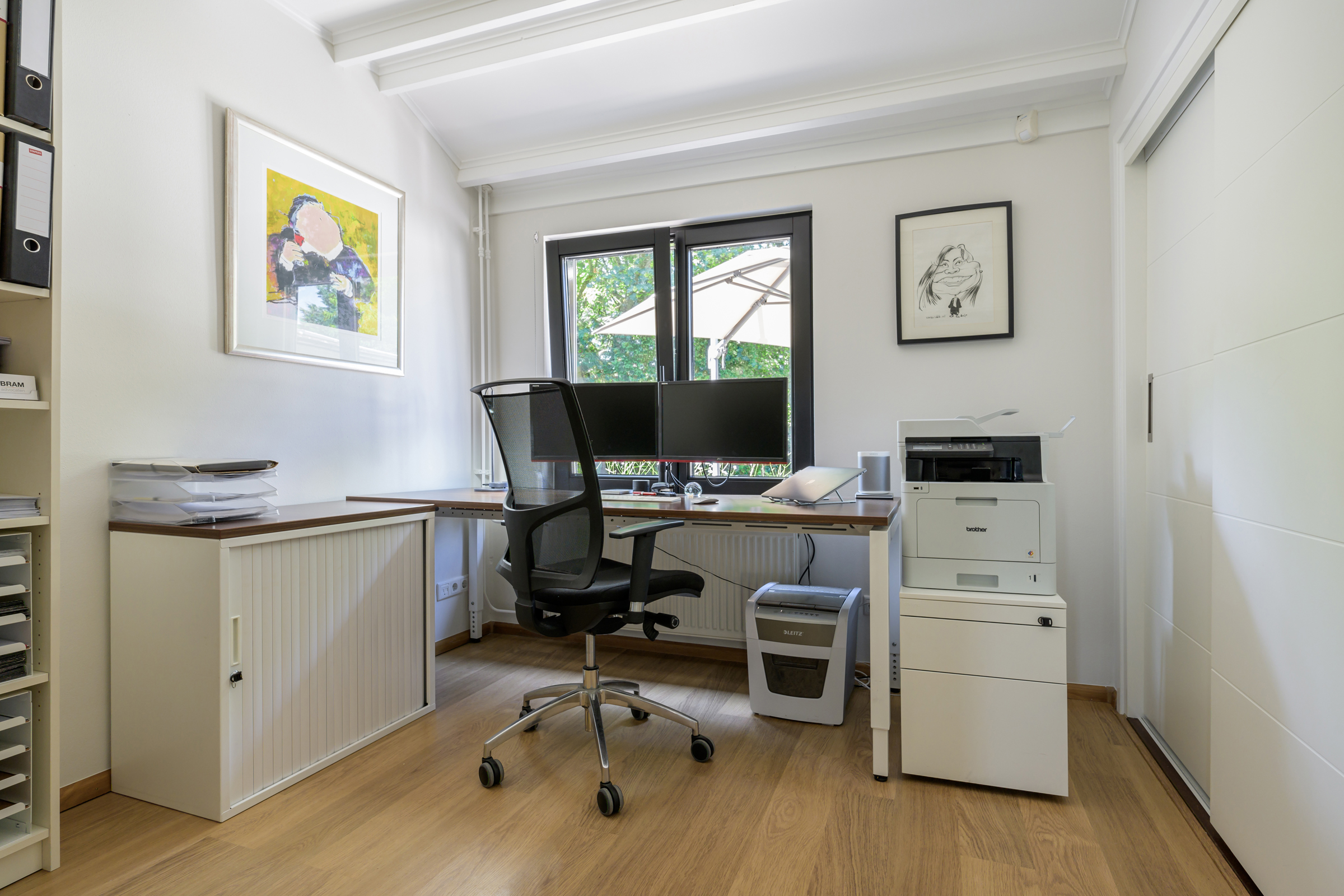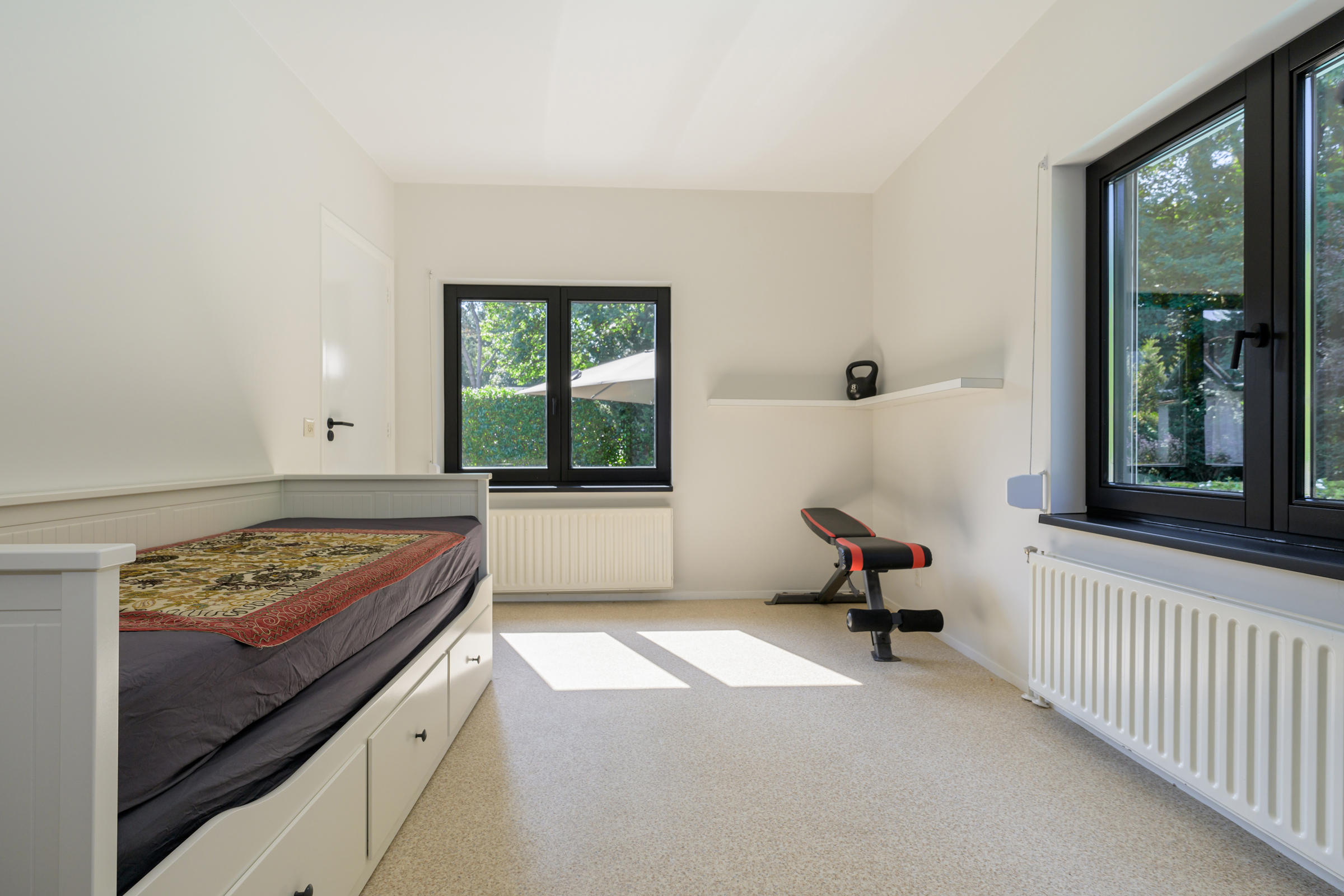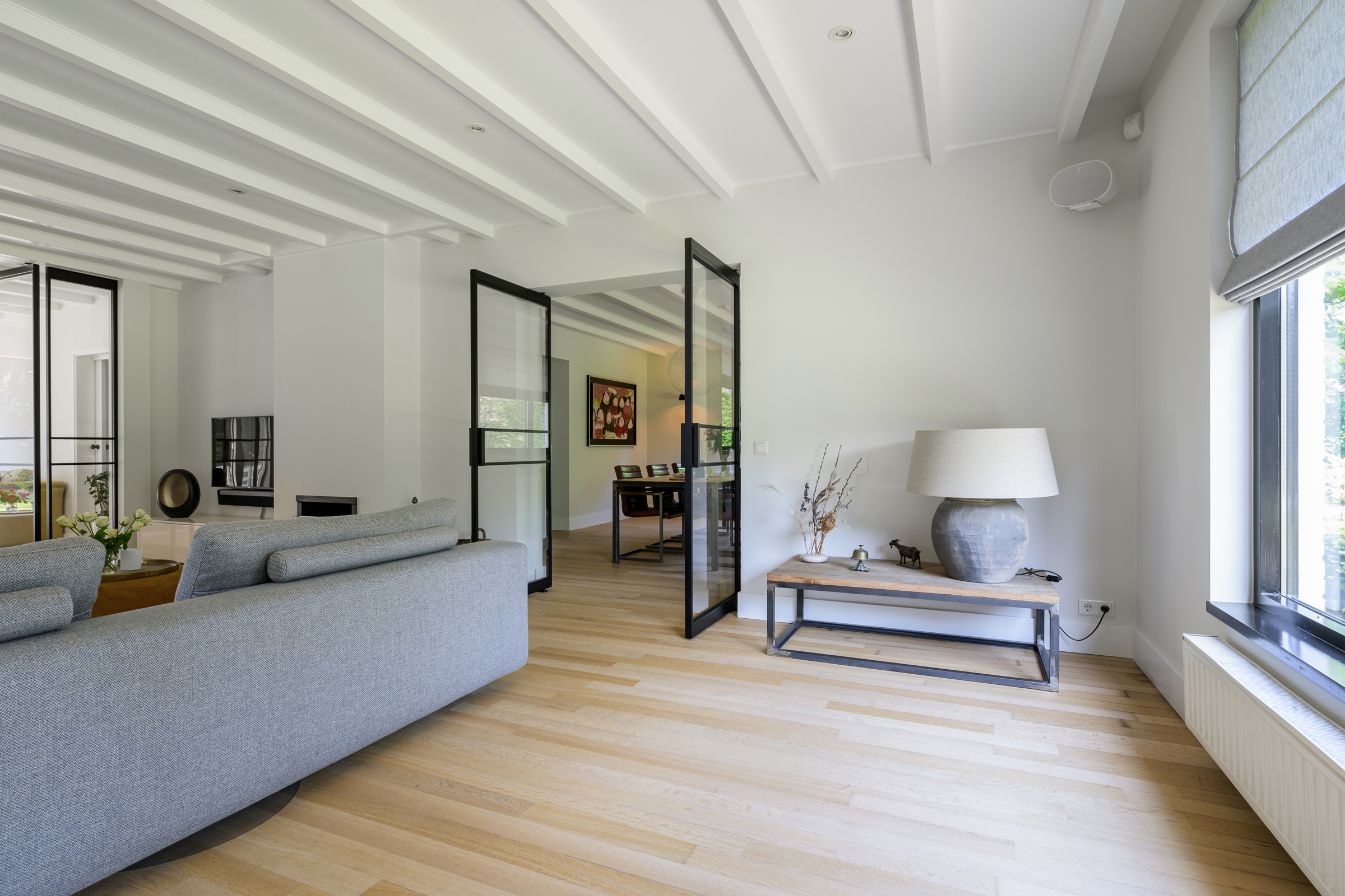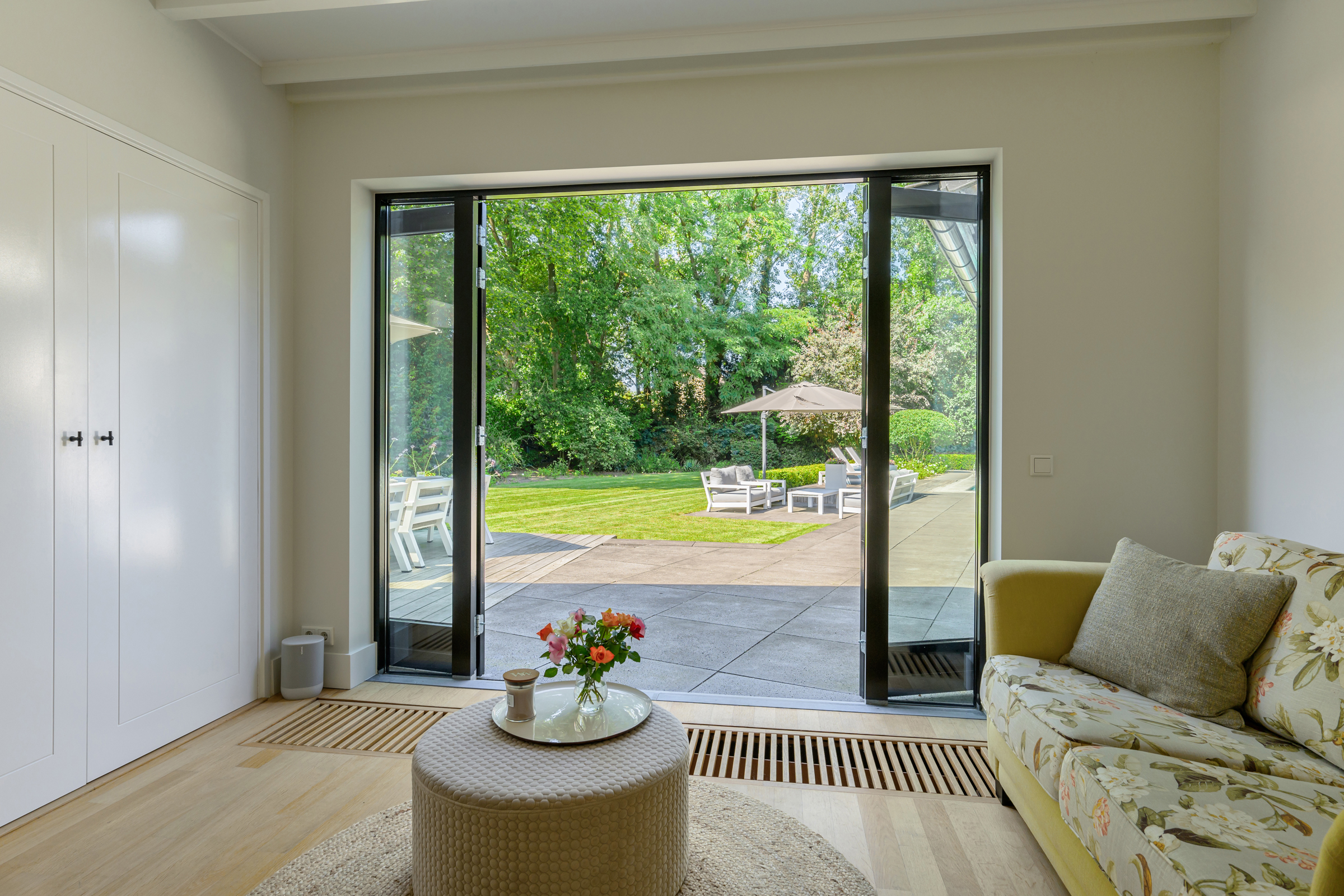De stalen deuren geven toegang tot de aparte zitkamer, grenzend aan de achtertuin. Twee openslaande deuren geven toegang tot de achtertuin.