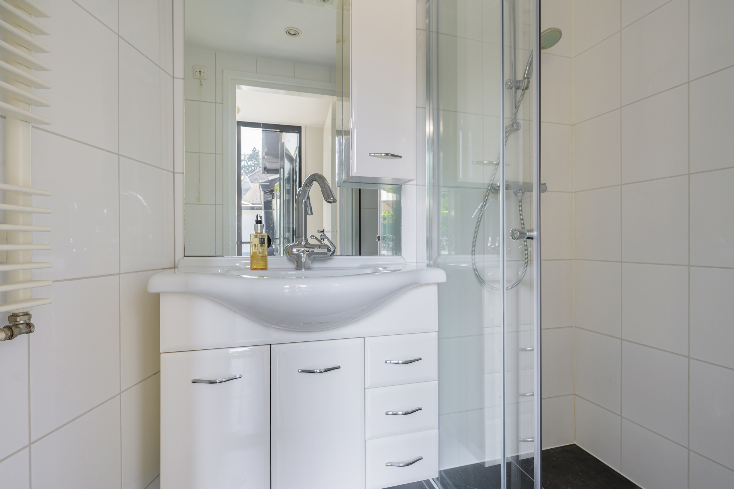 Badkamer met douche, wastafelmeubel en handdoekradiator.