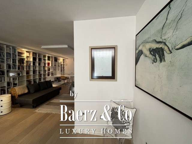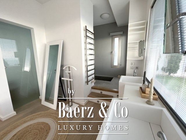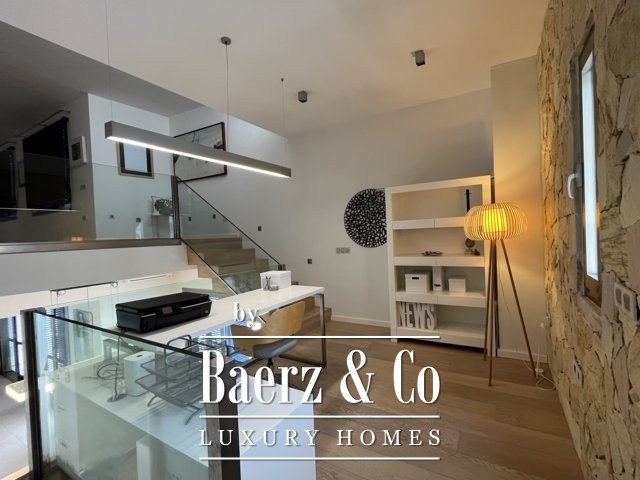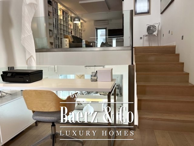 Op de eerste verdieping bevindt zich een mezzanine, momenteel in gebruik als kantoor, met uitzicht op de lichte woonkamer. De bovenste verdieping bestaat uit een bibliotheek/ studeerkamer/hobbyruimte, een groot terras van circa 50 m2 en een aparte tweepersoonsslaapkamer met een eigen badkamer.