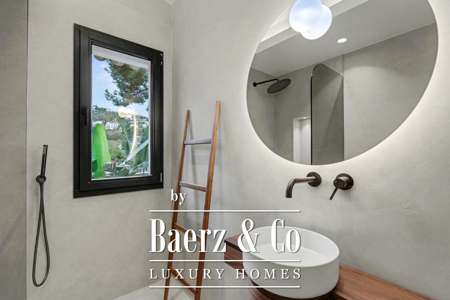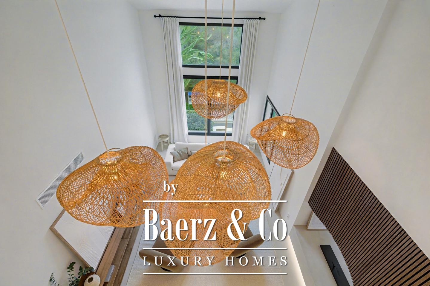 Op de begane grond bevindt zich een slaapkamer met en-suite badkamer, terwijl de tussenverdieping een rustige kinderkamer biedt met uitzicht op het groen. De bovenverdieping herbergt de master suite met privébalkon en zeezicht, een royale inloopkast en een prachtig afgewerkte badkamer met zowel een douche als een bad. Twee extra slaapkamers en een moderne badkamer zorgen voor comfort voor het gezin of gasten.