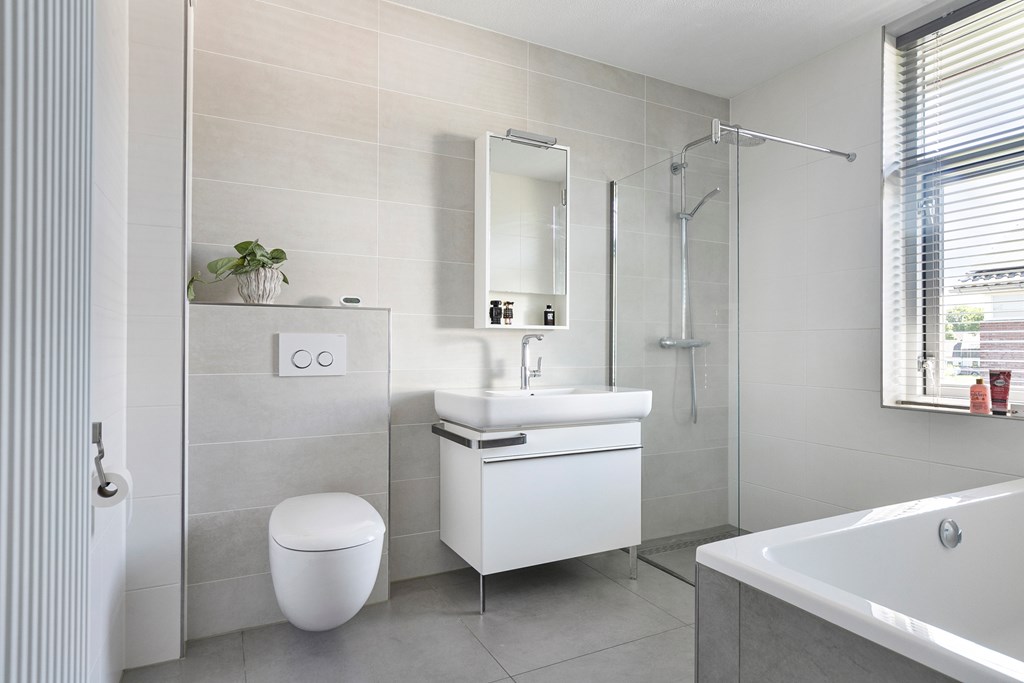 De badkamer is praktisch en stijlvol ingericht. Met een ruim ligbad, een inloopdouche, een wastafel met spiegel en opbergmeubel én een toilet, is hier aan alles gedacht. De ruimte is volledig betegeld en netjes afgewerkt, waardoor u er direct gebruik van kunt maken.