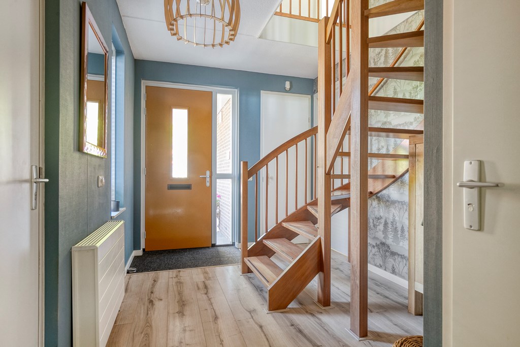 Via de eigen oprit bereikt u de voordeur van de woning, die u binnenleidt in een ruime hal. Deze hal is het centrale punt van waaruit u toegang heeft tot de woonkamer, keuken, het toilet, inpandige garage en de trap naar de eerste verdieping. De verzorgde afwerking en het licht dat via de voordeur naar binnen valt, zorgen direct voor een aangename sfeer bij binnenkomst.