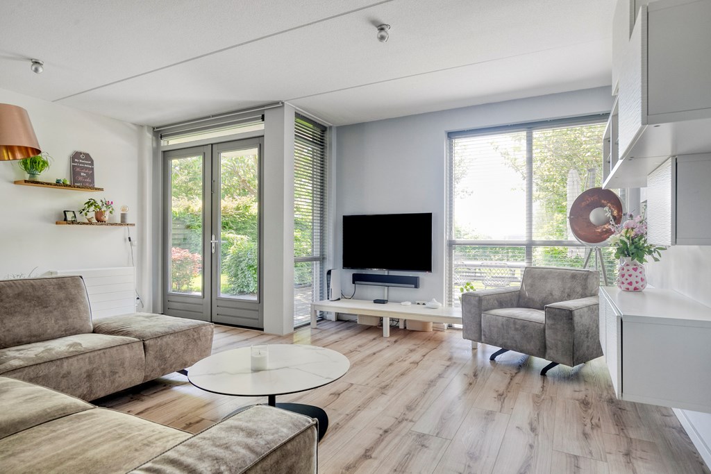 Deze royale woonkamer vormt het hart van de woning met een vrij zicht naar de uiterwaarden. Dankzij de grote raampartijen valt het daglicht hier rijkelijk naar binnen, wat de ruimte een open en luchtige uitstraling geeft. De indeling is flexibel en biedt volop mogelijkheden voor een gezellige zithoek. De openslaande deuren naar de tuin zorgen voor een fijne verbinding met buiten, terwijl de moderne afwerking het geheel compleet maakt.