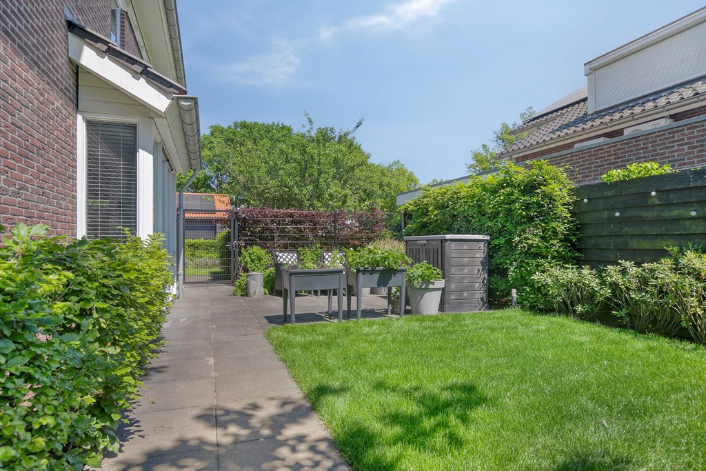Via de openslaande deuren in de woonkamer stapt u de diepe, groene achtertuin in die grenst aan de Uiterwaarden – het ware hoogtepunt van deze woning. De tuin is fraai aangelegd met een mix van bestrating en groen, en biedt volop ruimte voor een loungeset of een buitentafel. De ligging zorgt ervoor dat u hier optimaal kunt genieten van de zonuren. Achter in de tuin bevindt zich een sfeervolle overkapping (voorzien van internet) waar u ook op minder zonnige dagen heerlijk buiten kunt zitten en/of werken. De tuin biedt veel privacy en vormt een oase van rust.