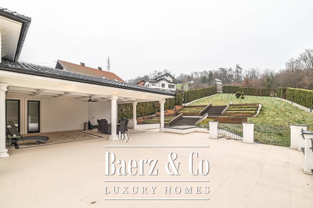 De grote raampartijen laten overvloedig daglicht binnen, waardoor zowel praktische als verfijnde elementen worden benadrukt, waaronder 150 m² aan terrassen, een binnenzwembad met aangrenzende Finse sauna en een sfeervolle bovengalerij. Het perceel biedt uitzonderlijke privacy, aangevuld met een vrijstaand bijgebouw van 120 m², een dubbele garage en zes parkeerplaatsen. Alle essentiële stadsvoorzieningen zijn binnen vijf tot zes minuten per auto bereikbaar, zodat comfort en rust hand in hand gaan. Deze villa is bestemd voor wie tijdloze architectuur zoekt in een vredige omgeving van Zagreb.