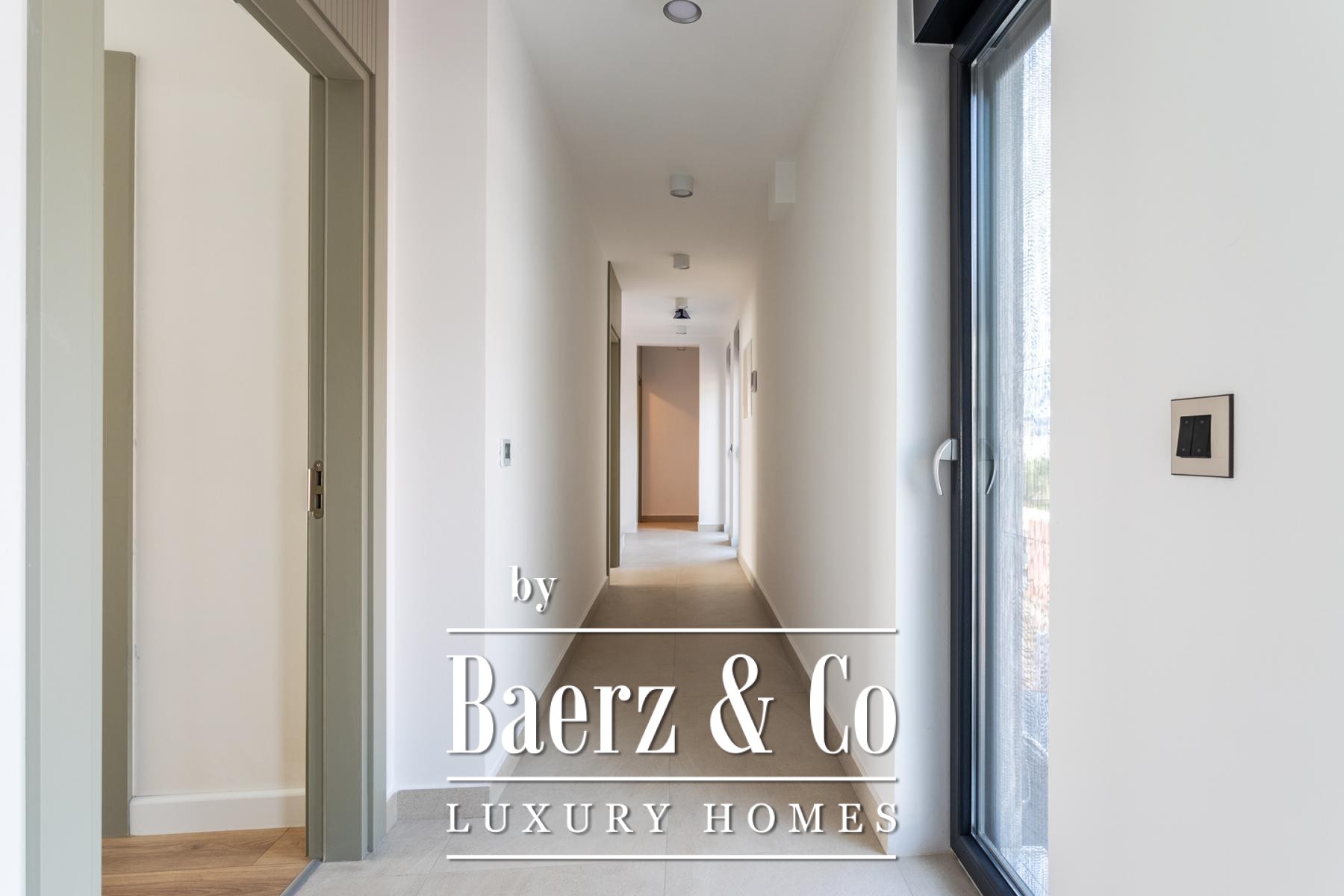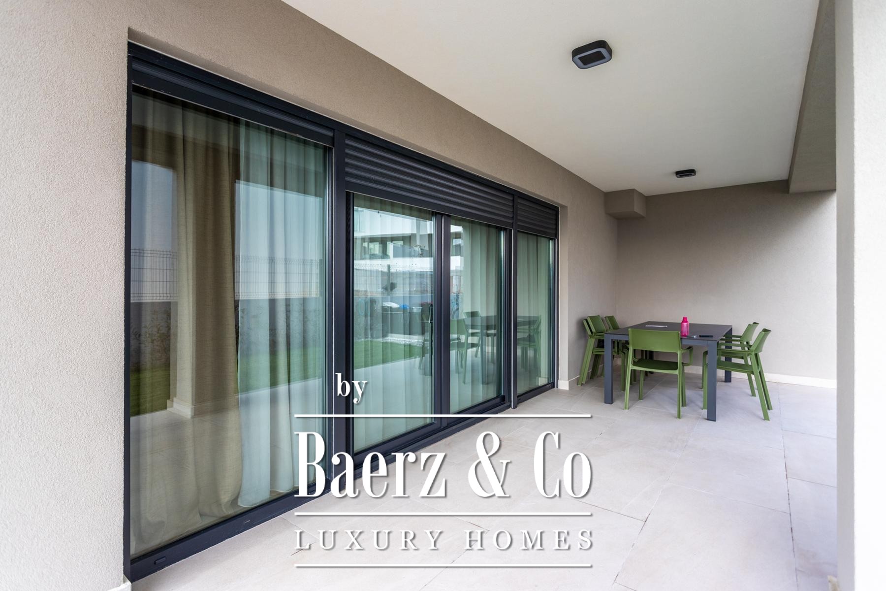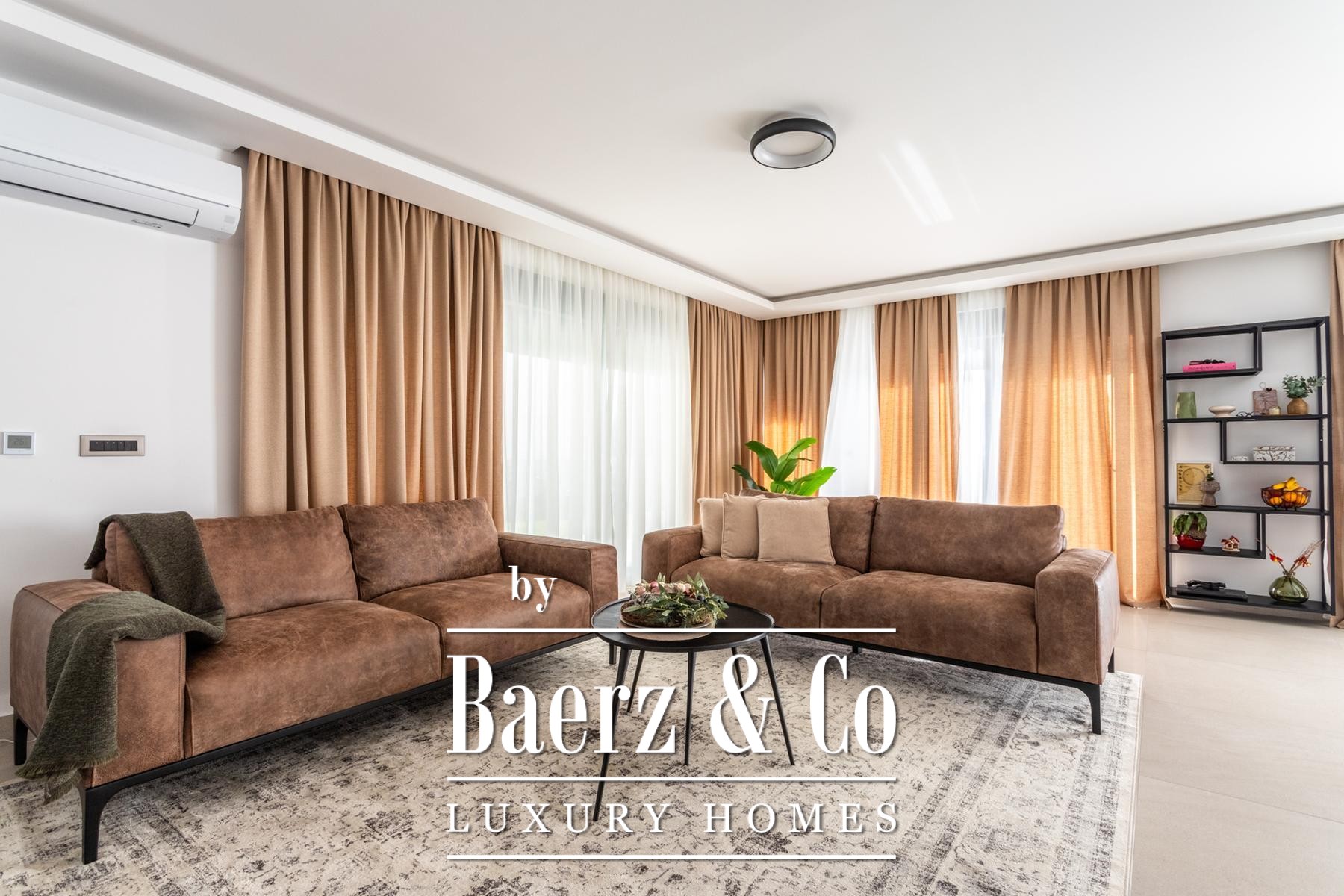 De begane grond vormt het toneel met een entreehal die toegang biedt tot een functionele opeenvolging van vertrekken waaronder een wasruimte, gastentoilet en berging. Het hart van het huis is een royale, lichte leefruimte waar keuken, eetkamer en lounge vloeiend in elkaar overlopen. Plafondhoge raampartijen verbinden het interieur moeiteloos met een ruime overdekte veranda, zonneterras en privézwembad, wat een levensstijl onderstreept die is afgestemd op het mediterrane klimaat.