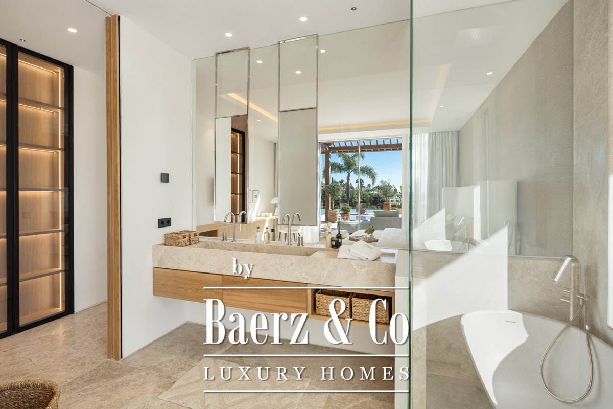 Binnen de 854 m² woonoppervlakte zorgen royale volumes en een neutraal kleurenpalet voor een subtiele luxe uitstraling. Natuurlijk licht stroomt via de grote glazen deuren naar binnen, waardoor de open leefruimtes naadloos worden verbonden met de terrassen die uitnodigen tot optimaal buitenleven. De moderne keuken is ingericht voor de meest veeleisende fijnproever, terwijl vijf slaapkamers, waaronder een exclusieve master suite met privéterras, inloopkast en verfijnde badkamer, elke bewoner een persoonlijke toevluchtsoord bieden.
