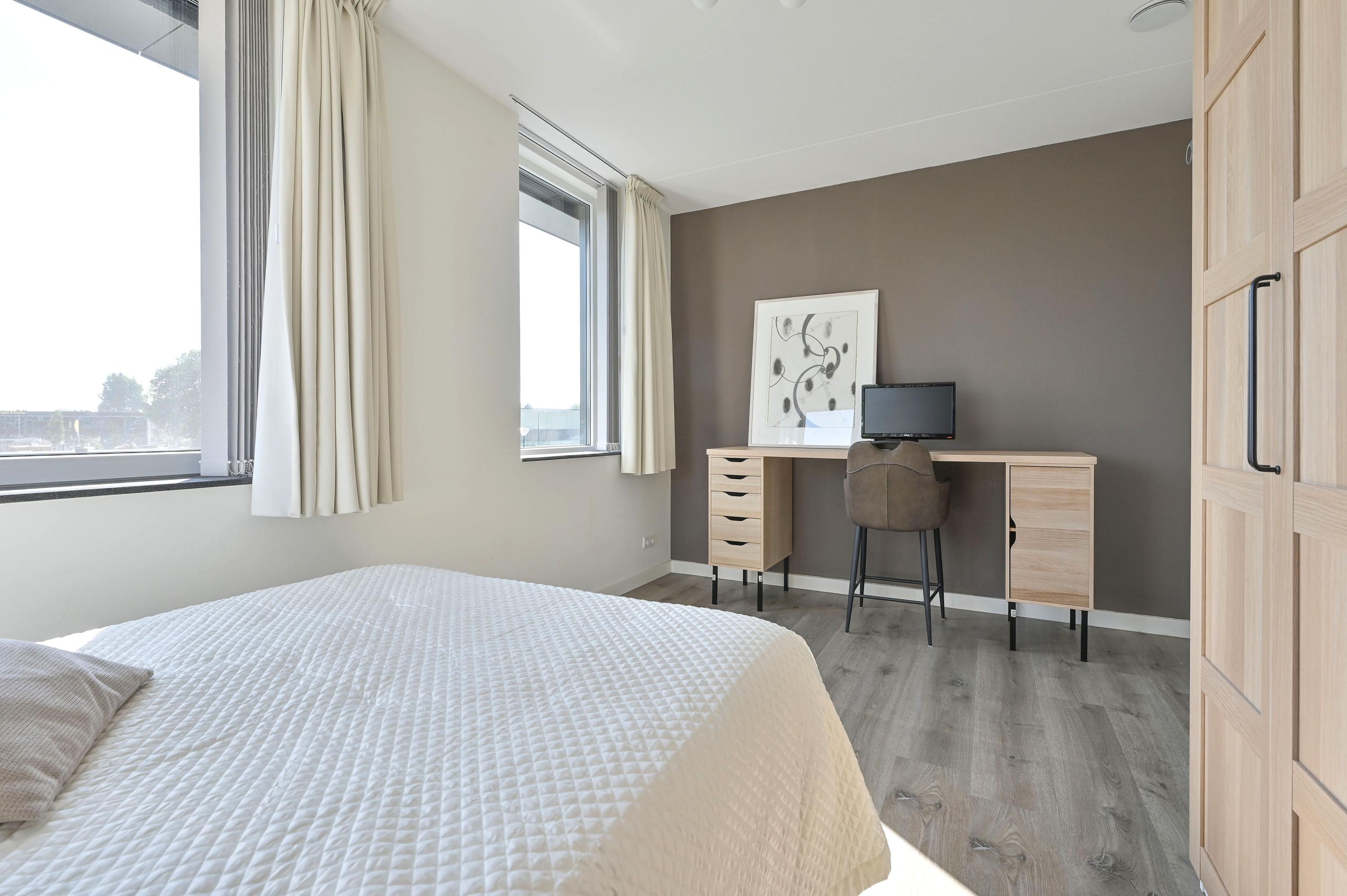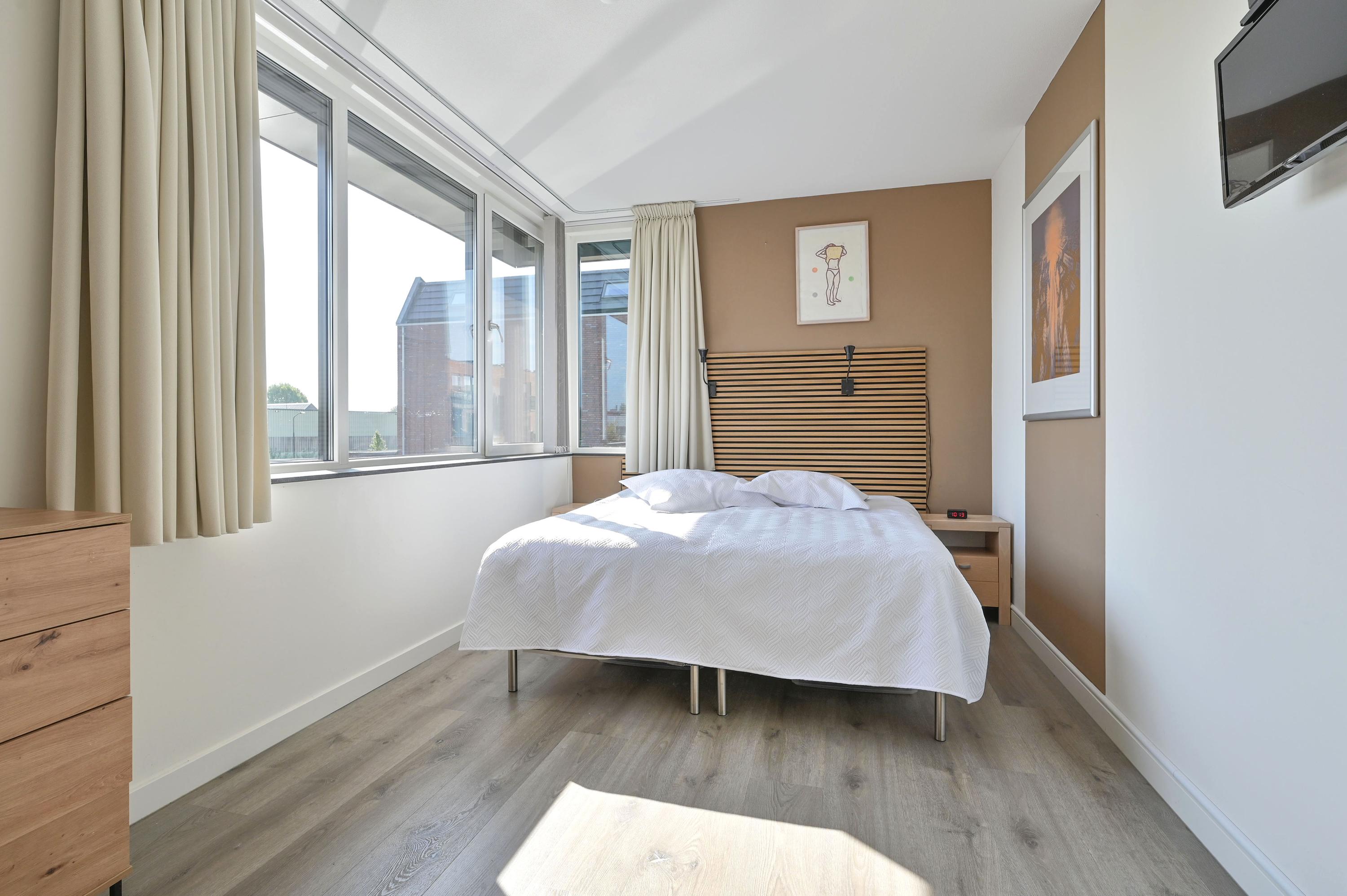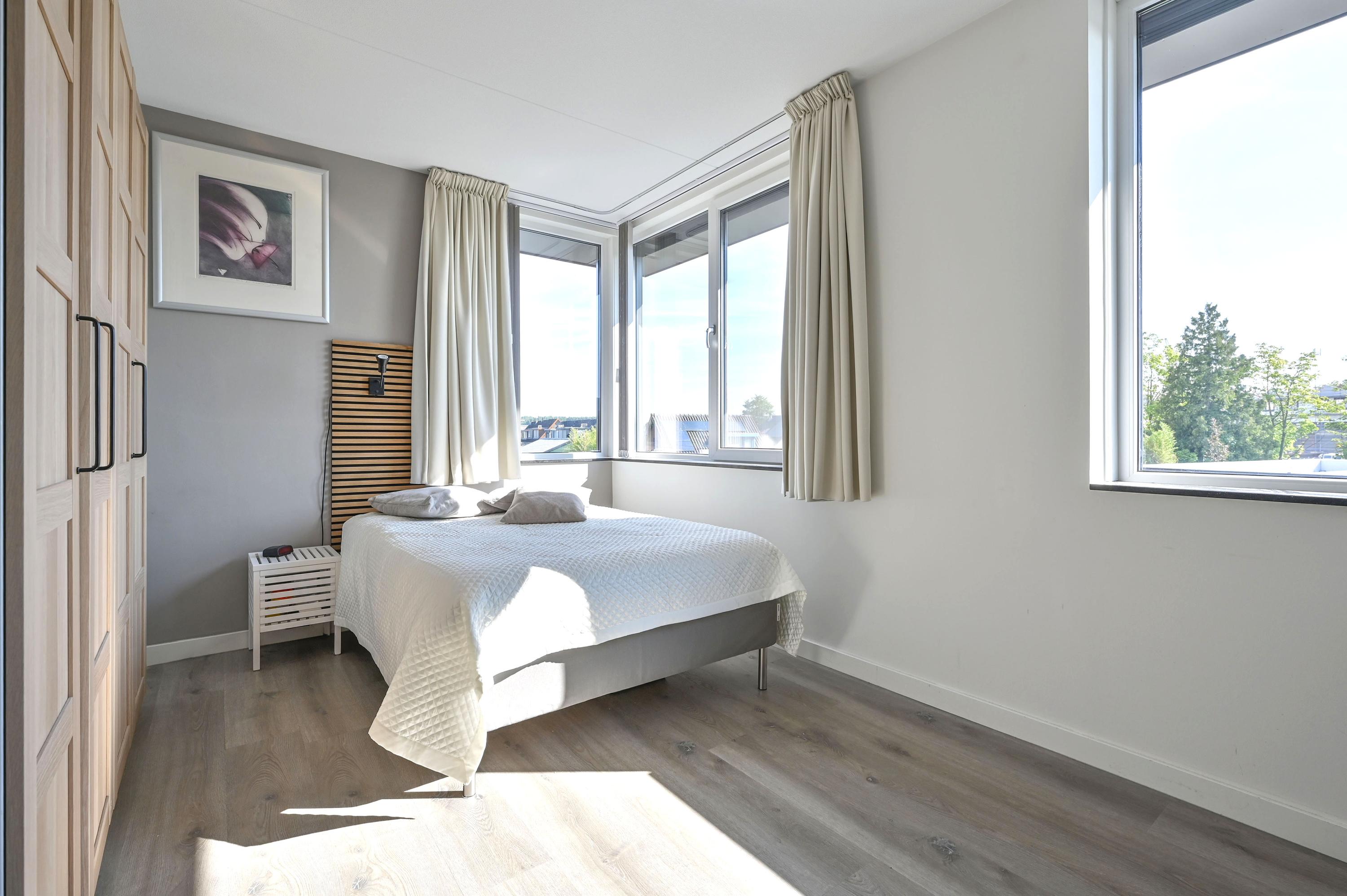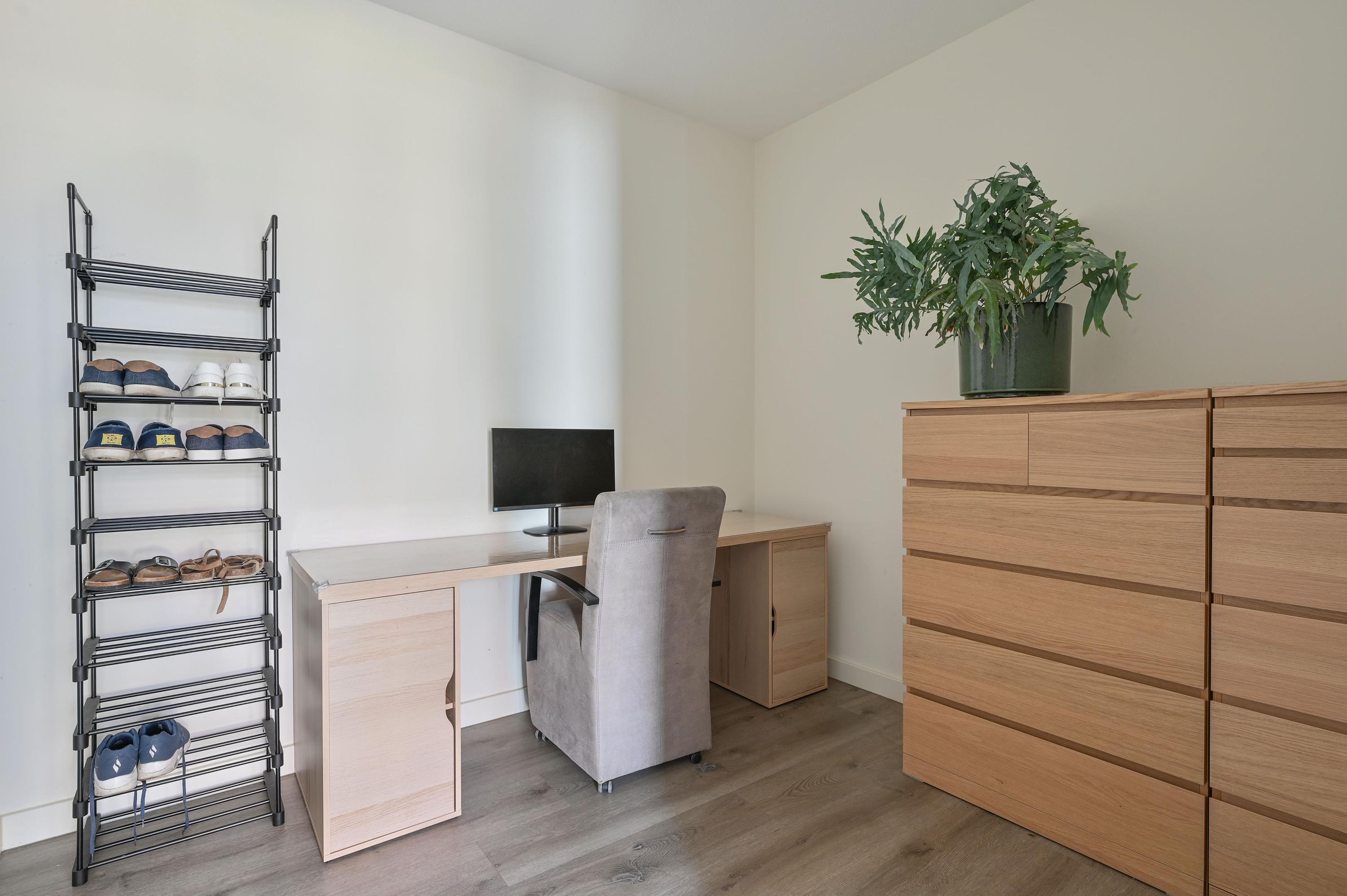 Via de vaste trap bereikt u de royale overloop, die toegang biedt tot alle vertrekken op deze verdieping. Direct links bevindt zich een praktische wasruimte met raam, voorzien van aansluitingen voor de wasmachine en de wasdroger, én genoeg ruimte voor extra opslag. Naast deze ruimte ligt een grote slaapkamer of logeerkamer, heerlijk licht dankzij het hoekraam en een extra raam. Aan de overzijde van de overloop vindt u een modern afgewerkt, separaat toilet met fontein in stijlvolle grijs-witte tinten. Daartegenover ligt de riante badkamer met raam, inloopdouche voorzien van stortdouche en handdouche, een dubbele wastafel met lades, spiegel met verlichting en een extra wandmeubel. De ruimte biedt bovendien voldoende mogelijkheden voor het plaatsen van een ligbad in de toekomst. Verder herbergt deze verdieping een technische ruimte met warmtepomp, boiler, WTW-installatie en de omvormer voor de 14 eigen zonnepanelen – met daarnaast nog volop bergruimte. Aan het einde van de gang bevinden zich weer twee royale slaapkamers: links de hoofdslaapkamer met groot hoekraam, rechts een ruime kamer met hoekraam, momenteel in gebruik als werkkamer. Over de gehele verdieping ligt dezelfde onderhoudsvriendelijke pvc-vloer in warme houtlook als beneden, compleet met vloerverwarming. Alle ramen zijn voorzien van horren en elektrische screens, die worden gevoed door de zonnepanelen – een combinatie van luxe, comfort en duurzaamheid.