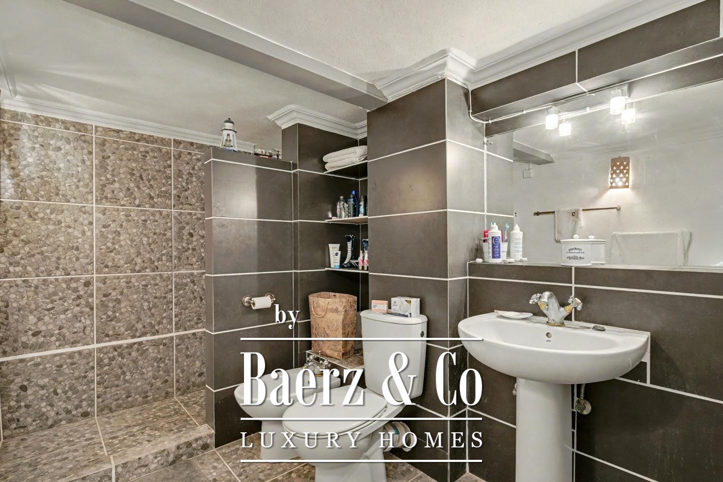 De hoofdverdieping verwelkomt met een glazen winterterras waar het uitzicht op zee tot aan de horizon reikt. De woonkamer met haard, een compleet uitgeruste keuken, een slaapkamer, badkamer en kantoor vloeien hier naadloos samen. Het lagere niveau beschikt over twee extra slaapkamers, een ruime badkamer, kleedruimte en bijkeuken; een praktische, serene plek voor ontspanning.