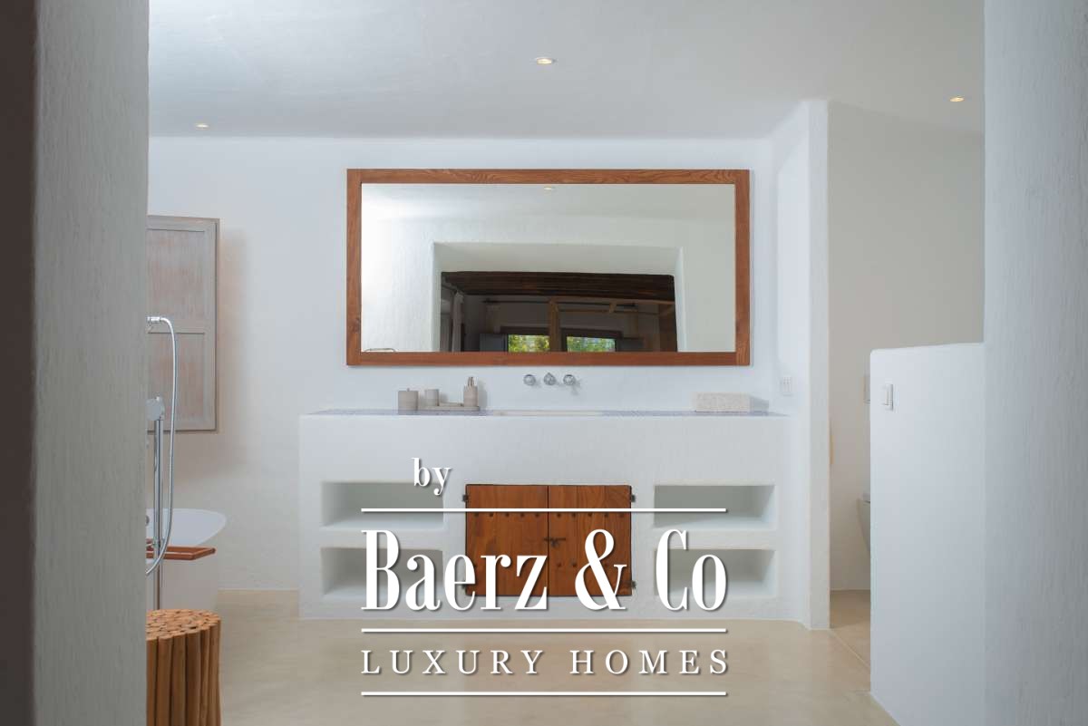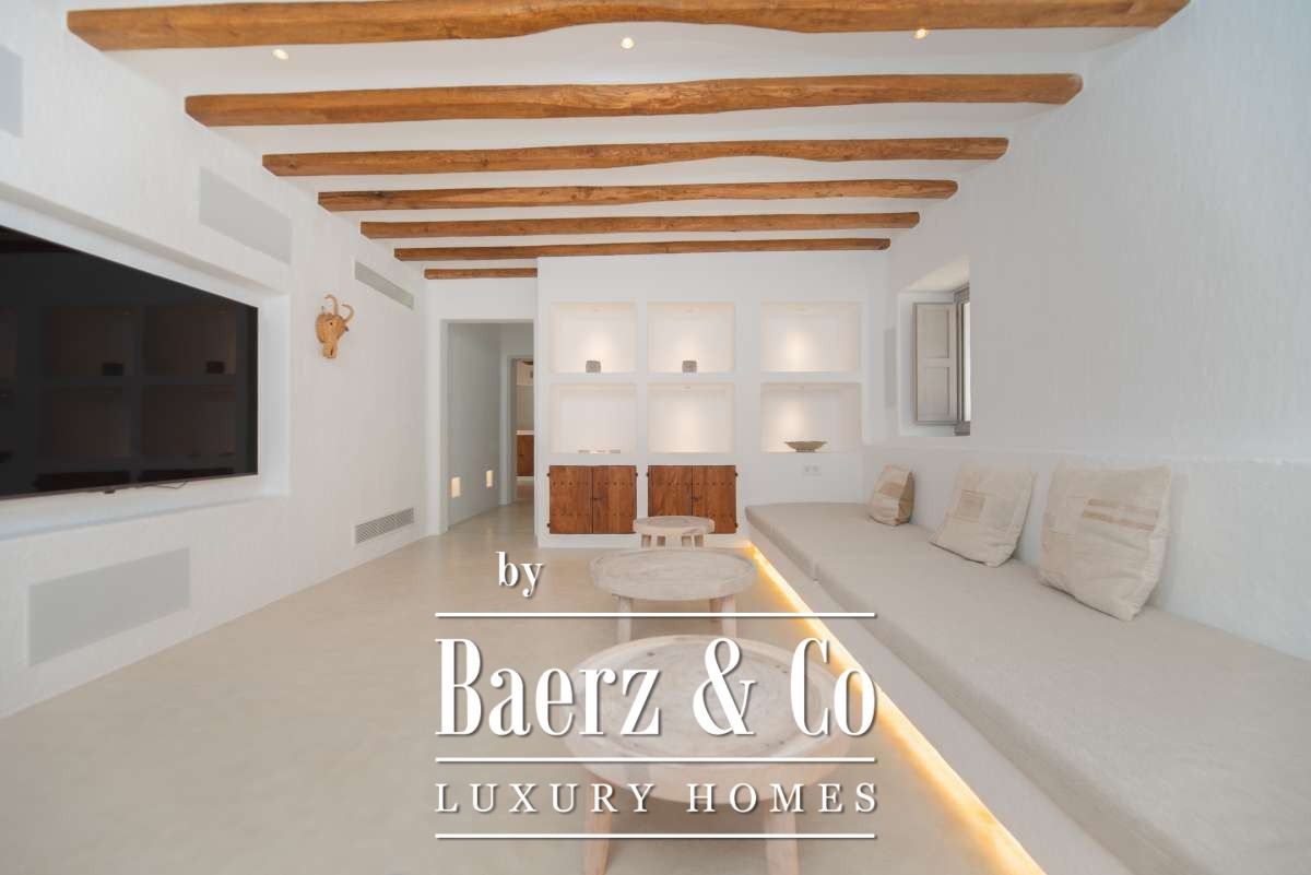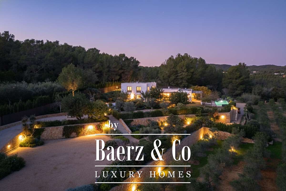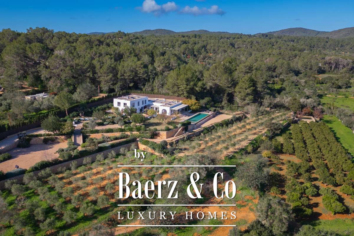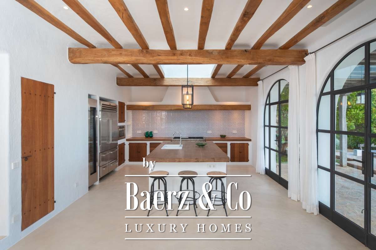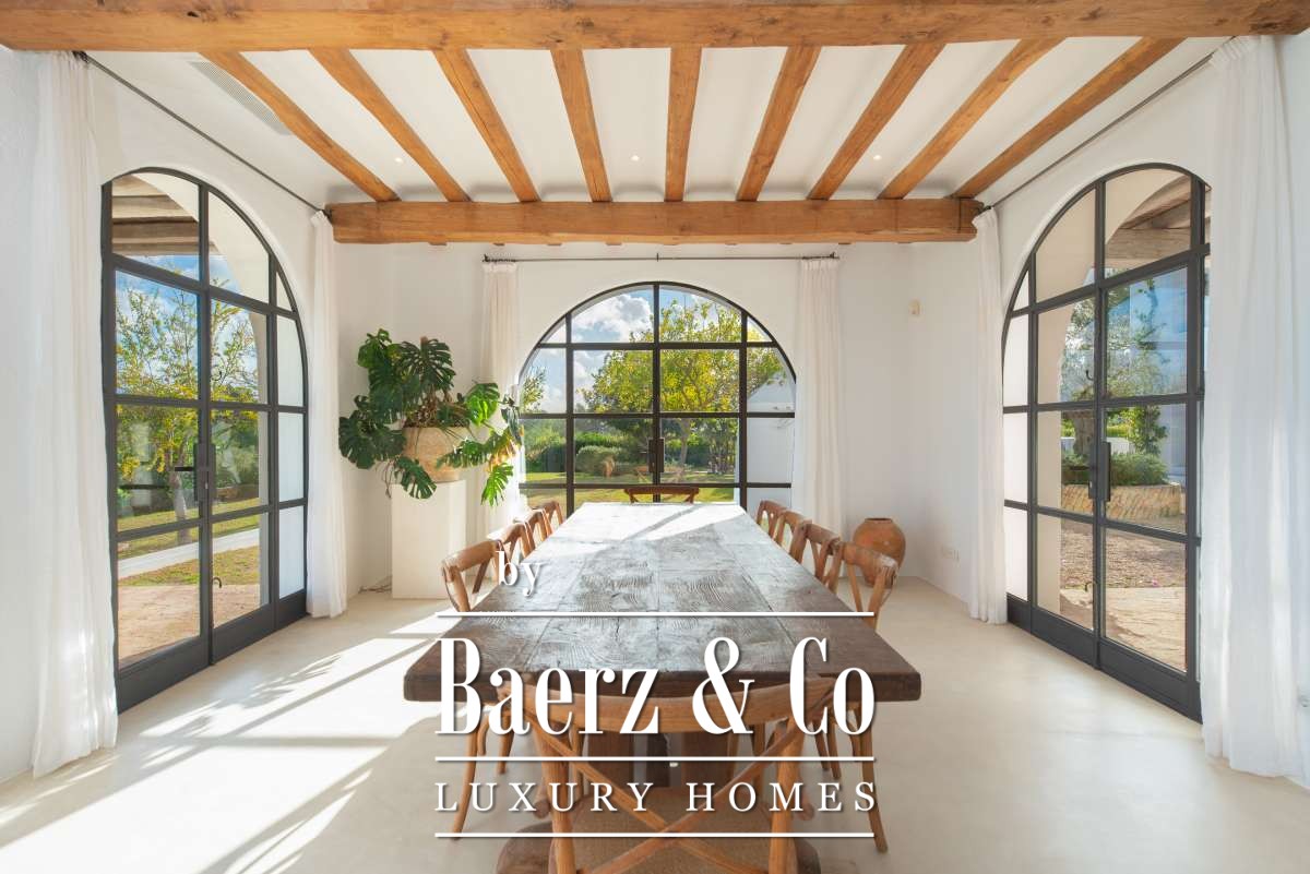 De omgevingCan Sans ligt op de hoogst gelegen punt van een diepe vallei, midden op het eiland, een plek waar rust, ruimte en uitzicht elkaar ontmoeten. Vanaf de terrassen kijkt u uit over de zacht golvende heuvels en ziet u de kerktoren van Balafí en de oude verdedigingsmuren in de verte, terwijl aan de andere kant de frisse bronnen bij San Rafael liggen. De omgeving ademt landbouw en traditie: uitgestrekte velden met eeuwenoude olijfbomen, appelbomen en zelfs uw eigen sinaasappelgaard die in seizoen kleur en geur aan het landschap toevoegt. Dankzij de gunstige ligging aan de weg naar San Juan bent u binnen korte tijd in Eivissa of in Santa Gertrudis, en de internationale school is verrassend dichtbij. Deze combinatie van privacy en bereikbaarheid maakt de ligging van Can Sans simpelweg onweerstaanbaar.De villaDe villa is een authentieke boerderij die in de jaren 1940 een opvallende uitbreiding kreeg en sindsdien modern en stijlvol is verbouwd zonder de traditionele kubistische lijnen en de eenvoudige, rustieke charme te verliezen. Met een totale woonoppervlakte van circa 506 m² verdeeld over een riante begane grond van 361,7 m² en een eerste etage van 144,64 m², biedt het huis royale, luchtige ruimtes, ontworpen met comfort en esthetiek in gedachten.