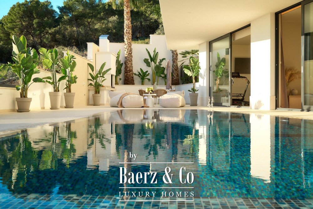 Op de benedenverdieping draait alles om welzijn. De professioneel ingerichte fitnessruimte, sauna, entertainmentruimte en bijkeuken hebben directe toegang tot zonovergoten terrassen, wat een vloeiende overgang naar buiten mogelijk maakt. Hier geniet u van een infinity pool van 31 m² met verwarmde massagestralen en tegenstroomfunctie, een jacuzzi en een royaal zonneterras, allen met uitzicht op zee.