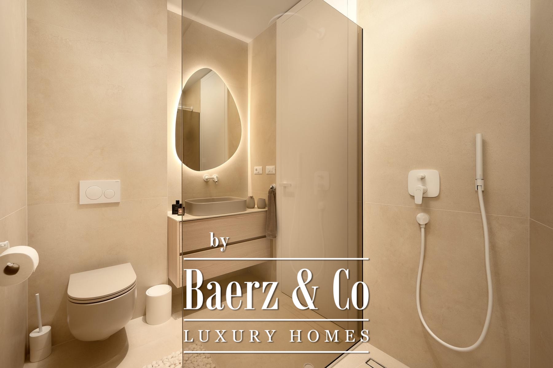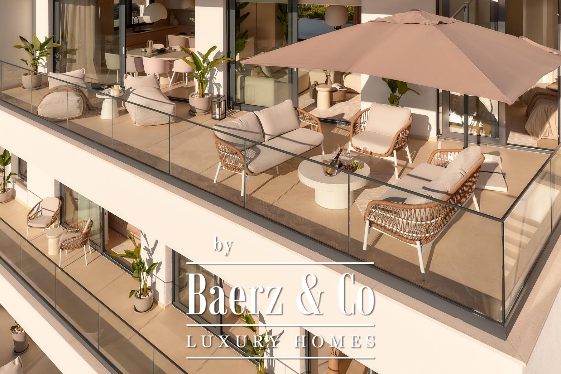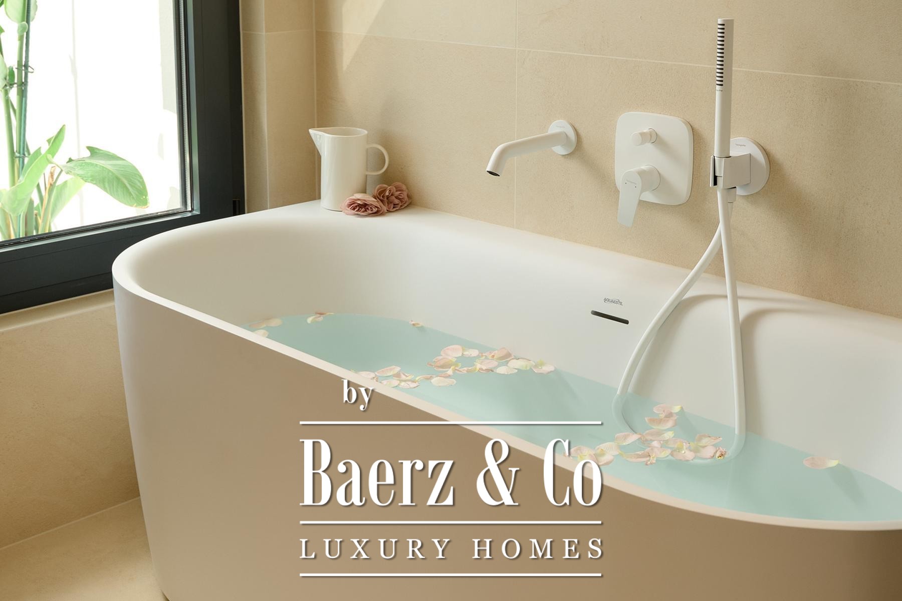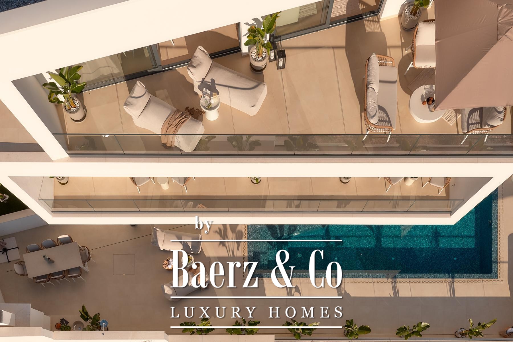 Drie slaapkamers met en-suite badkamers op de begane grond bieden direct toegang tot een loggia van 18,8 m². De privé garage van 31 m² is voorzien van een laadpunt voor elektrische voertuigen. Op de eerste verdieping bevindt zich een riant woonvertrek van 52 m², aangevuld met een vierde slaapkamer, een extra badkamer en royale terrassen, allemaal georiënteerd op de glinsterende horizon.