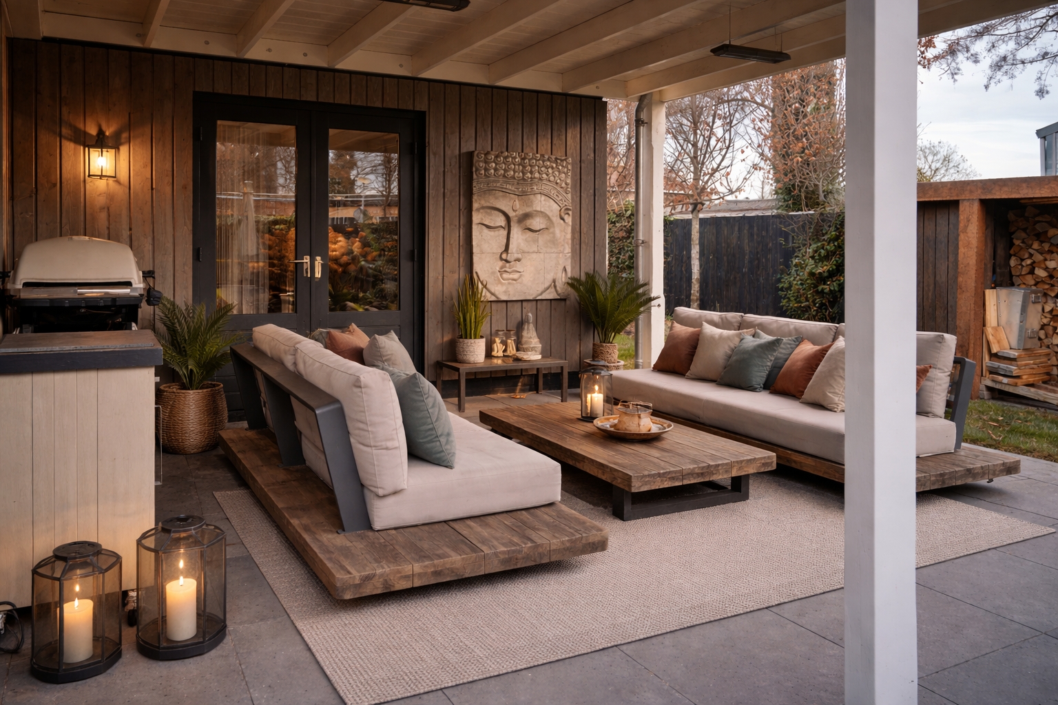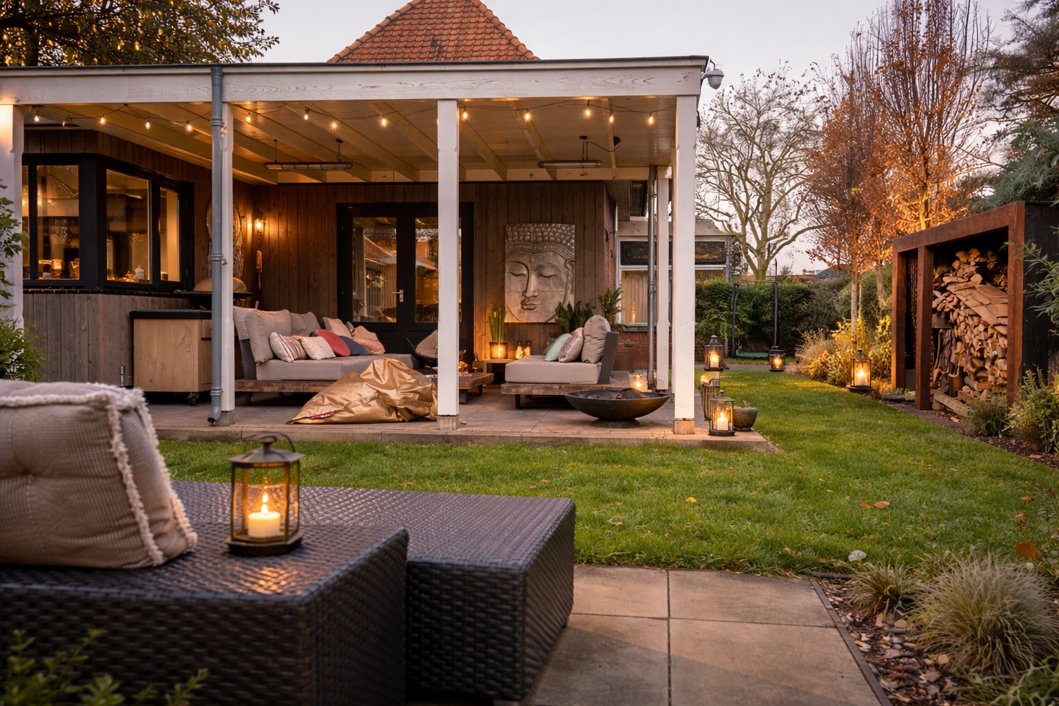 Просторное вспомогательное здание площадью 74 м² ныне используется как фотостудия, но может легко быть переоборудовано в гостевой дом, офис или творческое пространство. Его панорамное остекление и зимний сад наполняют помещение естественным светом, создавая атмосферу спокойствия для работы или жизни. Преимущества включают профессионально благоустроенный сад с вековыми деревьями, крытую веранду, просторный навес для авто, встроенные кладовые и зону хранения дров с отделкой из стали Corten.