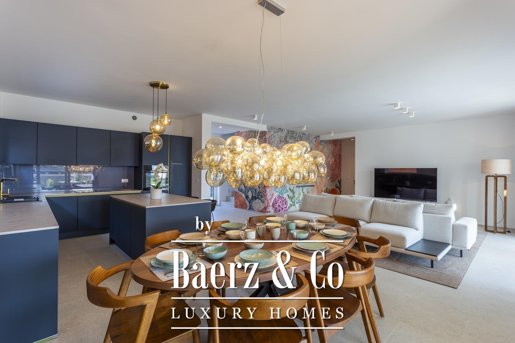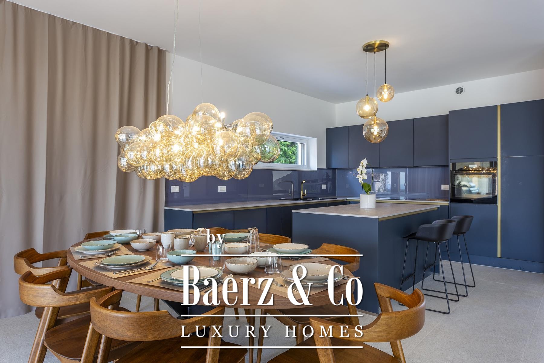 В открытой гостиной объединены столовая и полностью оснащённая кухня с техникой ведущих мировых брендов. Дизайнерская мебель ручной работы создана специально для виллы, обеспечивая комфорт и прямой вид на море. Панорамное остекление наполняет пространство дневным светом и влечёт на просторную крытую террасу — идеальное место для приёма гостей, окаймлённое ухоженным садом, бассейном площадью 30 м² и дополнительными морскими видами. Открытый барбекю расширяет гастрономический арсенал на свежем воздухе.