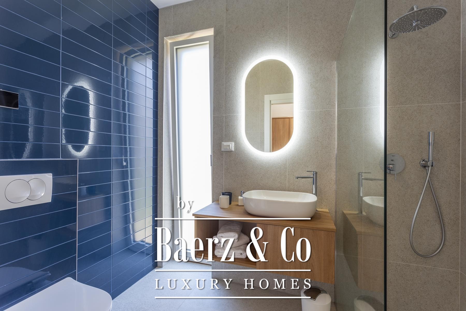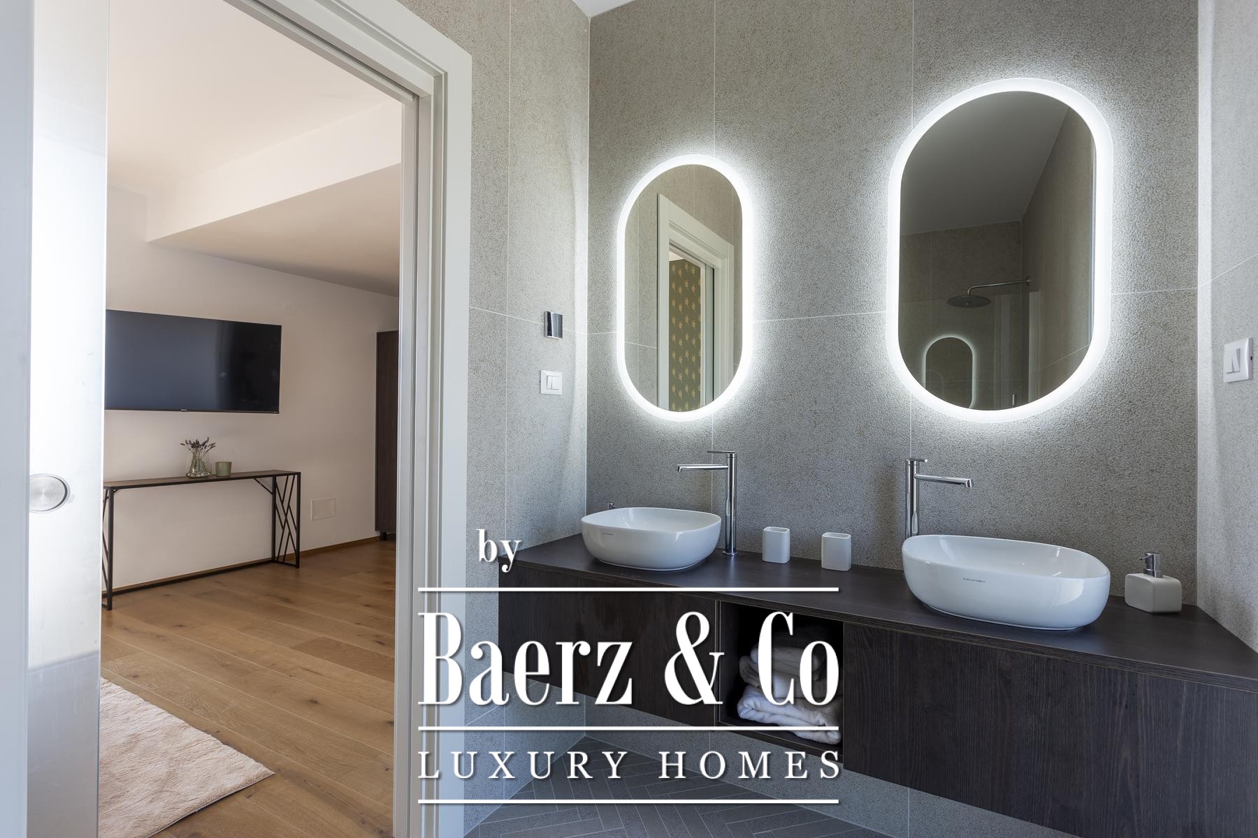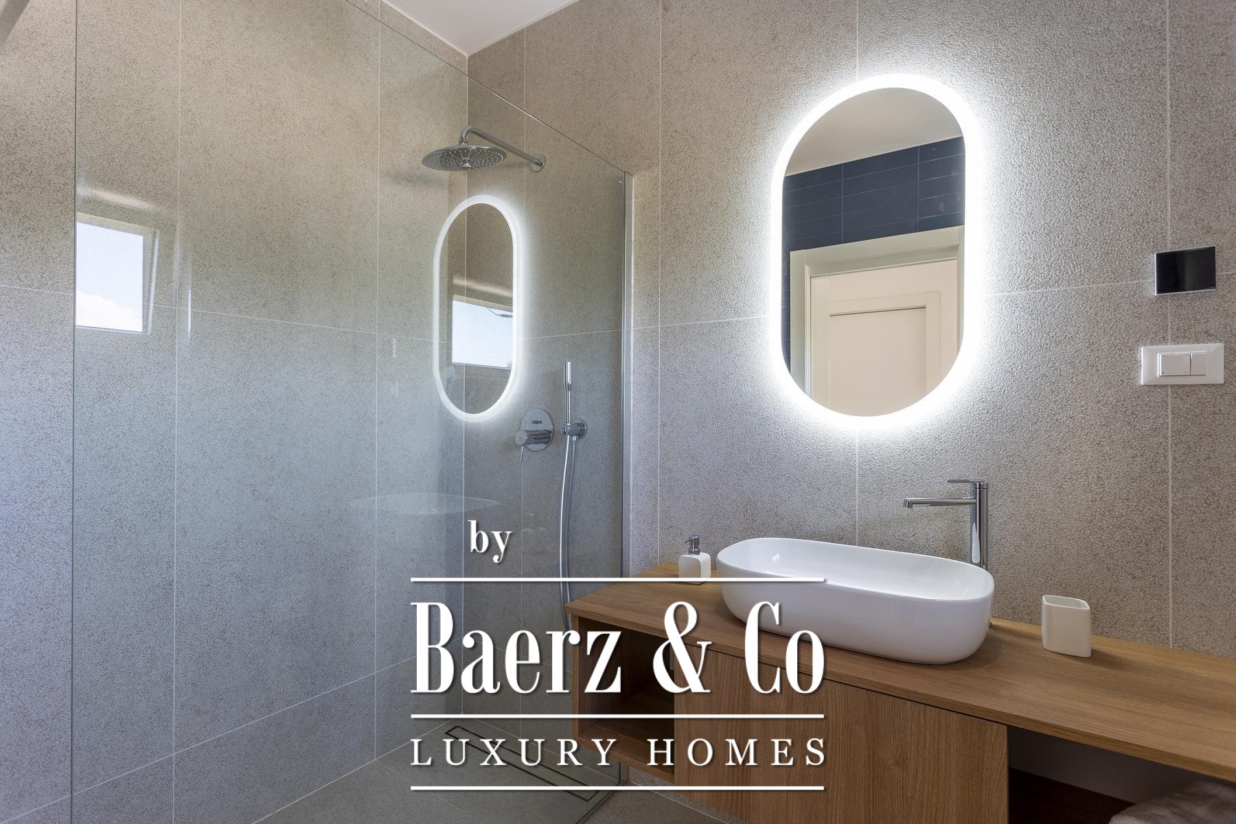 В приватной части первого этажа находятся спальня с ванной комнатой, техническое помещение и кладовая. По внутренней лестнице — три дополнительные спальни, каждая c собственной ванной и выходом на большую террасу с видом на Адриатику, предусмотрена возможность установки джакузи в будущем. Тёплые полы, паркет премиум-класса и элитная керамика формируют исключительную жилую среду. В каждой комнате предусмотрен кондиционер.