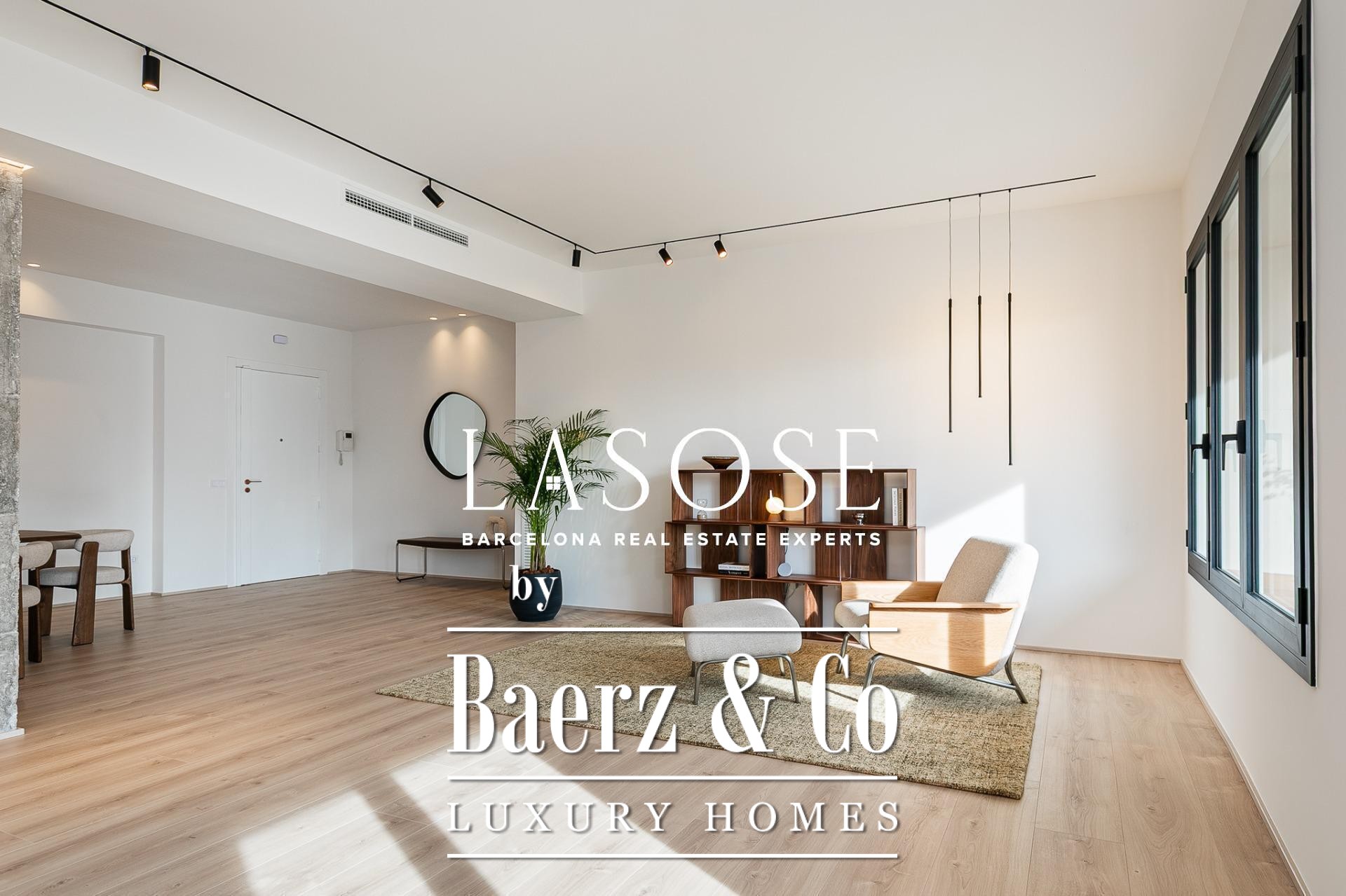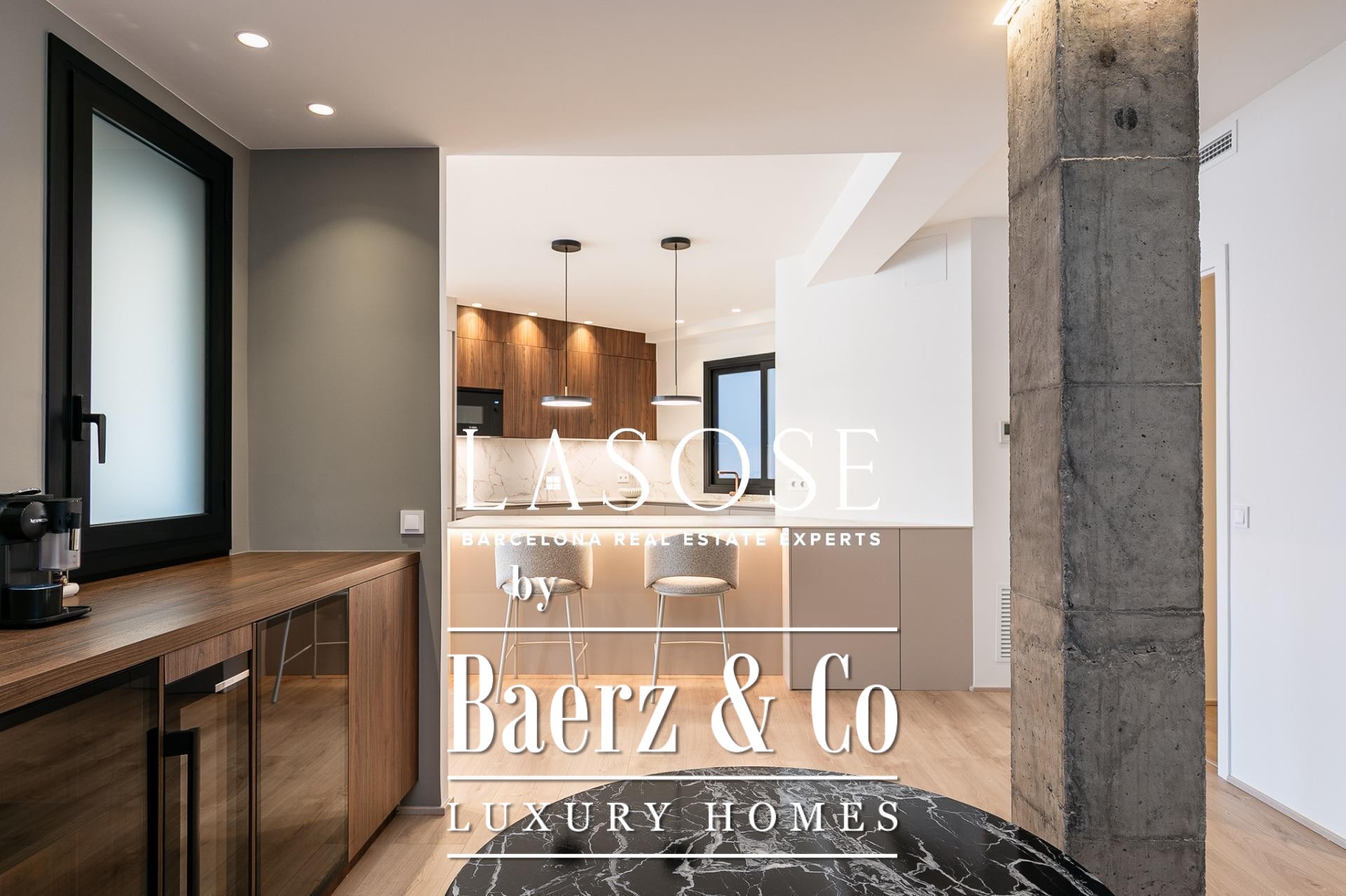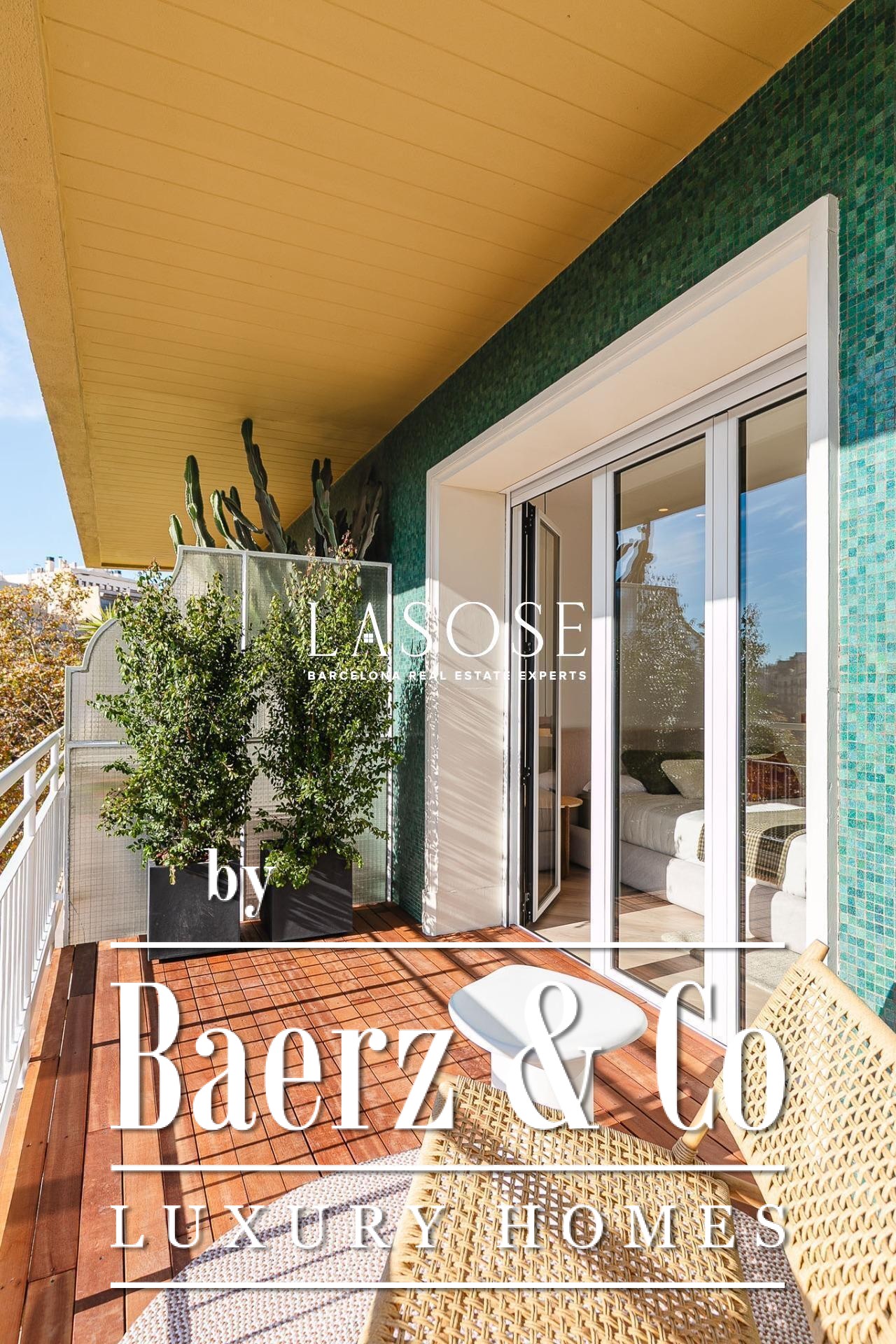 Апартаменты полностью отреставрированы с использованием премиальных материалов. Естественный свет проникает сквозь широкие окна, выходящие на юго-восток, наполняя интерьер светом и выделяя просторную открытую зону гостиной-столовой площадью 90 м². Отсюда двери ведут на угловую панорамную террасу с видом на зелёные бульвары и Plaça Mossèn Jacint Verdaguer. Кухня Santos, оснащённая техникой Bosch, сконцентрирована вокруг острова с интегрированным винным шкафом и кофейной зоной, которую дополняет кладовая для скрытого хранения.