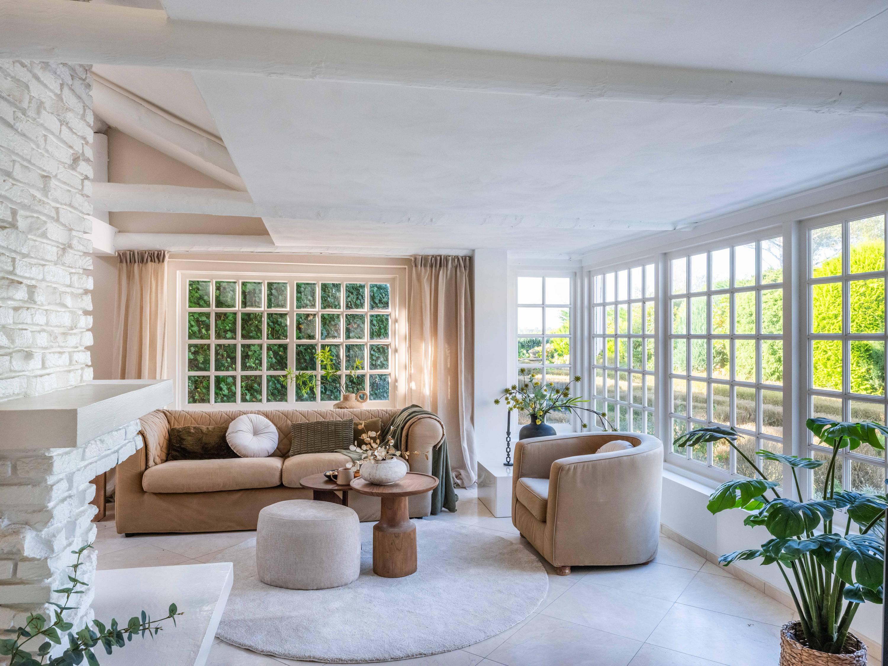 Гостиная оформлена с акцентом на камин с газовым топливом, открытые балки и витражные окна, подчеркивающие исторический стиль виллы. Высокие потолки наполняют пространство дневным светом; примыкающая кухня оборудована встроенной техникой и переходит в хозяйственное помещение с современными удобствами. На верхнем этаже главная спальня выходит на просторную террасу на крыше, где можно наблюдать закаты над сельской местностью. Ванная комната на втором этаже, обновлённая в 2018 году, оснащена ванной, душем с легким входом и двумя раковинами.