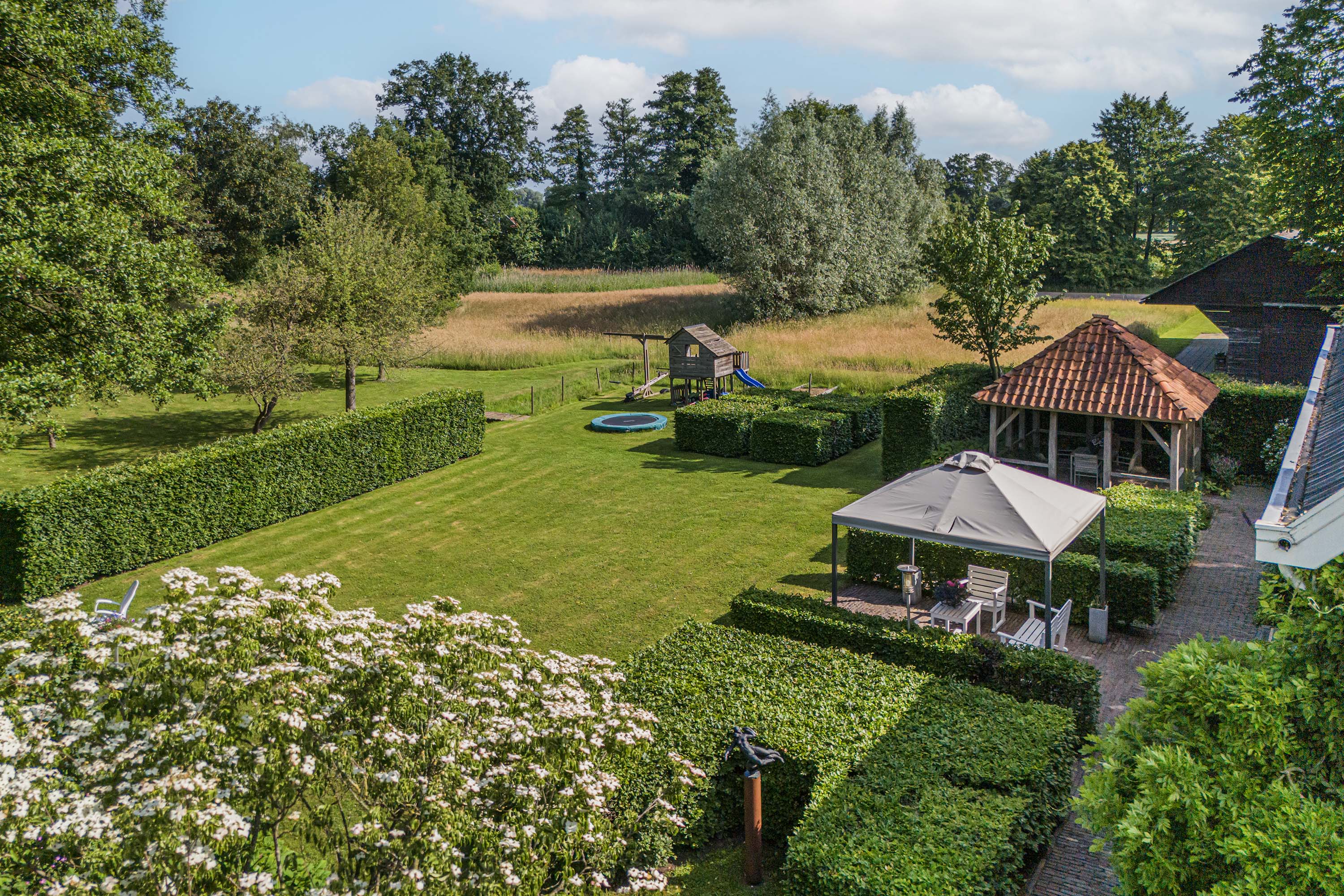 Ландшафтный архитектор Piet Oudolf спроектировал территорию как череду уютных садовых пространств, лугов и фруктовых садов. Через участок проходят живописный водоём и сад, привлекая оленей и другую дикую природу. 28 солнечных панелей, гибридное отопление и изоляция класса A повышают экологическую эффективность. Woonboerderij Haaksbergen — редкая ферма для Нидерландов — предлагает исключительную приватность, универсальность и близость к инфраструктуре, с удобным сообщением с Энсхеде, Хенгело и Алмело.
