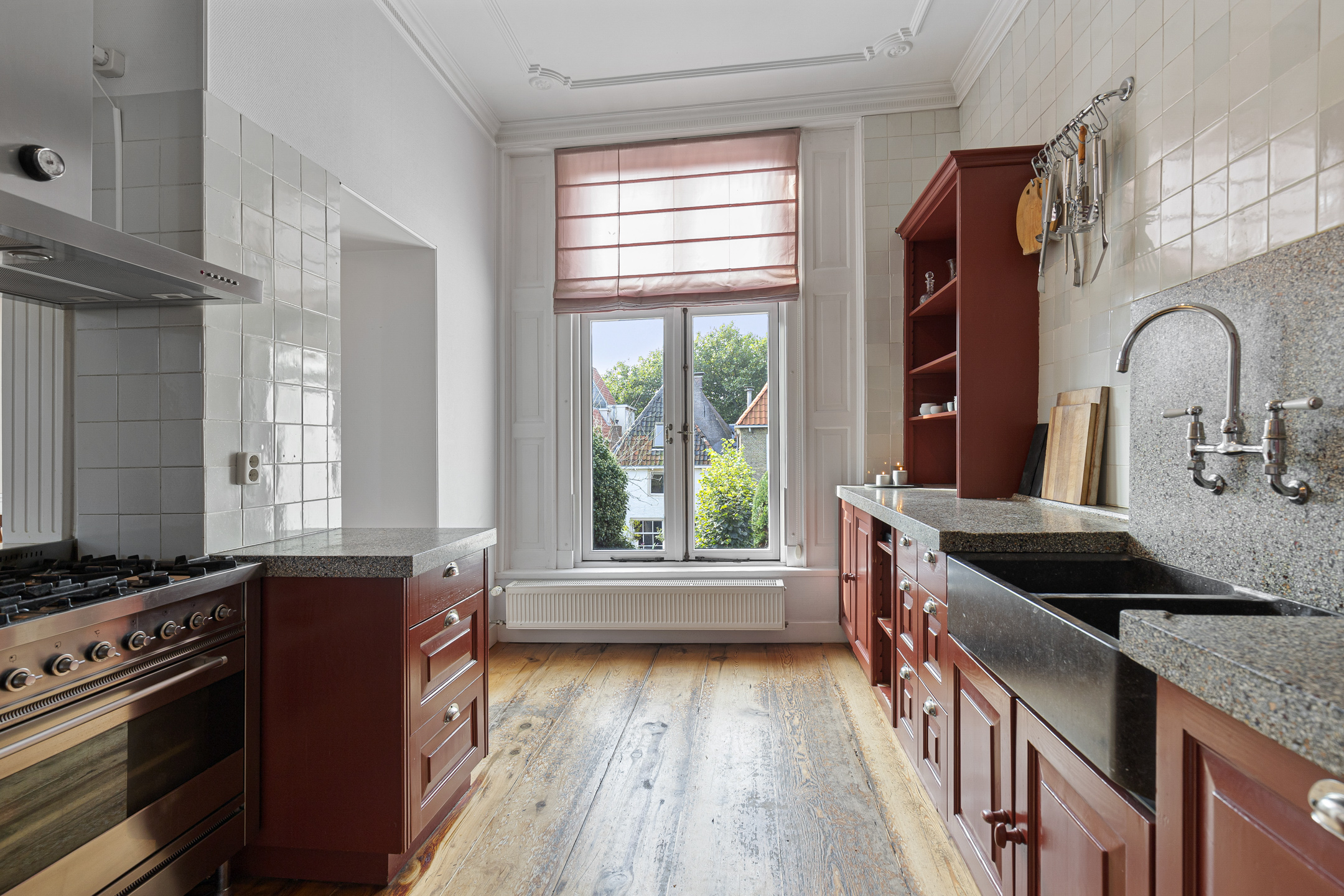 На бельэтаже находится изысканный кабинет с видом на воду и просторная садовая комната с выходом в частный сад города, обращённый на юг. Гостиная и столовая организованы с уважением к историческим деталям—декоративные потолки, антикварные деревянные полы, мраморные камины и аутентичная кухня, украшенная традиционной фризской плиткой. Крыша была полностью утеплена и обновлена в 2015 году, что позволяет идеально сочетать комфорт с историческим характером дома.
