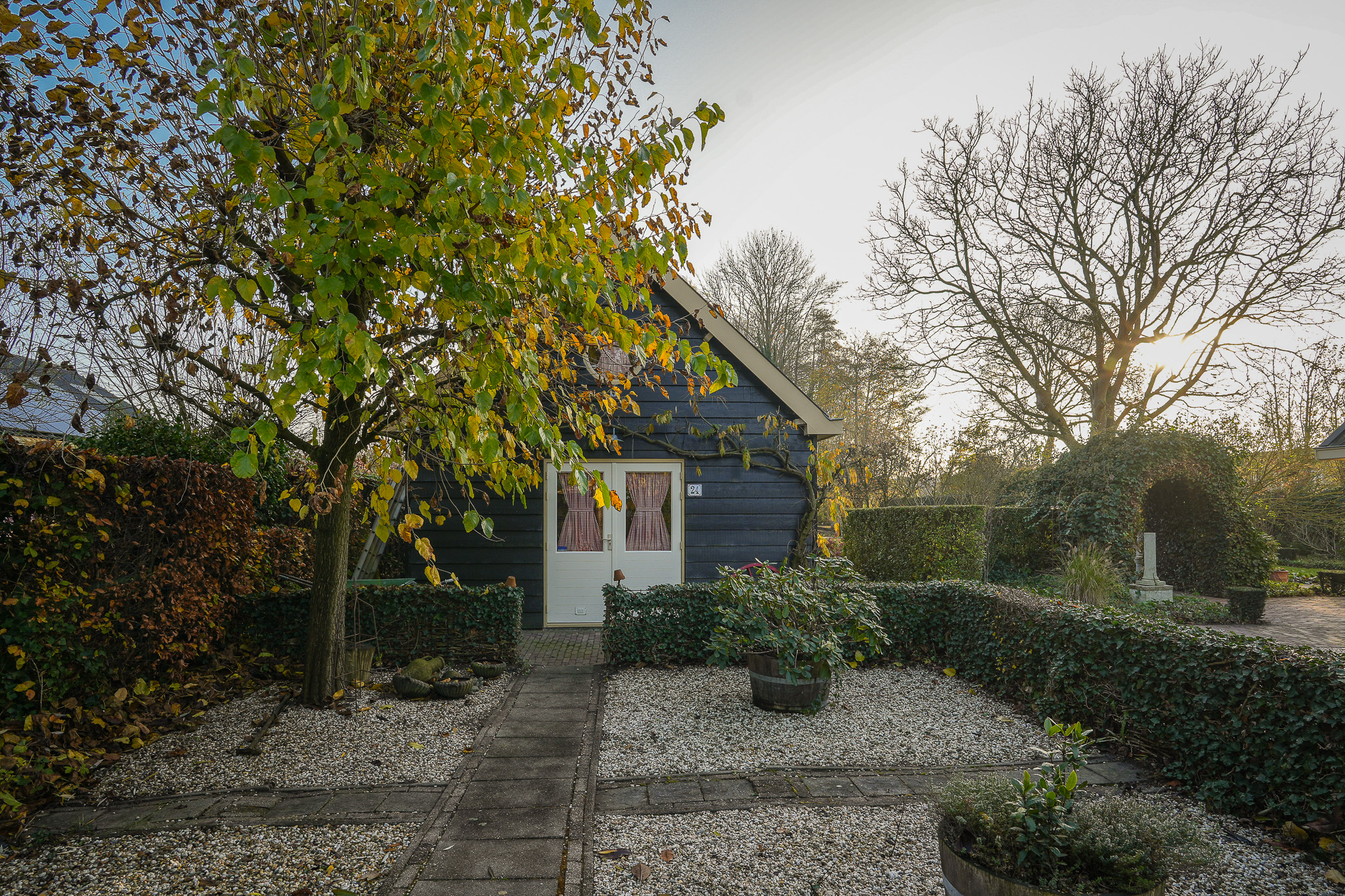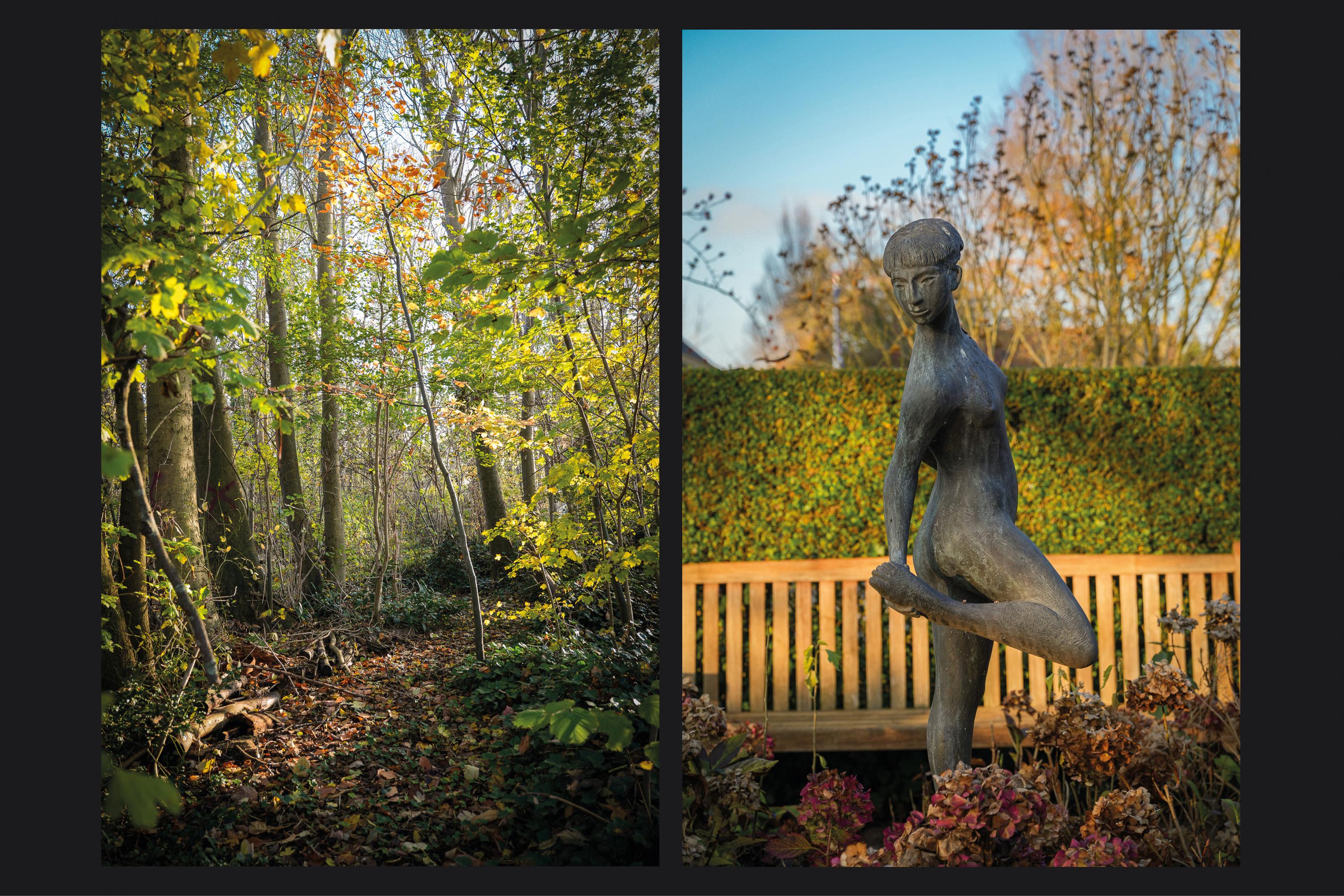 Вне дома пространство обустроено с учетом приватности и экологичности: цветники, зрелые ивы, фруктовый сад с яблоками, грушами, сливами и айвой; лесной пруд создают парк для отдыха, куда часто заглядывает дикая природа. Изолированная постройка с дровяной печью и французскими дверями расширяет диапазон использования — для мастерской, гостиной зоны или спокойного кабинета.