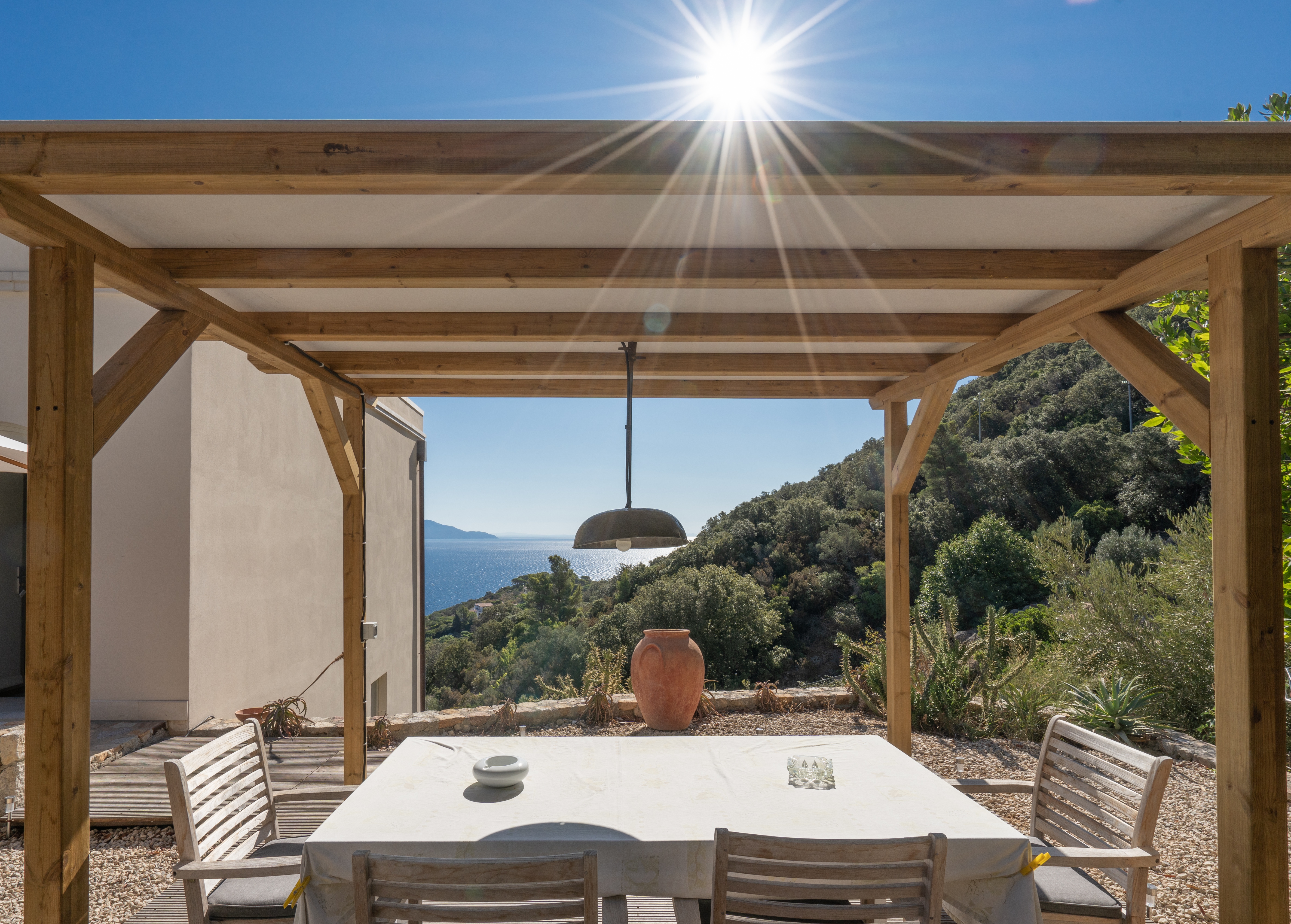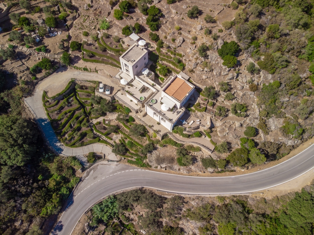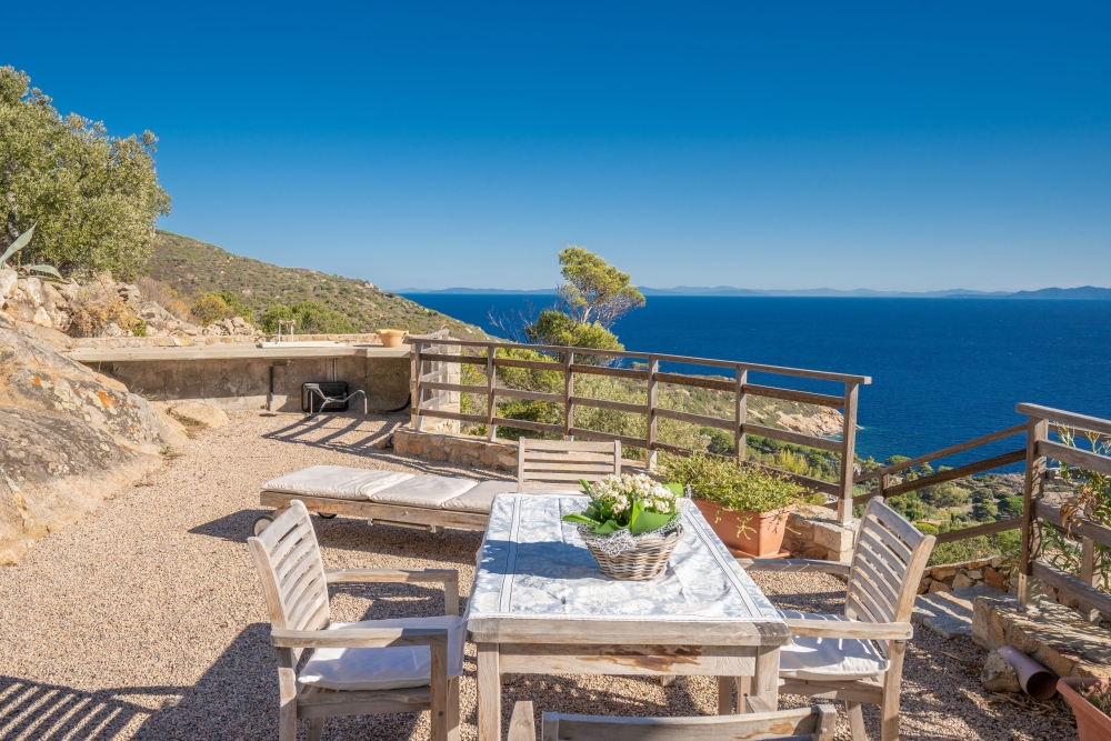Оригинальная вилла, спроектированная в 1950-х годах известным архитектором, в начале 2000-х прошла реставрацию с сохранением подлинности и архитектурной целостности. Террасные сады, средиземноморская флора и зрелые оливковые рощи обрамляют участок площадью 9 000 м², создавая атмосферу уединения и покоя. С основной террасы открываются панорамные виды на бирюзовое море, пляж Arenella, гору Арджентарио и остров Джаннутри.