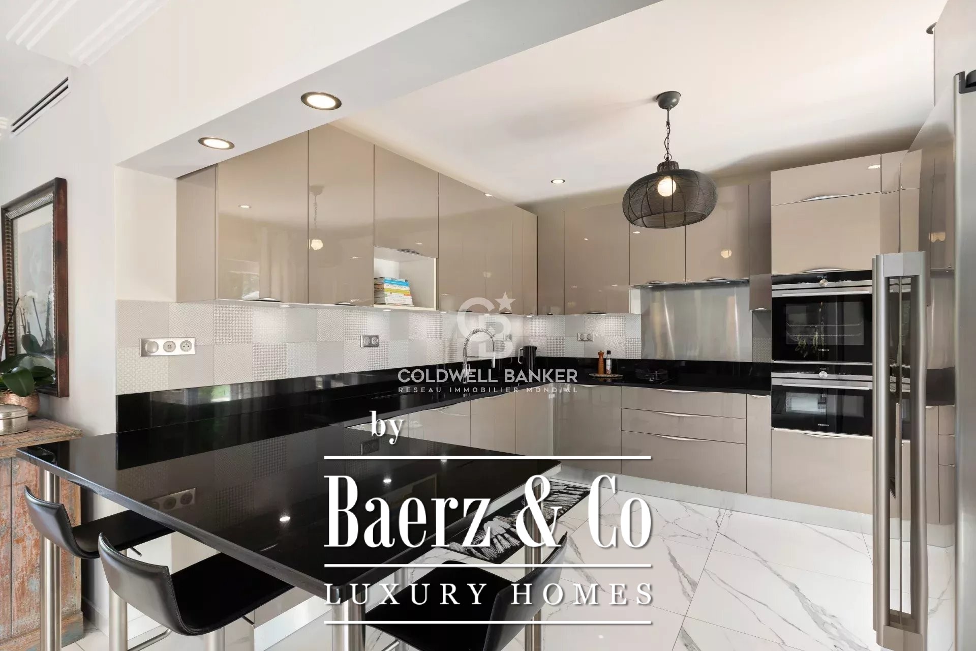 Отдых на свежем воздухе легко перетекает между террасами, подогреваемым бассейном и отдельной летней столовой, расположенными над ухоженной территорией. Комфорт и безопасность обеспечивают кондиционирование воздуха, двойное остекление, системы сигнализации и домофона, автоматические ворота и солнцезащитные маркизы.