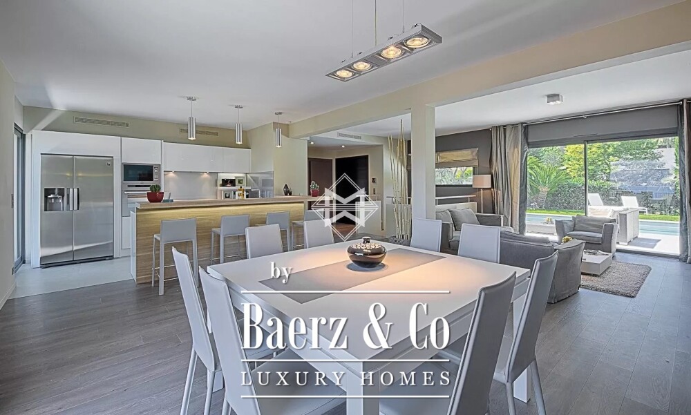Вилла продаётся полностью меблированной и недавно отреставрированной, с изысканными деталями: кондиционирование воздуха, централизованные электрические рольставни, система «умный дом», позволяющая одним движением обеспечить безопасность при уходе. Офис, прачечная и подвал повышают повседневный комфорт и функциональность. На улице — подогреваемый бассейн, служащий центром расслабления с видами на Средиземное море.