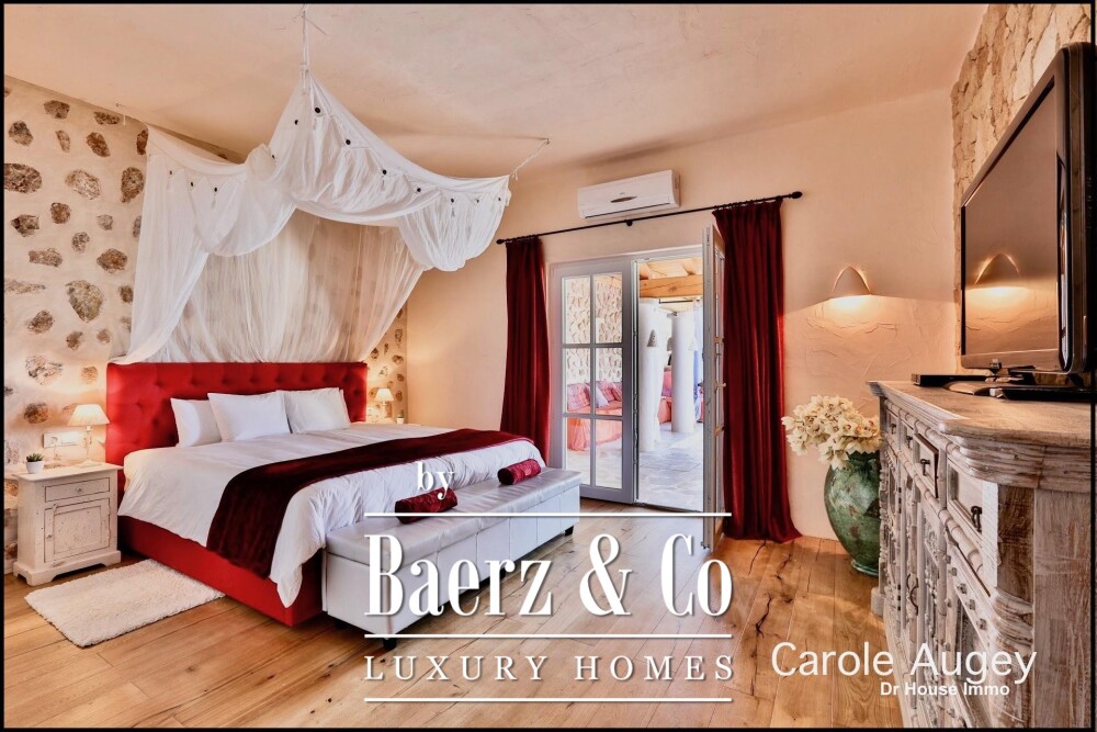 Архитектура вдохновлена средиземноморскими традициями: светлый камень, плавные лестничные пролеты, центральный фонтан — всё это создаёт атмосферу уюта и спокойствия в каждом пространстве. Интерьеры впечатляют просторными гостиными зонами, подходящими как для приватного отдыха, так и для встреч с друзьями. В главной гостиной — современный кинозал и роскошный камин, а полностью оборудованная кухня гармонирует с широкой столовой террасой, тенистыми перголами и подогреваемым инфинити-бассейном.