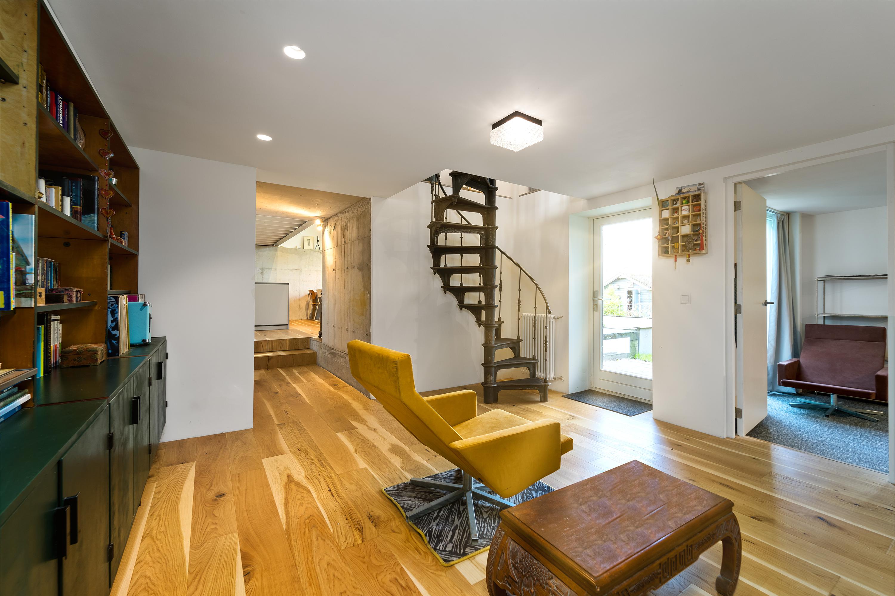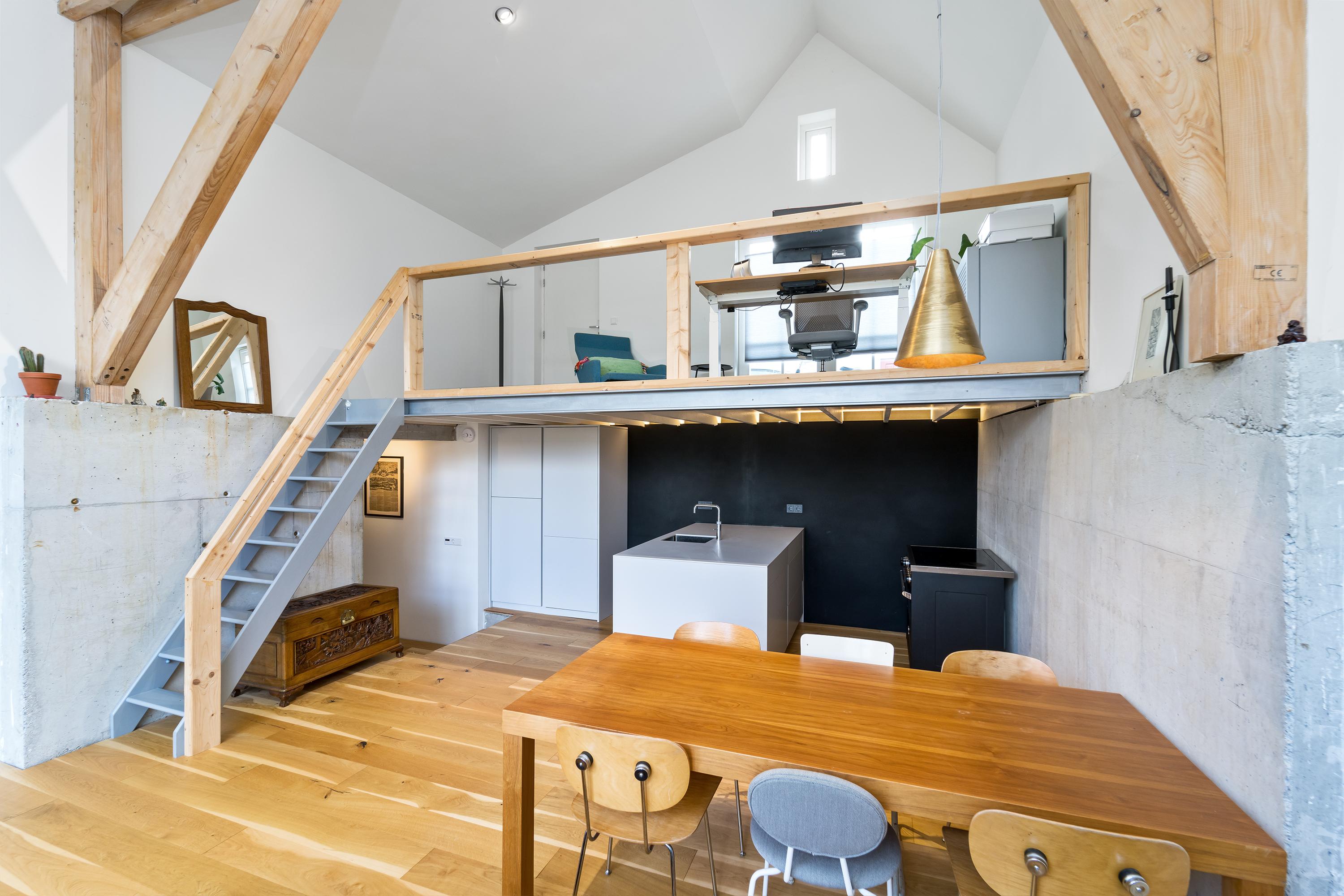 空间体验在主起居区的挑高天花中彰显,夹层书房引入充足光线与创变功能。在这之下,定制厨房凝聚家的核心。橡木地板、裸露木梁、原混凝土与钢材等现代材料,相互对比又协调,营造出饱含触感的生活氛围。全屋自动化系统与节能LED照明贯穿每一处细节,双层玻璃与三重保温层带来稳妥舒适感受。
