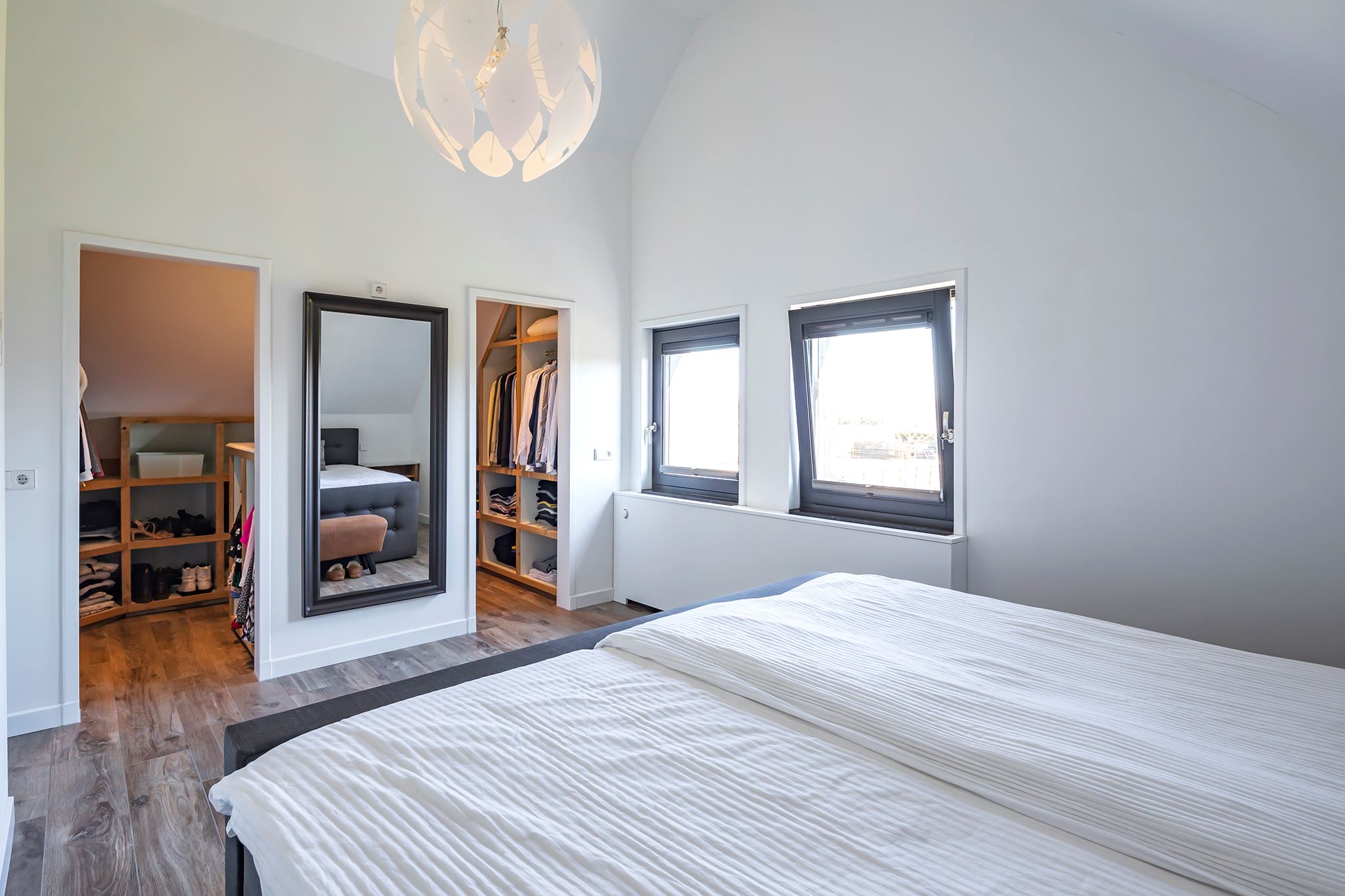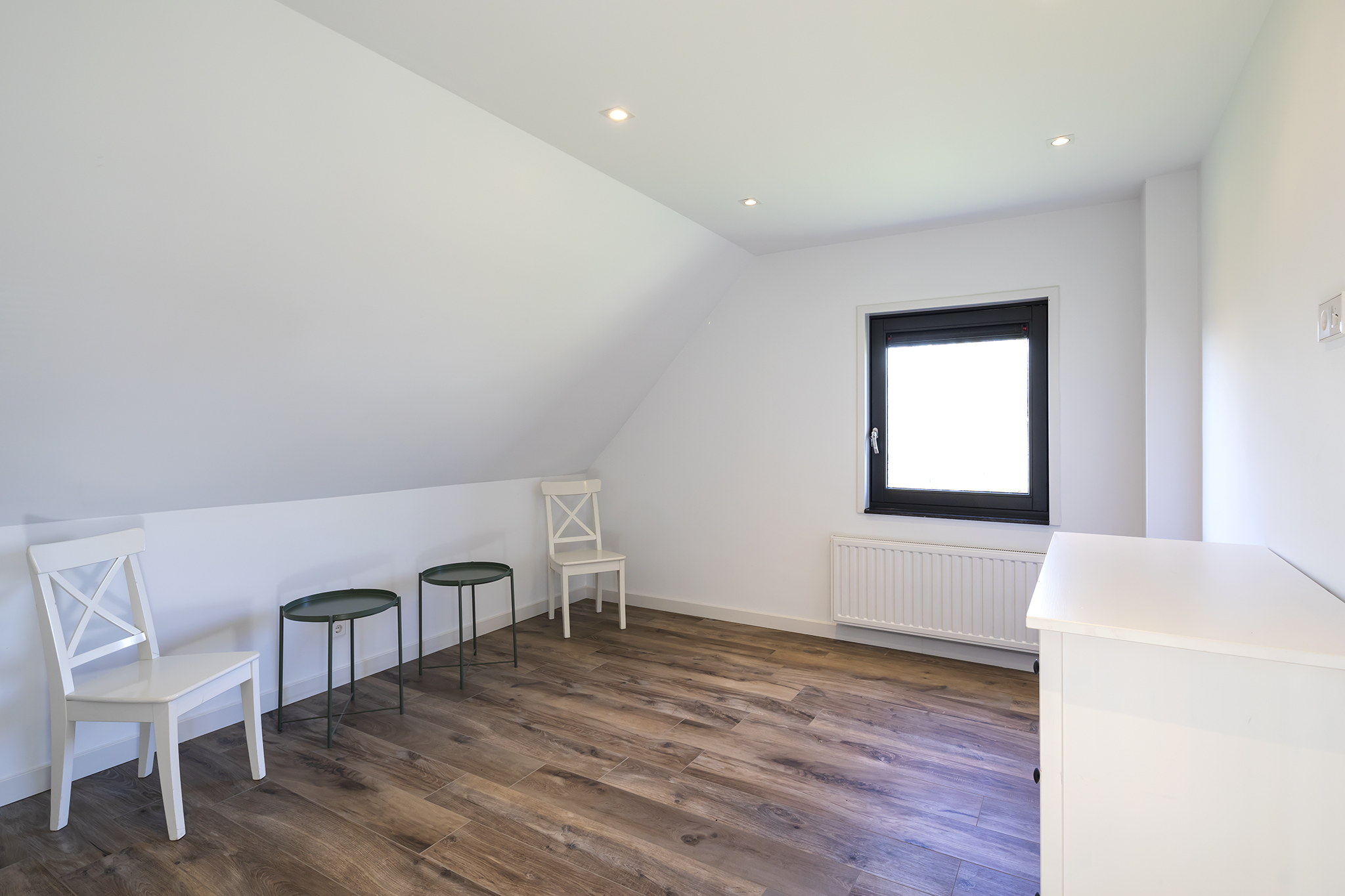楼上分布三间卧室,主套房配有花园景观及步入式衣帽间,浴室设转角浴缸、步入式淋浴和天窗自然采光。隔热且供暖的地下室可作为家庭影院或办公空间灵活使用。实用细节包括28平方米储藏室、宽敞车棚、A级能效、23块太阳能板、光纤网络、HR++玻璃及全屋保温。地理位置兼备静谧与便捷,轻松畅达奥斯特韦克各项配套及Kampina自然保护区。