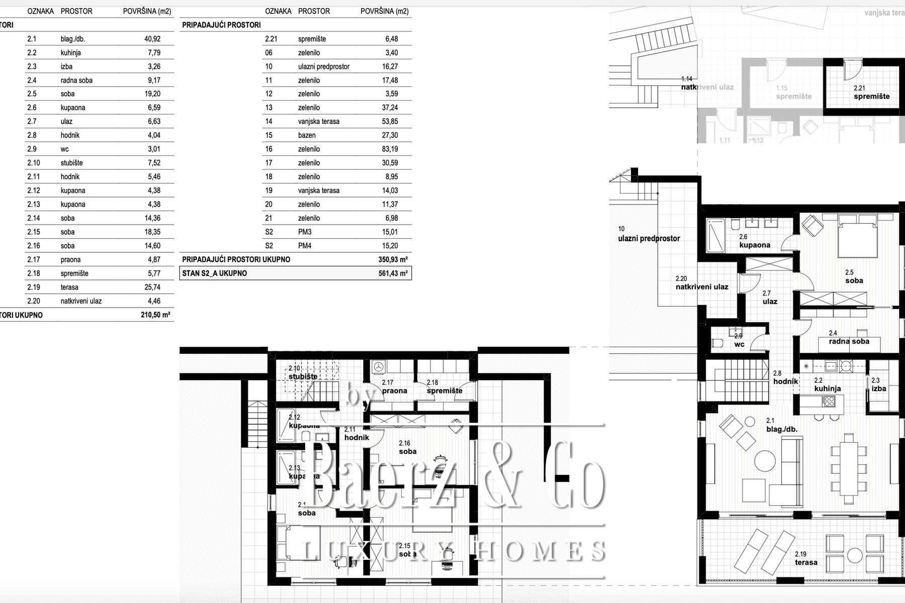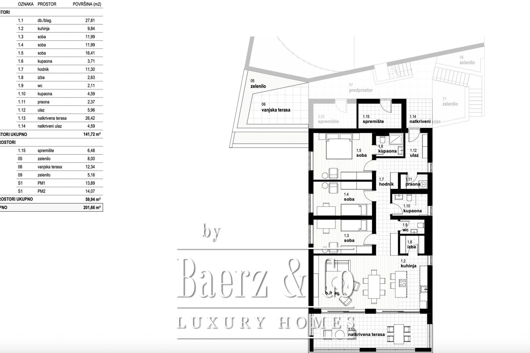 每间卧室比例精致,面积从9.17平方米至19.20平方米不等,并配有实用功能空间,包括步入式衣帽间、洗衣房、储藏室和独立储物间。三间浴室与一间客用卫生间共同为家人和来宾提供舒适体验。户外设有覆盖面积达25.74平方米的露台及另外两处露台,与园林化花园和私人泳池自然衔接,安静赏景,俯瞰Kvarner海岸的粼粼波光。