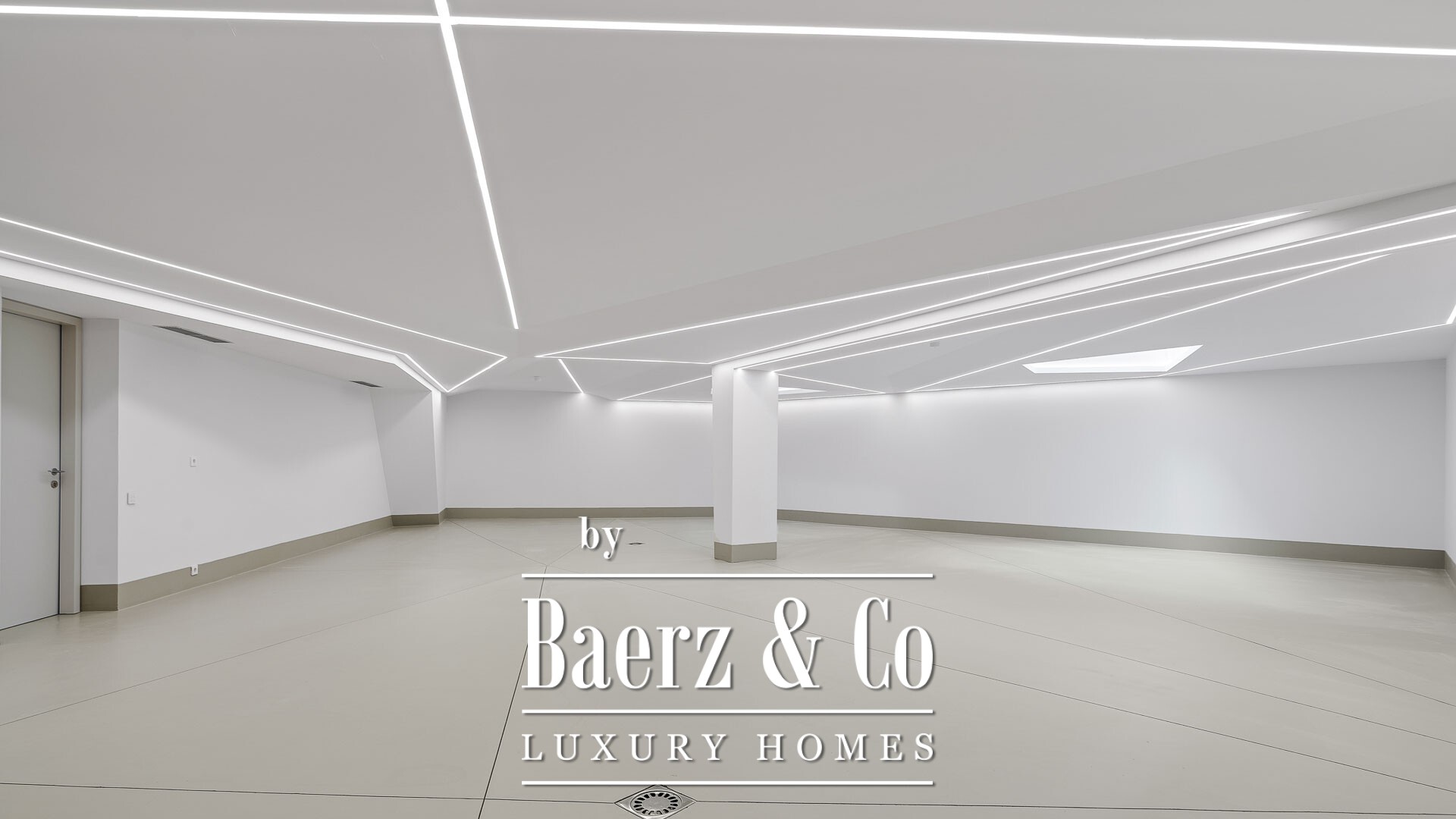 别墅共三层,通过私人电梯连接。室内以充满自然光的迎宾大厅引领入内。开放式起居与餐饮空间衔接半开放式厨房,并自然延展至露台,尽享地中海无遮挡美景。主层拥有一间主人套房,带来宁静私属的居住体验,邻近的办公室环水而立,挑高设计营造静谧办公氛围。地下层同样采光充足,设有可容纳五辆车的车库、一间额外卧室及可灵活转换为健身房、桑拿或视听室的空间。