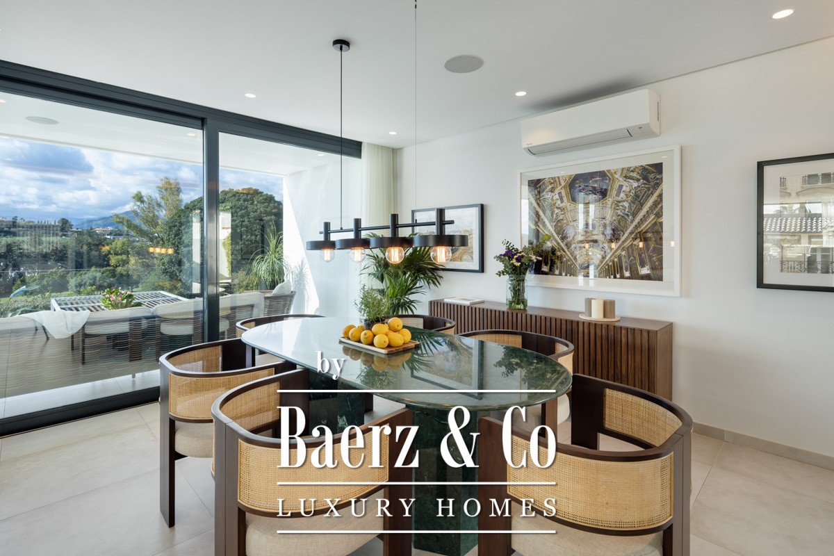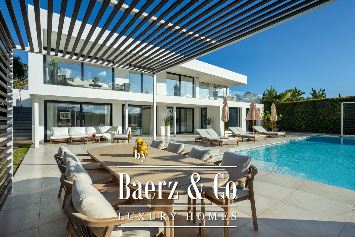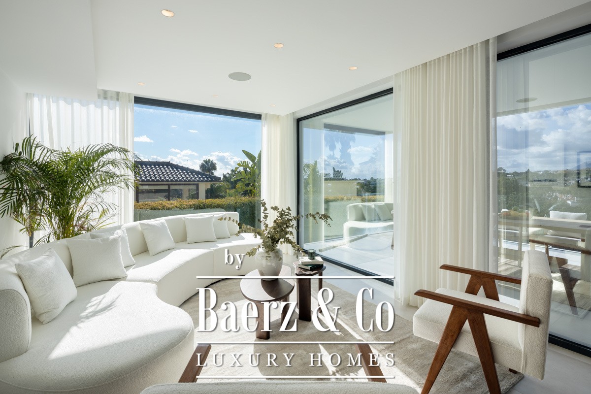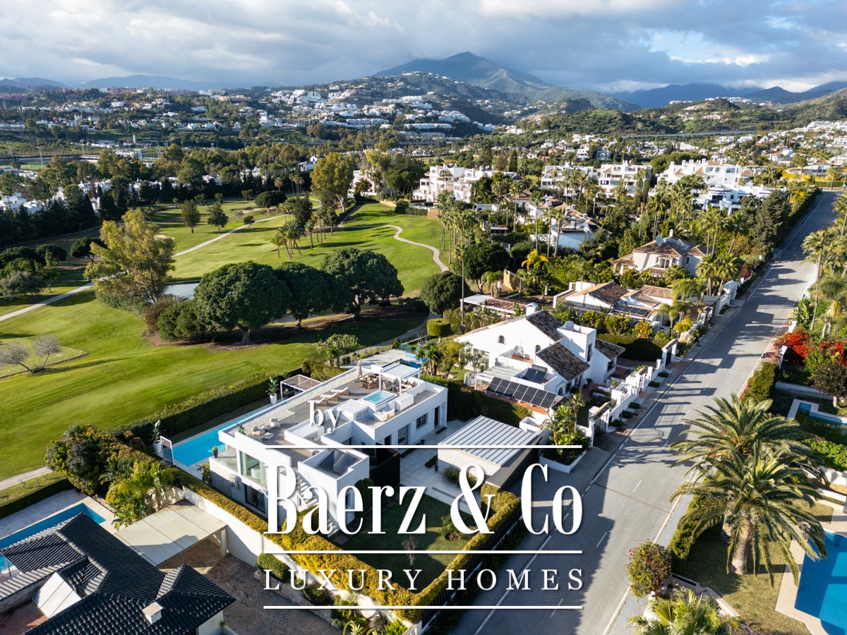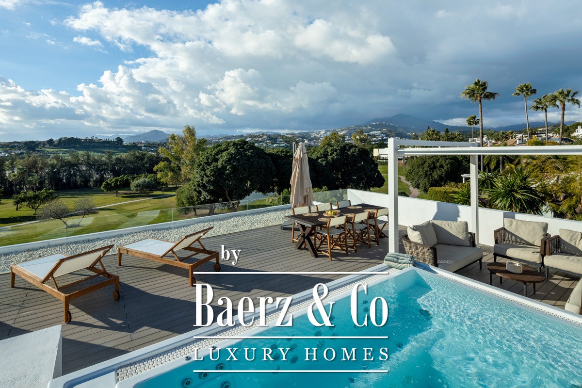 Marbella前线高尔夫Nueva Andalucía别墅,完美契合了现代设计与尊贵地段的稀有融合。这座现代化六卧四卫别墅,建筑面积342平方米,位于1090平方米的用地上。阳光充盈开阔的开放式空间,每一条线条与表面都展露出精致品味。私家露台自然延展,框景高尔夫球场及环绕山峦。日光浴区配备按摩浴缸,邀您静享悠然午后,私人泳池与烧烤露台则为社交聚会或安静休憩提供理想场所。
