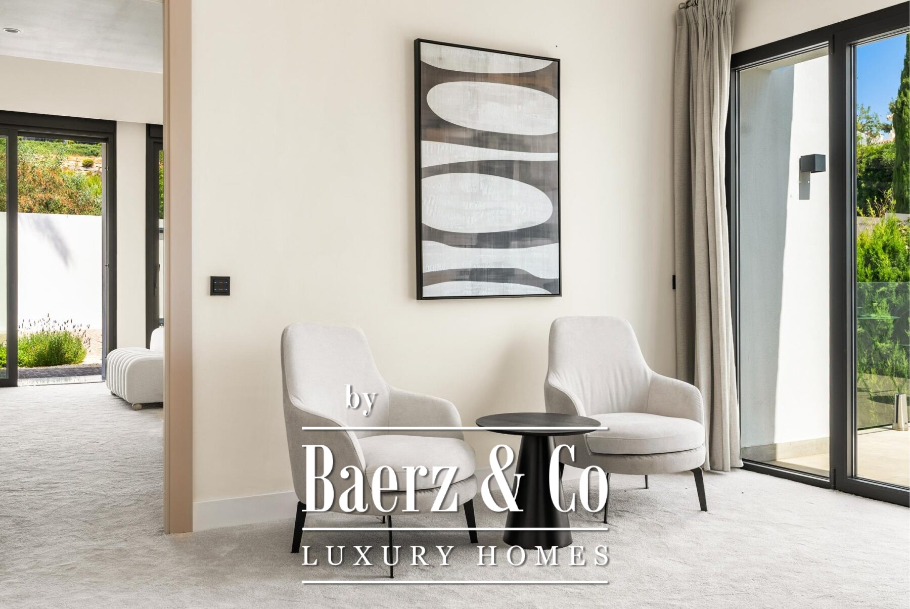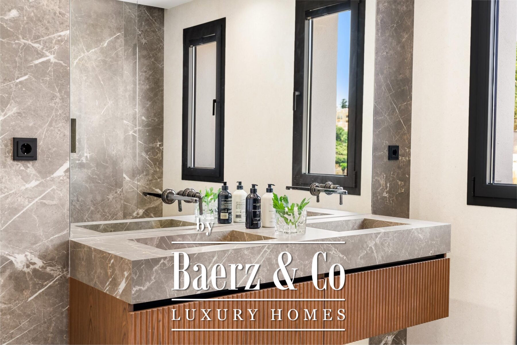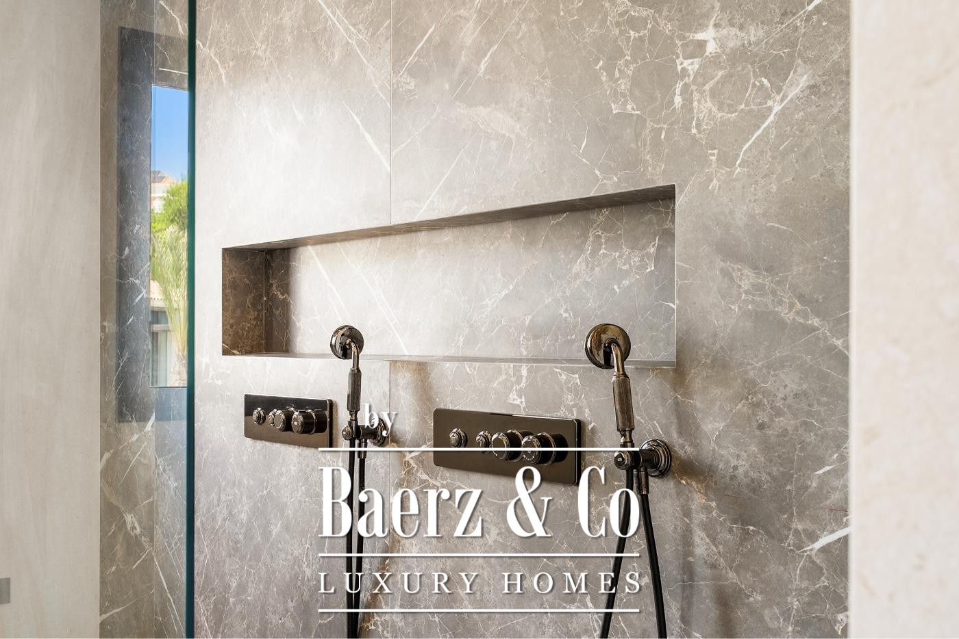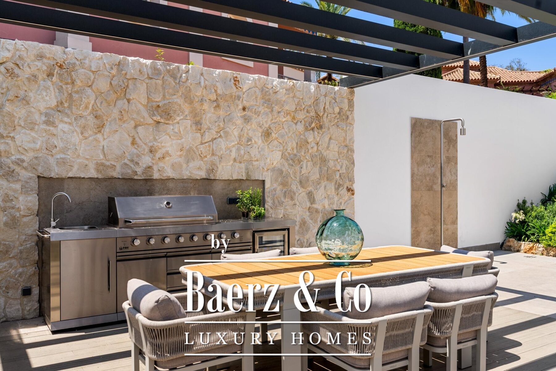 卫浴空间选用Gessi龙头及大规格意大利瓷砖精致铺设。户外园林环绕加热式咸水泳池及全年宜人的露台,户外小厨房和烧烤区增添生活情调。别墅配备三车位车库,额外车道停车位,并拥有24小时安保的私密社区。高尔夫、海景与山景交汇,成就宁静背景;毗邻Marbella丰富配套和海滩,生活便捷畅达。此Marbella待售别墅缔造精致家庭生活的新典范。