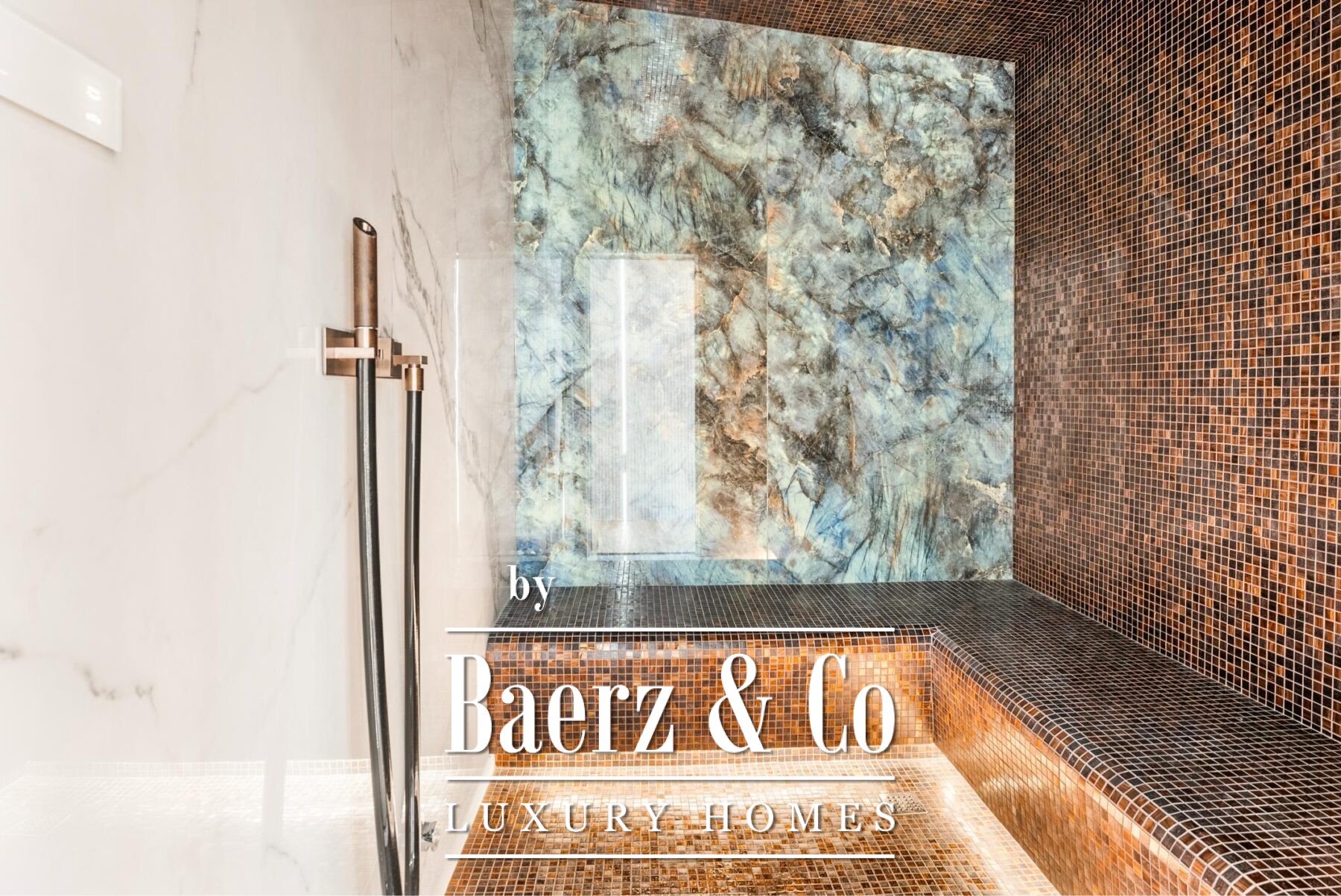 主层集成了优雅的起居与用餐空间,配备高端Gaggenau厨房,并采用意大利木工工艺,彰显品质与匠心。六间带独立卫浴的卧室巧妙布局,营造静谧的私密休憩天地。宽敞的书房可作为灵活空间,轻松改造为第七间卧室。下层则丰富了休闲与娱乐体验,设有第二起居区及简易厨房、影音室、带桑拿和淋浴的健身房,以及独立洗衣区。
