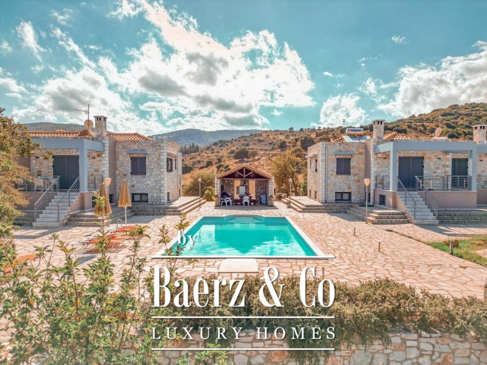 卧室布局多样:其中两栋别墅设有两间主卧与一间浴室,另外两栋则配有三间卧室(包括主卧)及两间浴室。整体共六间卧室、十二间浴室,静谧守护舒适与私密。安防报警、独立暖气、风机盘管系统、空调与太阳能热水装置均巧妙集成,彰显现代生活便利。该别墅群距离 Astros 11 公里,距海岸 15 公里,至纳夫普利奥 44 公里,是一处静谧的度假圣地并享有优越通达性。对于寻求在 Oreini Meligou 购置奢华别墅的人士而言,这片私属领地是克制优雅与投资价值的典范。