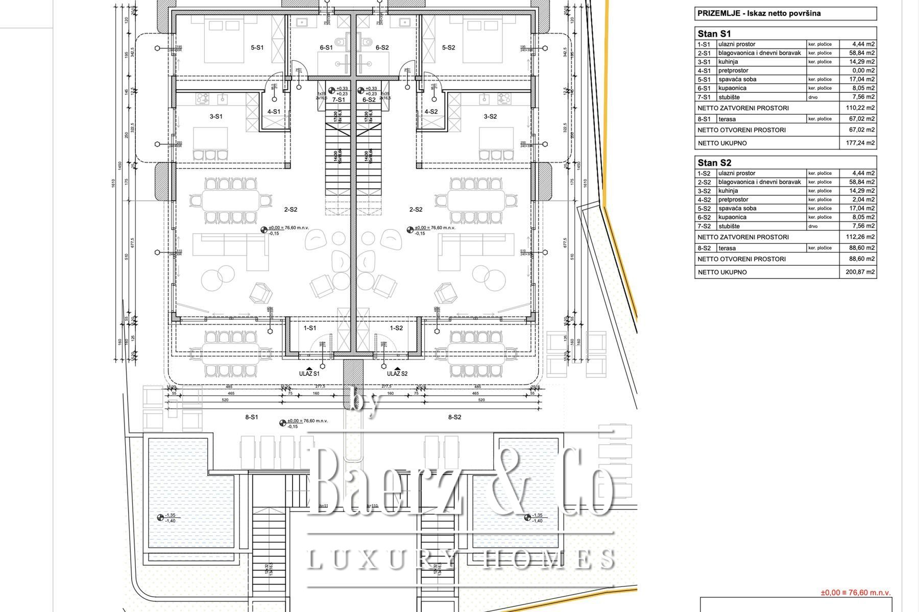 这座半独立别墅位于经过精心规划的Primošten度假村中,总建筑面积为473.04平方米,分三层布局。住宅融合功能性与建筑美学,设有四间卧室和四间浴室,确保日常生活流畅且私密。底层为宽敞的车库,可停放三辆车辆,并配有储藏室、洗衣房及泳池设施,充分体现实用本质。