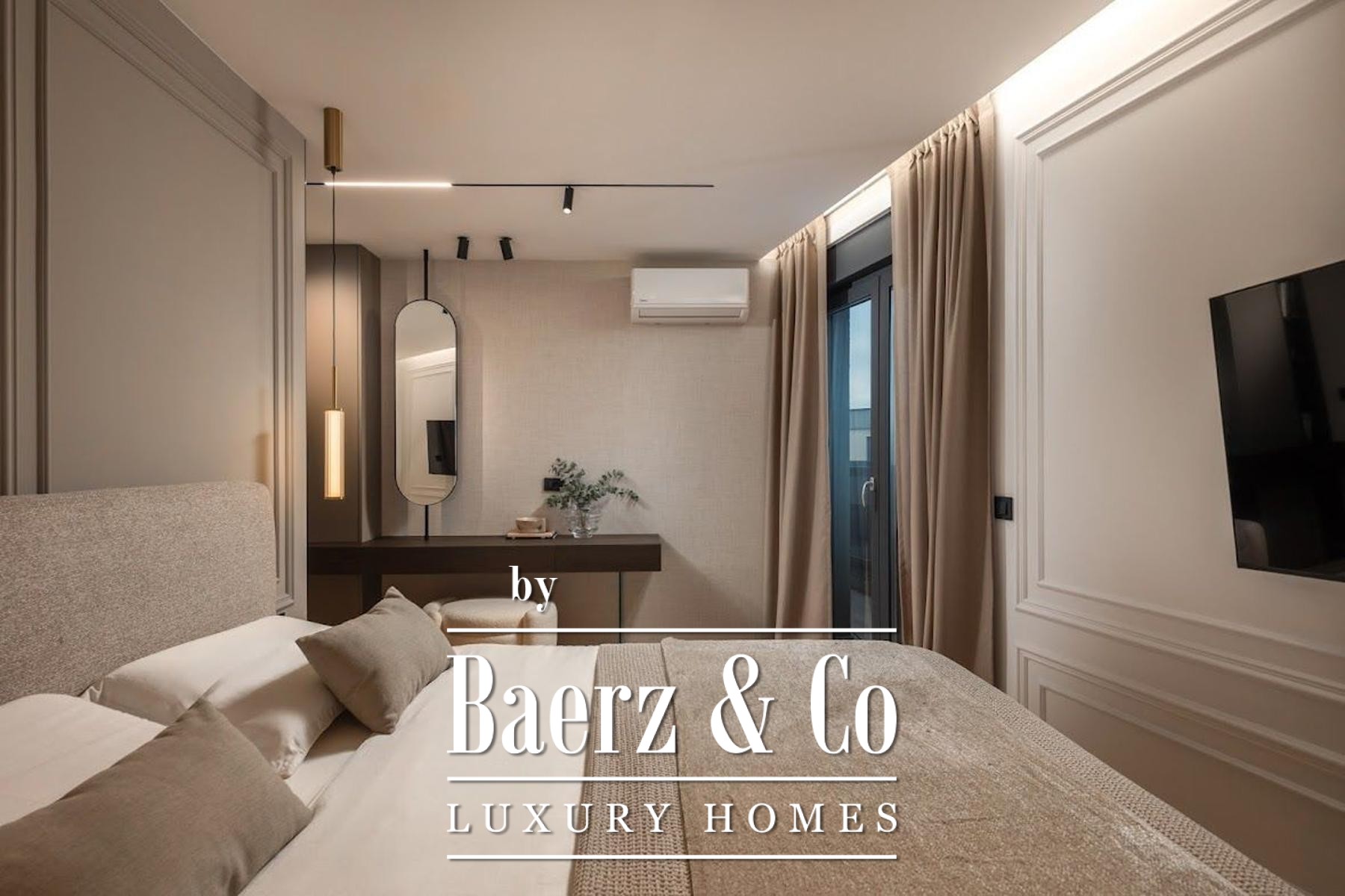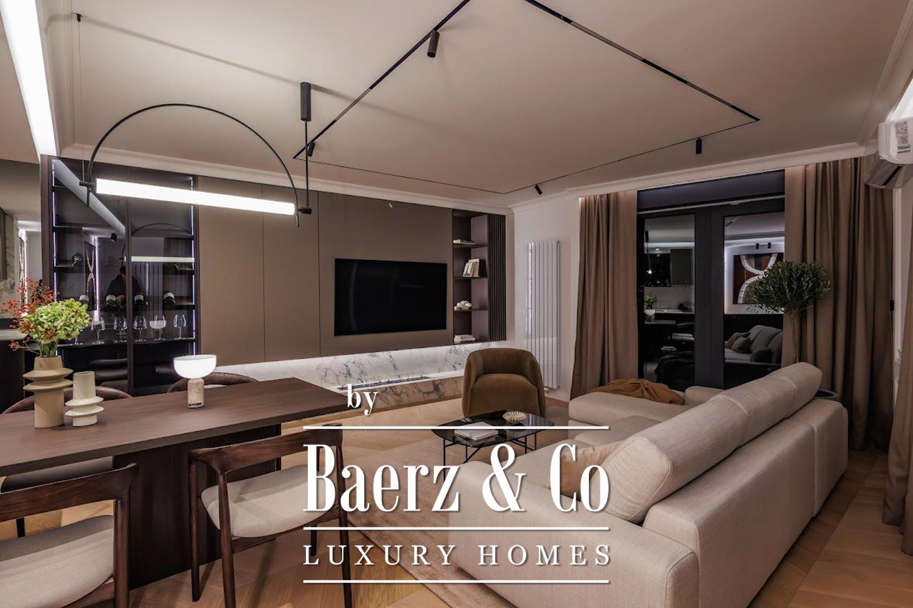 现代生物乙醇壁炉营造起居室亮点,主卧套房配有宽敞步入式衣帽间、触控照明及甄选家具。所有房间皆通往环绕式露台,自然流通与户外空间完美融合。更有13.10平方米储藏间、设计师厨房搭载高端家电、65英寸三星Frame电视、红酒柜及定制艺术装置等亮点。