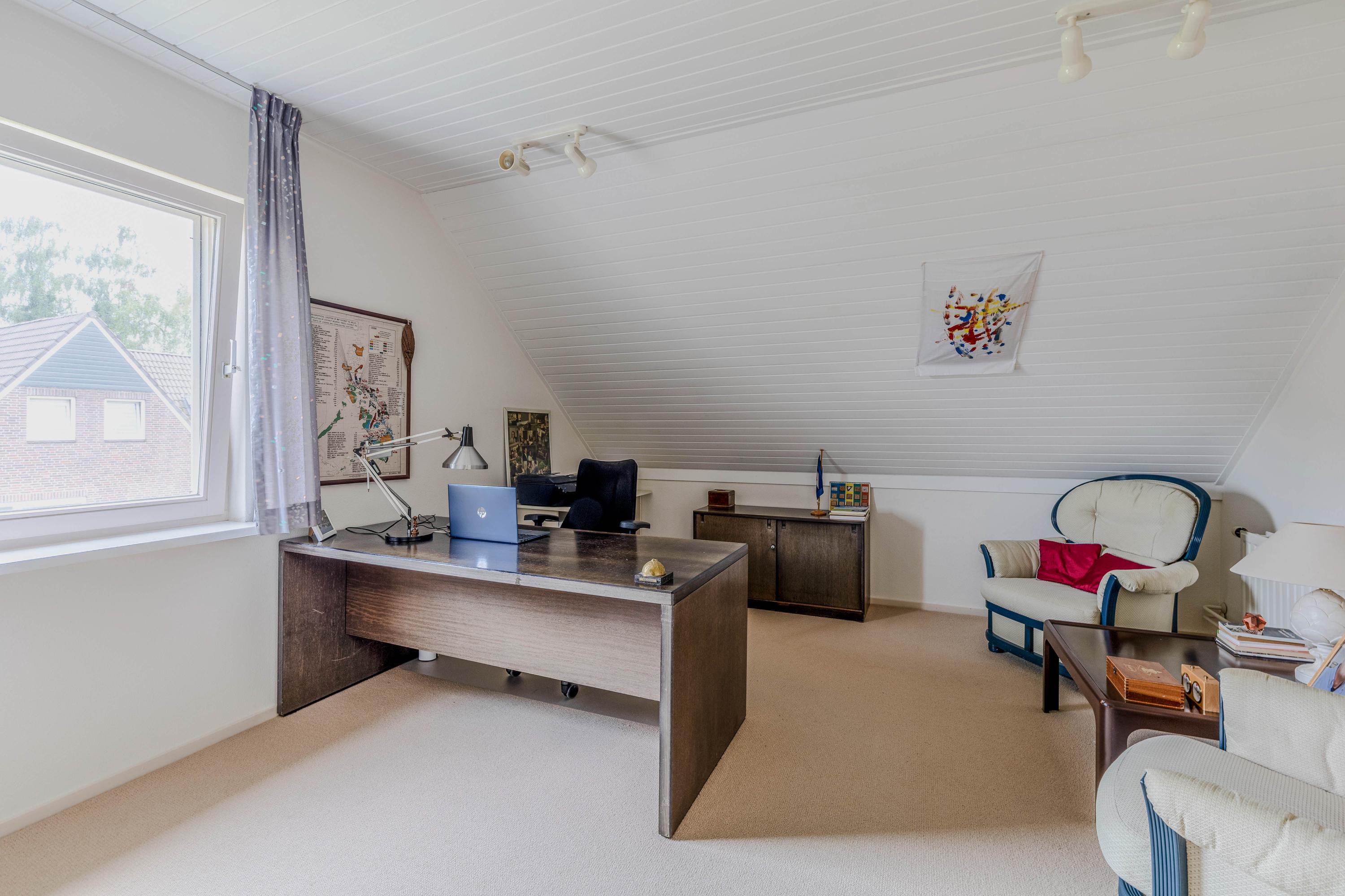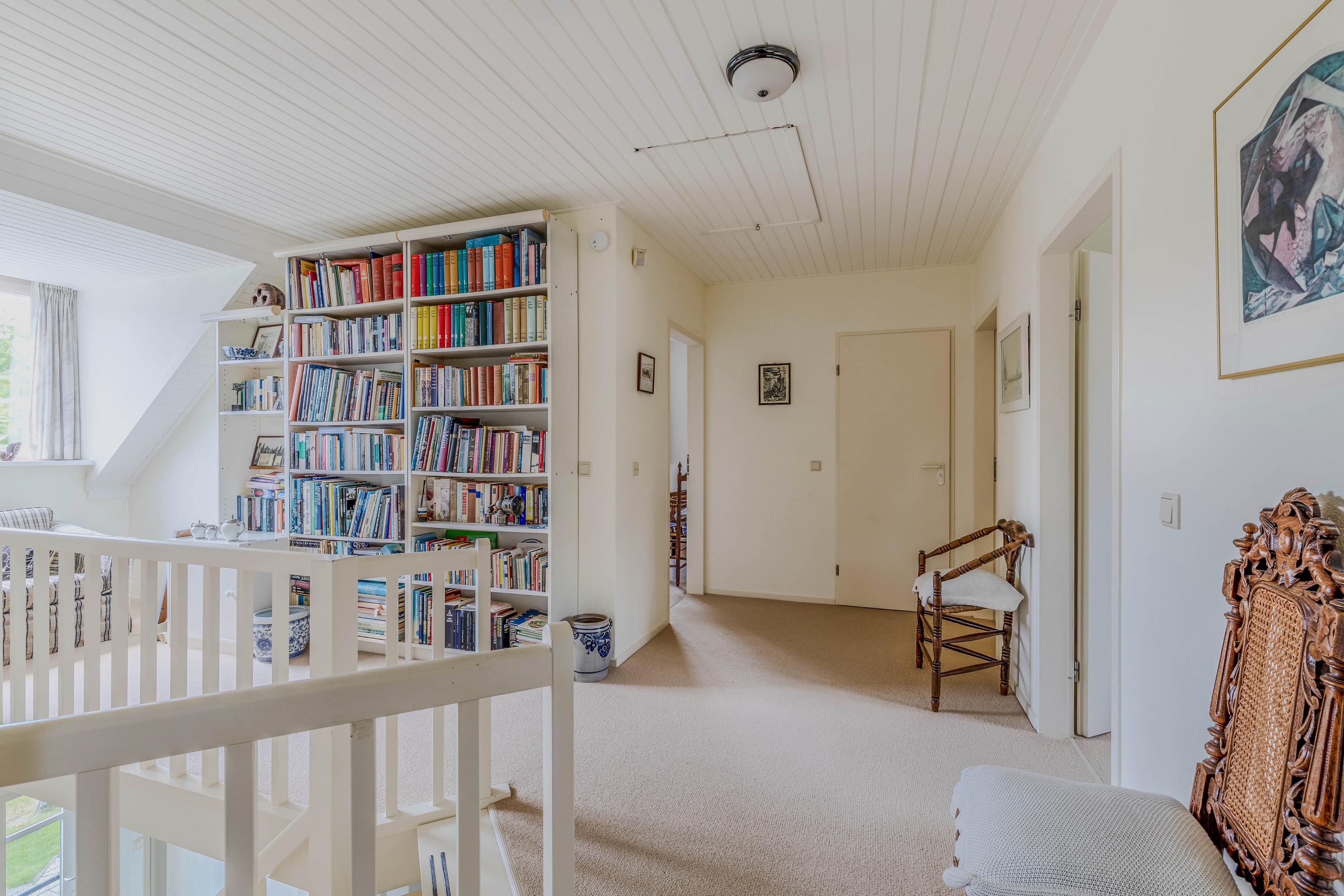 二层布局包括五间卧室与第二间浴室,其中一间卧室可通往未来的康养空间,另一间连接阳台。地下室、阁楼及21 m²带加热功能的分段门车库(花园直通)提供灵活储物与多样功能。户外,成熟林木与精致绿篱环绕多处休憩区,营造静谧绿洲,适合安宁家庭生活或户外聚会。